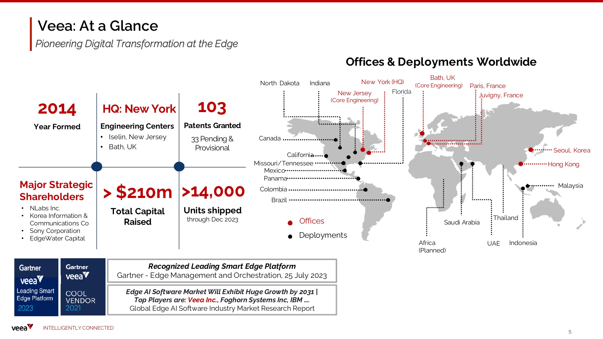 Ve e a: At a Glance P i o n ee r i n g D i g it al T r a n s f o r mat io n a t t he E d g e 2014 Ye a r F o rme d > $ 2 1 0 m Total Capital Raised 103 P a t en t s G r a n t e d 3 3 P e n d i n g & Provisional Major S t r a t egic Shareholders • NLabs Inc. • Korea Information & Communications Co • Sony Corporation • EdgeWater Capital H Q : N e w Y o r k E n g i n eer i n g C en t er s • Ise l in , New Je r s ey • B ath, U K >14,000 U n its s h ipped through Dec 2023 N e w Y o r k ( H Q ) I n d i a n a North Dakota Panama Colombia Brazil J uv i g n y , F r a n c e S a u d i A r a b i a Mexico Canada I n d o n e sia UAE Californi a Missouri/Tennessee Offices D e p l o y m e n t s Offices & Deployments Worldwide B a t h , U K ( C o r e E n g i nee r i n g ) Recognized Leading Smart Edge Platform Gartner - Edge Management and Orchestration, 25 July 2023 Edge AI Software Market Will Exhibit Huge Growth by 2031 | Top Players are: Veea Inc. , Foghorn Systems Inc, IBM …. Global Edge AI Software Industry Market Research Report N e w J e r s e y ( C o r e E n g i nee r i n g ) F l o r i d a T h a il a n d Malay s ia P a r i s , F r a n c e Se o u l , K o re a H o n g K o n g I N TE LLI G E N T L Y C O NN EC T E D 5 Africa ( P l a n n e d )