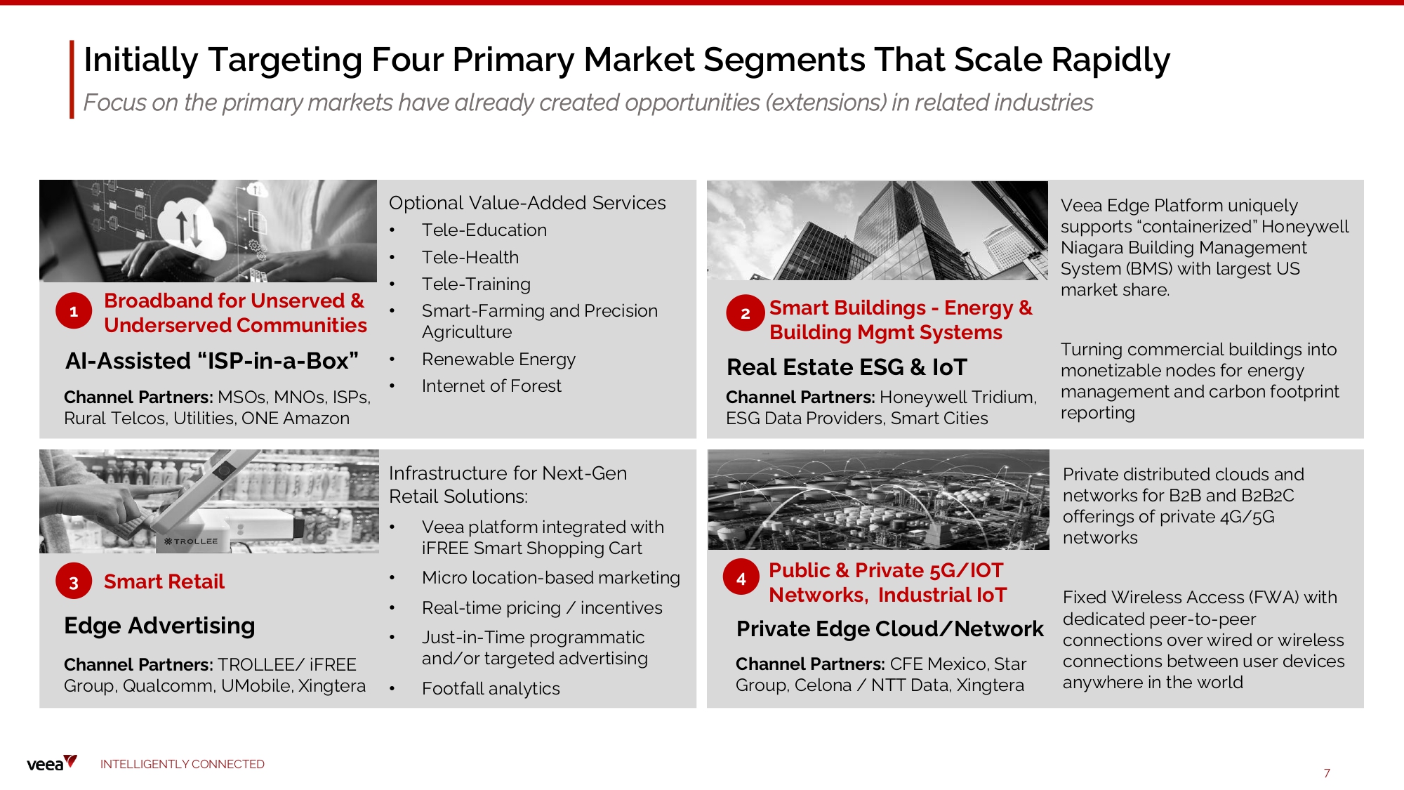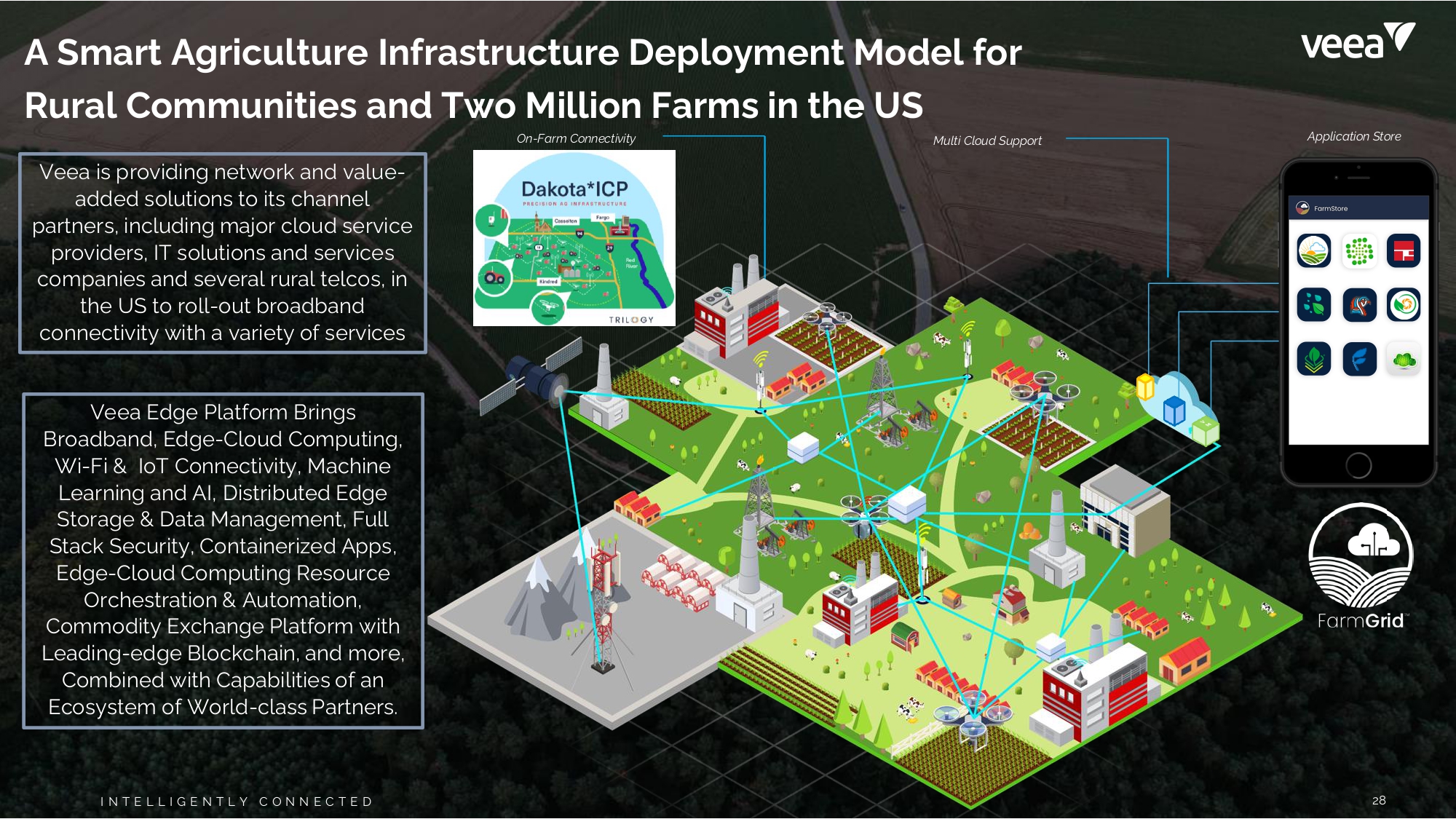 O n - F arm C o nn ect i vit y M ul t i Cl o ud Su pp o rt App l i c at i o n St o re Veea is providing network and value - added solutions to its channel partners, including major cloud service provid ers , IT s o l u ti o ns and s ervi ces companies and several rural telcos, in the US to roll - out broadband connectivity with a variety of services Veea Edge Platform Brings Broadband, Edge - Cloud Computing, Wi - Fi & IoT Connectivity, Machine Learni ng and AI, D i s tribu ted Edge Storage & D a ta M anage m e nt , F u ll Stack Security, Containerized Apps, Edge - Cloud Computing Resource Orc h e s tration & Au to m at i o n, Commodity Exchange Platform with Lead i n g - e dge Bl o ckcha i n, and m o re, Co m bine d wi th Capabil i ti e s o f a n E c o s y s tem o f Worl d - cla ss Pa rt n ers . A Smart Agriculture Infrastructure Deployment Model for Rural C o m m unities and Two Mi l lio n Far m s in the US 27 Veea Inc. Confidential & Proprietary I N T E L L I G E N T L Y C O N N E C T E D 28 I N T E L L I G E N T L Y C O N N E C T E D