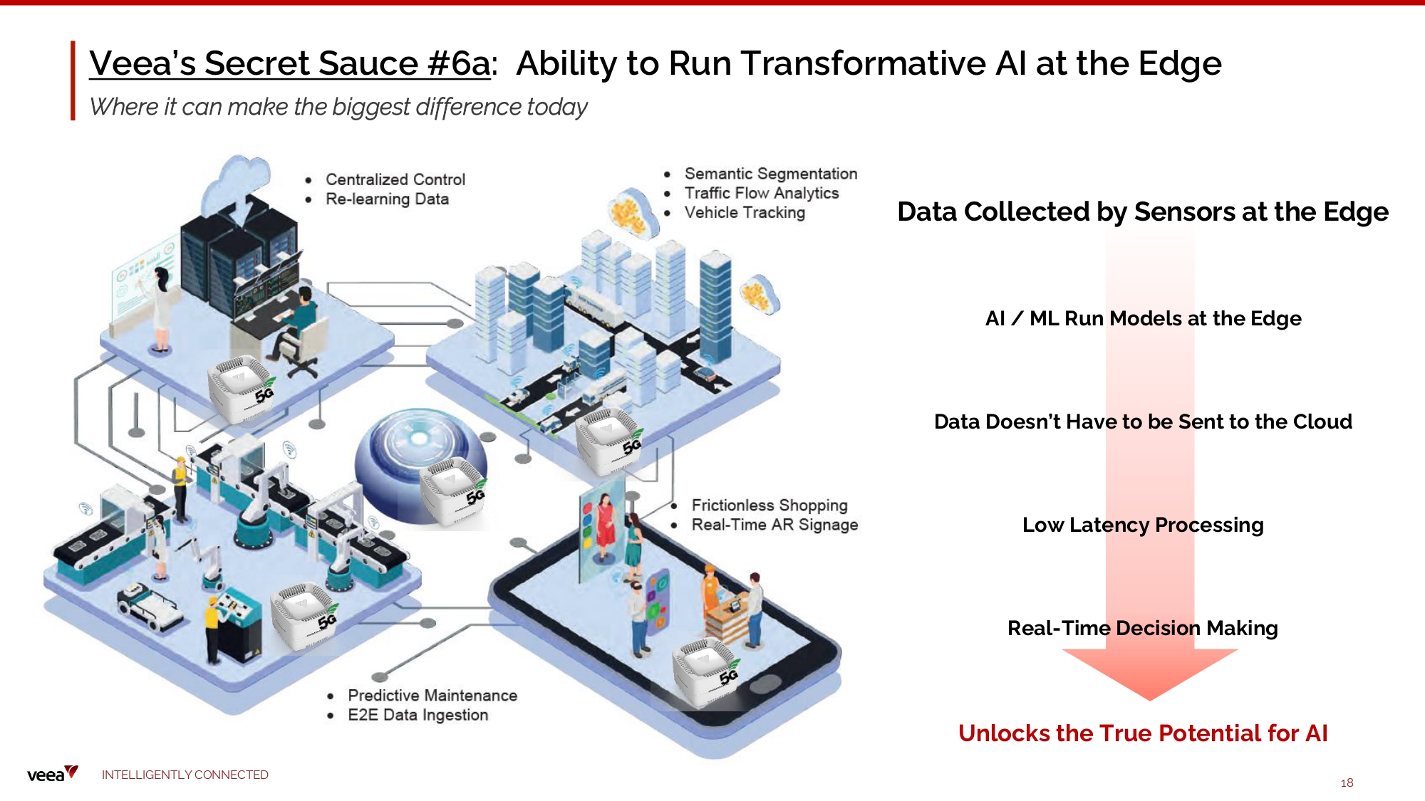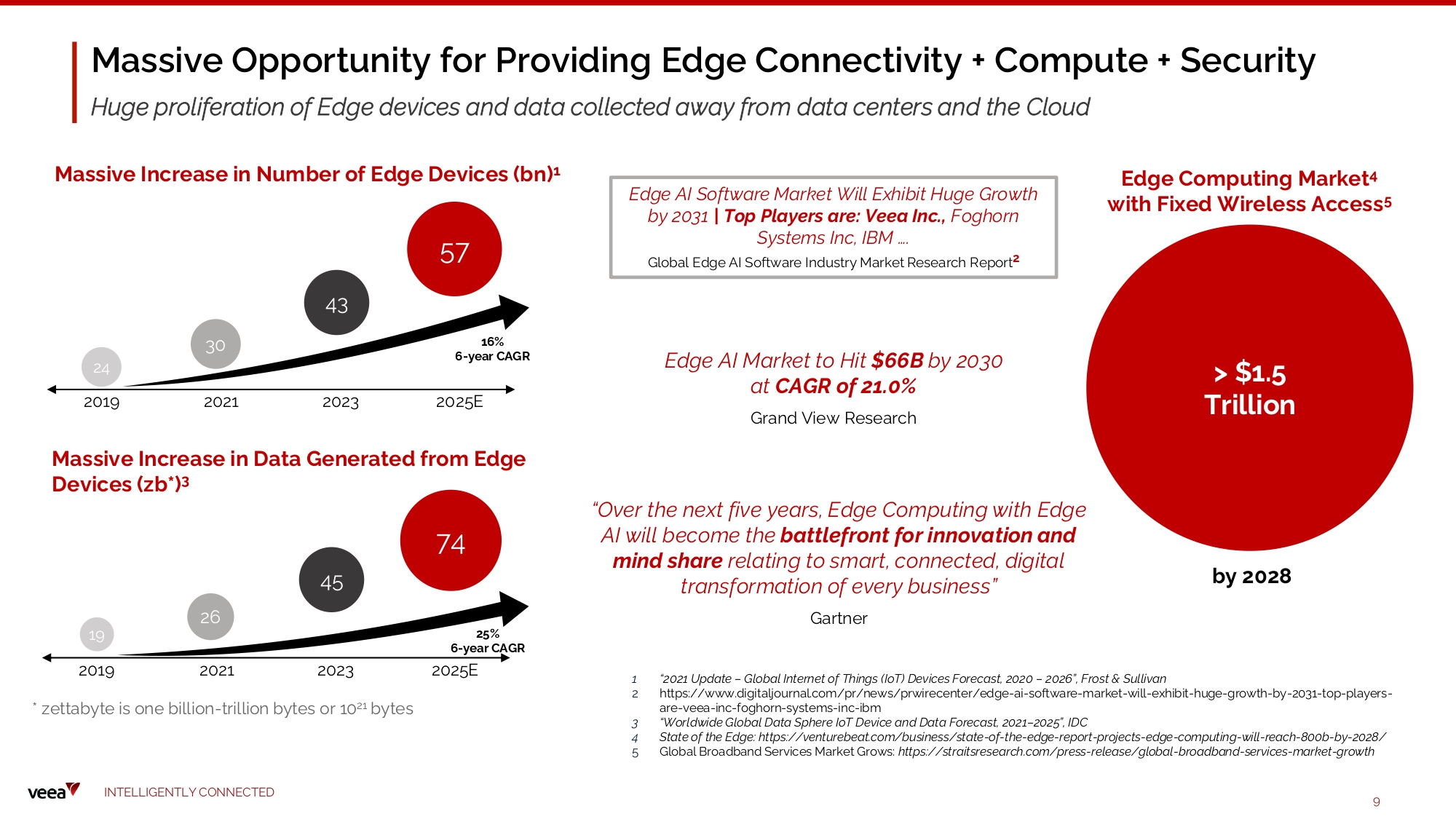 Massive Opportunity for Providing Edge Connectivity + Compute + Security Huge proliferation of Edge devices and data collected away from data centers and the Cloud Massive Increase in Number of Edge Devices (bn) 1 Massive Increase in Data Generated from Edge Devices (zb*) 3 30 24 20 1 9 2021 2023 202 5 E 16% 6 - ye a r CAGR 57 43 25% 6 - ye a r CAGR 2025E 74 45 26 19 20 1 9 2021 2023 1 “2021 Update – Global Internet of Things (IoT) Devices Forecast, 2020 – 2026”, Frost & Sullivan 2 https:// www.digitaljournal.com/pr/news/prwirecenter/edge - ai - software - market - will - exhibit - huge - growth - by - 2031 - top - players - are - veea - inc - foghorn - systems - inc - ibm 3 “ W o rl dw i de Gl o b al D at a Sph e r e I o T D ev i c e a n d D at a F o reca s t , 2 0 2 1 – 2 0 2 5 ” , I D C 4 State of the Edge: https://venturebeat.com/business/state - of - the - edge - report - projects - edge - computing - will - reach - 800b - by - 2028/ 5 Global Broadband Services Market Grows: https://straitsresearch.com/press - release/global - broadband - services - market - growth Ed g e AI M arket t o H it $ 66 B b y 2030 at C A G R o f 21. 0 % Gr a n d V iew Re s ea r c h “Over the next five years, Edge Computing with Edge AI will be c ome the b at t l e f r o nt f o r i nno v at i o n and m i nd sha r e rel at ing to sm art, c o n n e c t e d, digit al t ra n s f or m at i o n of e v e ry bus ines s ” Gartner E d ge C om p uting M a r ke t 4 with Fixed Wir e less A cces s 5 > $1.5 T ril l ion I N TE LLI G E N T L Y C O NN EC T E D 9 by 2028 Edge AI S o ftwa re Mark e t W i l l E x hi b it Huge G r o w th by 2031 | Top Players are: Veea Inc., Foghorn S y ste ms I nc , I BM …. Global Edge AI Software Industry Market Research Report 2 * zettabyte is one billion - trillion bytes or 10 21 bytes