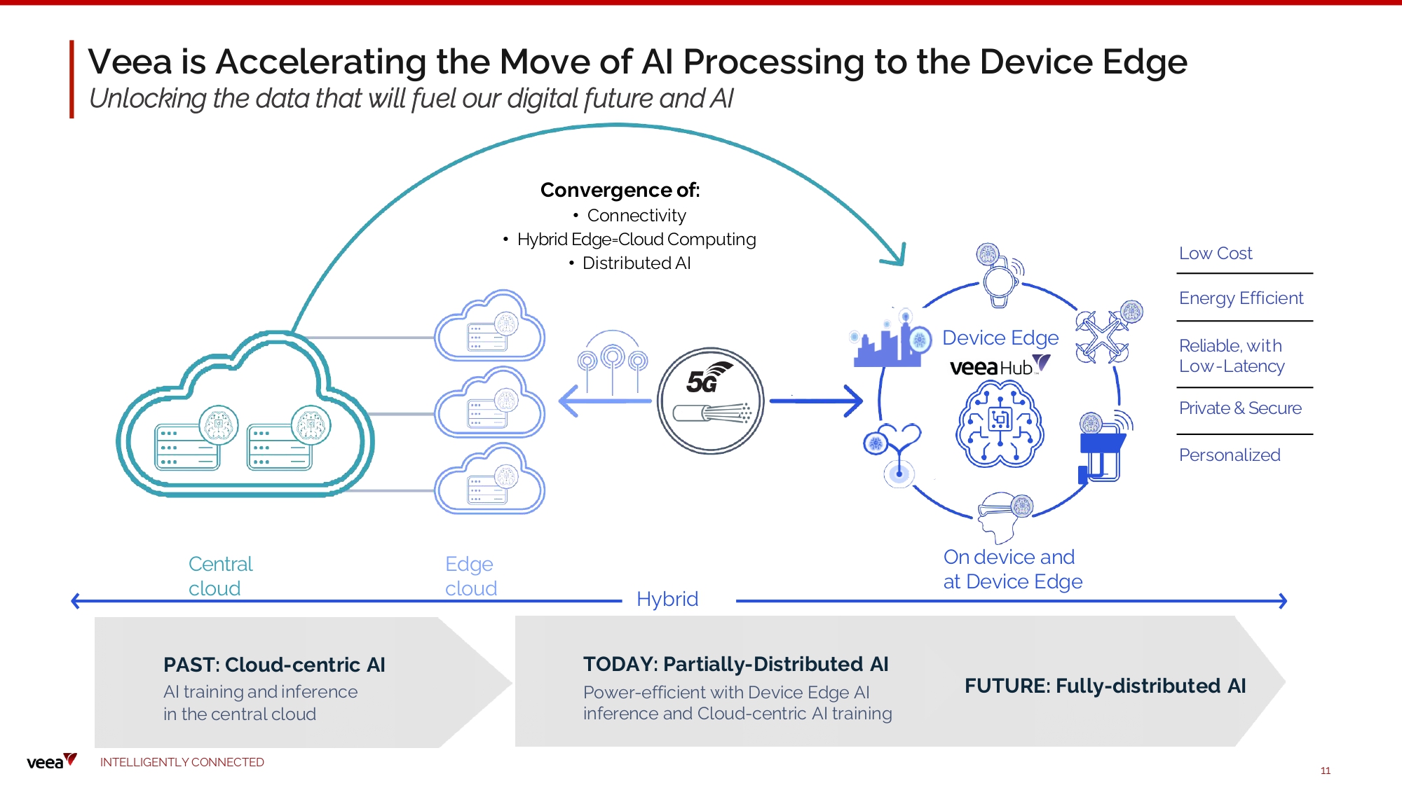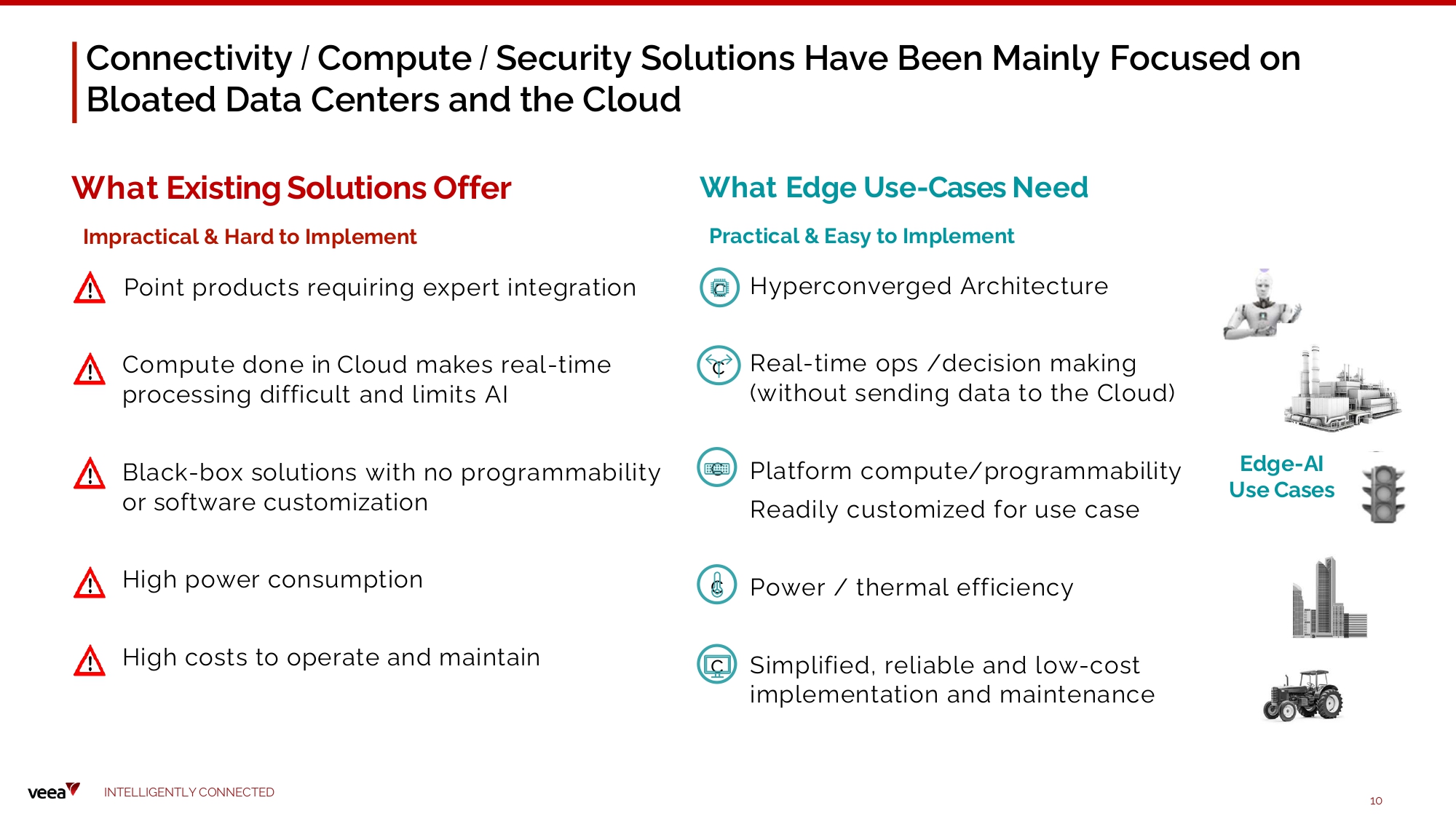 Connectivity / Compute / Security Solutions Have Been Mainly Focused on Bloated Data Centers and the Cloud Edge - AI Use C a s e s W h a t E x i s t i n g S o l u t i o n s O ff e r I mp r actical & Ha r d to I mplement Point products requiring expert integration Compute done in Cloud makes real - time processing difficult and limits AI Black - box solutions with no programmability or software customization High power consumption High costs to operate and maintain Platform compute/programmability Readily customized for use case Power / thermal efficiency c Simplified, reliable and low - cost implementation and maintenance c c c c W h a t Edge U s e - C a s e s N ee d Practical & E a sy to I mplement Hyperconverged Architecture Real - time ops /decision making (without sending data to the Cloud) I N TE LLI G E N T L Y C O NN EC T E D 10