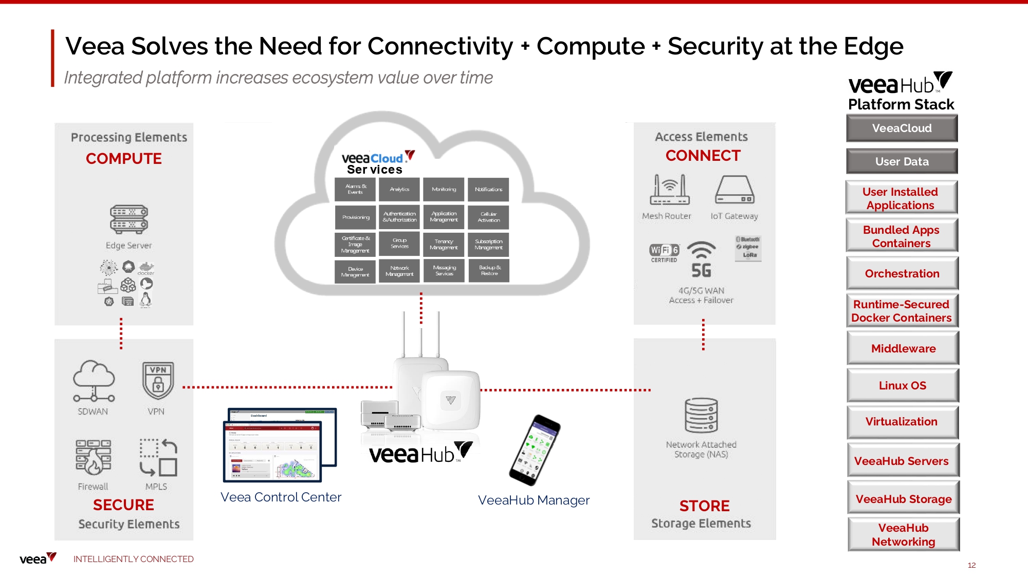 Veea is Accelerating the Move of AI Processing to the Device Edge Unlocking the data that will fuel our digital future and AI C e n t r a l cloud Edge c l o u d O n d e v i c e a n d a t D e v i c e E d g e H y brid AI D e v i c e E d g e C onv e r g e nce o f : • Connectivity • H y b r i d E d g e = C l o u d C o m p u t i n g • D ist rib u t e d AI PA ST: Clou d - centric AI AI t ra ining a n d infere n ce in t h e ce n t ra l c l o u d FUTURE: F u ll y - d is trib u ted AI T O D A Y: Pa rtiall y - D is trib u ted AI Power - efficient with Device Edge AI inference and Cloud - centric AI training L o w C o s t E n e r g y E ff i c i e n t R e l i a b l e , w i t h L ow - L a t e n c y P r i v at e & S e c u r e Personalized I N TE LLI G E N T L Y C O NN EC T E D 11