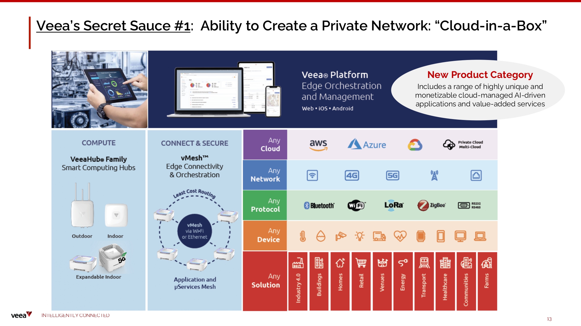 Veea Solves the Need for Connectivity + Compute + Security at the Edge C o n ta i n e r i zat i o n Ve e a C o n t ro l C e n t e r Ve e a Hub M a n a ge r S e r v ic e s C O MPUTE SECU R E C O N N ECT ST OR E Integrated platform increases ecosystem value over time Plat f orm St ack VeeaHub Net wor k i ng V ee a H u b St o ra ge U s e r In s t a ll e d Applications Bu n dl e d App s Containers Orchestration Runtime - Secured D o c ker C o nt a i ners Middleware Linux OS V i rtual i z a tio n V ee a H u b Se r v e rs U s e r Da ta VeeaCloud I N TE LLI G E N T L Y C O NN EC T E D 12