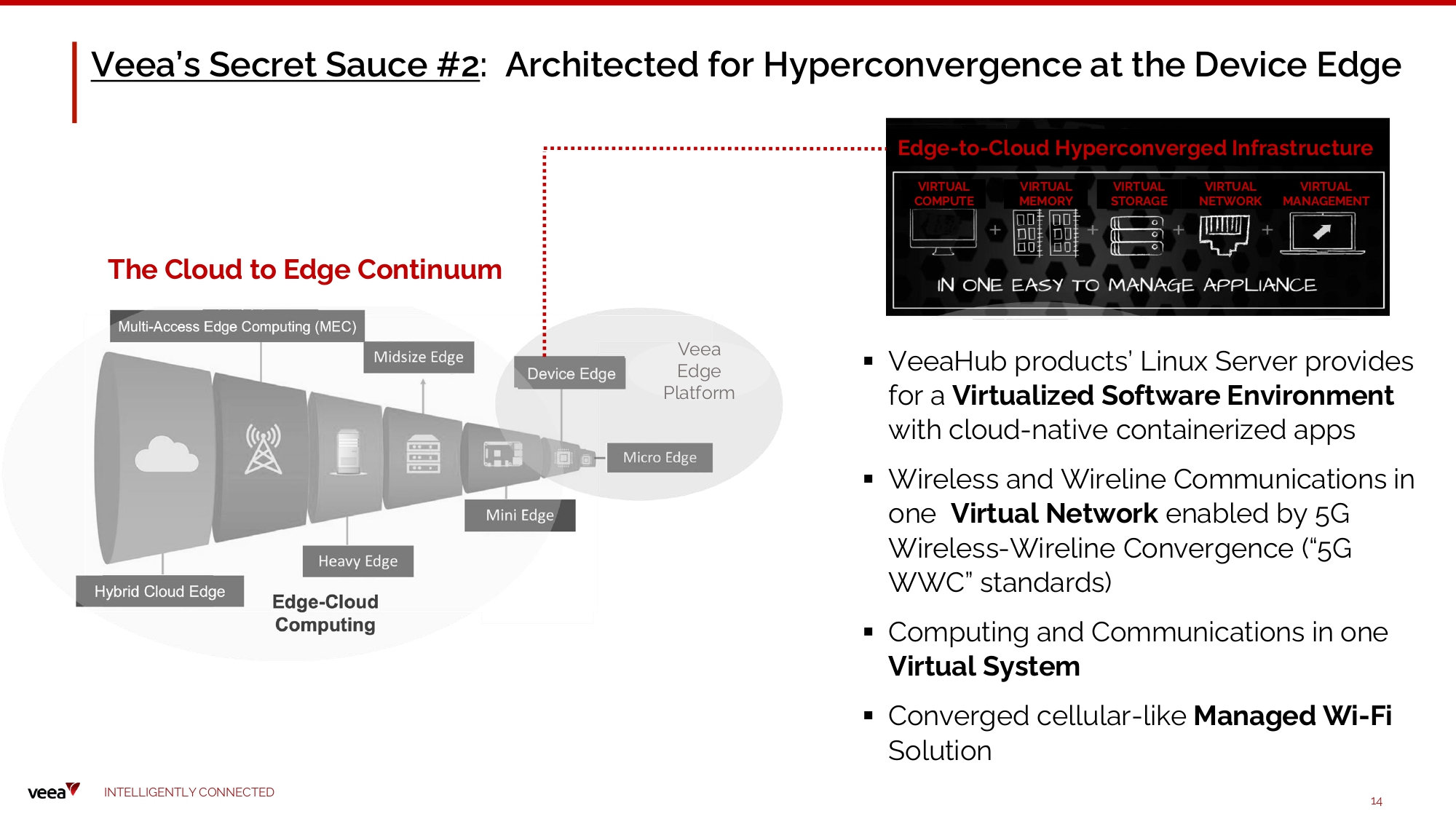 Veea’s Secret Sauce #1 : Ability to Create a Private Network: “Cloud - in - a - Box” New Product Category Includes a range of highly unique and m o n e t iza b le clo u d - m a n a ge d A I - dri v e n a pp lica t i o n s a n d v a l u e - a d d e d s e r v ic e s I N TE LLI G E N T L Y C O NN EC T E D 13