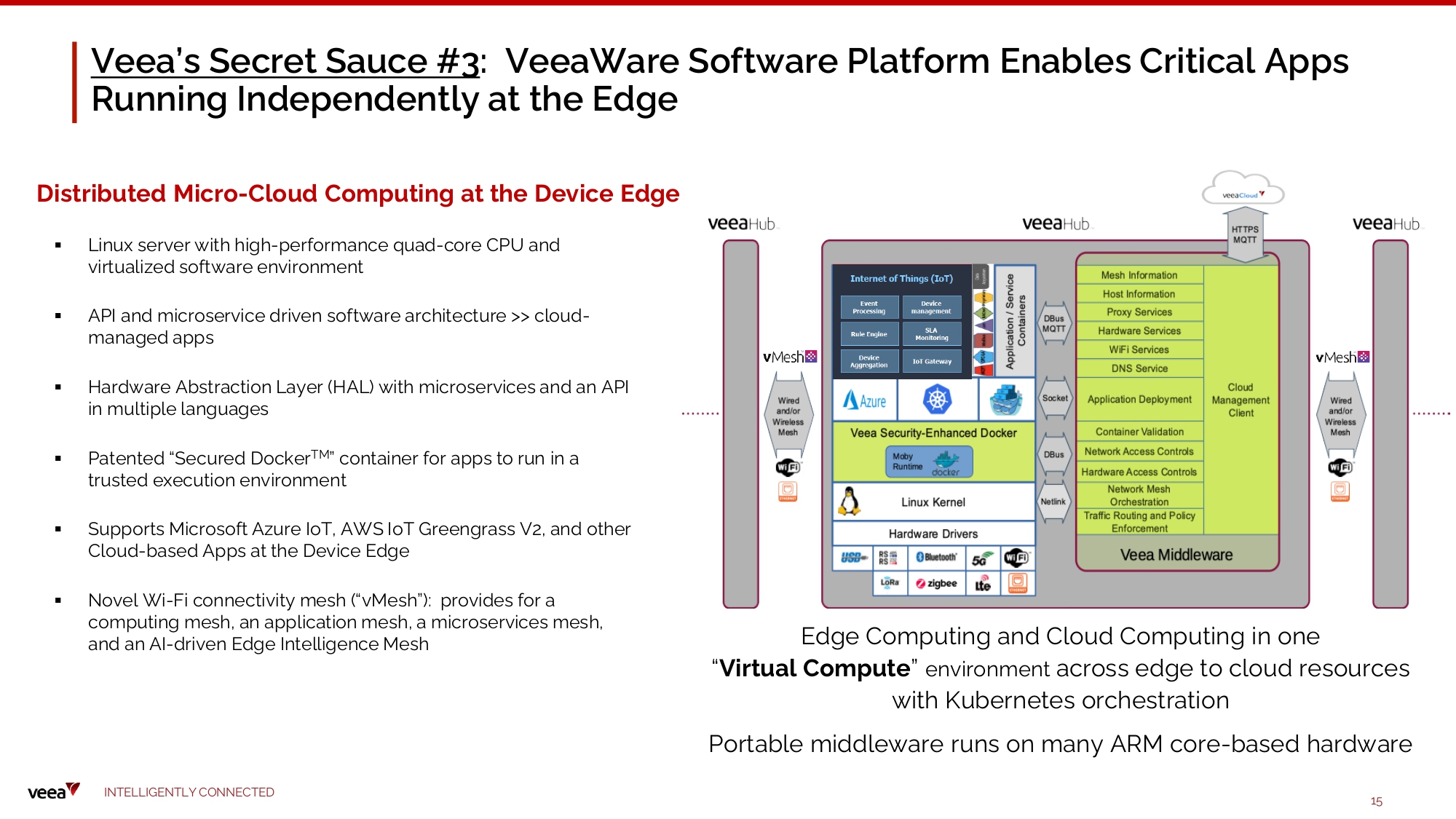 Veea’s Secret Sauce #2 : Architected for Hyperconvergence at the Device Edge E d g e - to - Clou d H y pe r con v e rged I nfr a struct u re VIRTUAL CO MP U T E VIRTUAL M E MO R Y VIRTUAL ST O R A G E VIRTUAL VIRTUAL N E T W OR K MANAG E M ENT ▪ VeeaHub products’ Linux Server provides for a Virtualized Software Environment with cloud - native containerized apps ▪ Wireless and Wireline Communications in one Virtual Network enabled by 5G Wireless - Wireline Convergence (“5G WWC” standards) ▪ Computing and Communications in one Virtual System ▪ Converged cellular - like Managed Wi - Fi Solution The Cloud to Edge Continuum I N TE LLI G E N T L Y C O NN EC T E D 14 Veea Edge P l a t fo rm