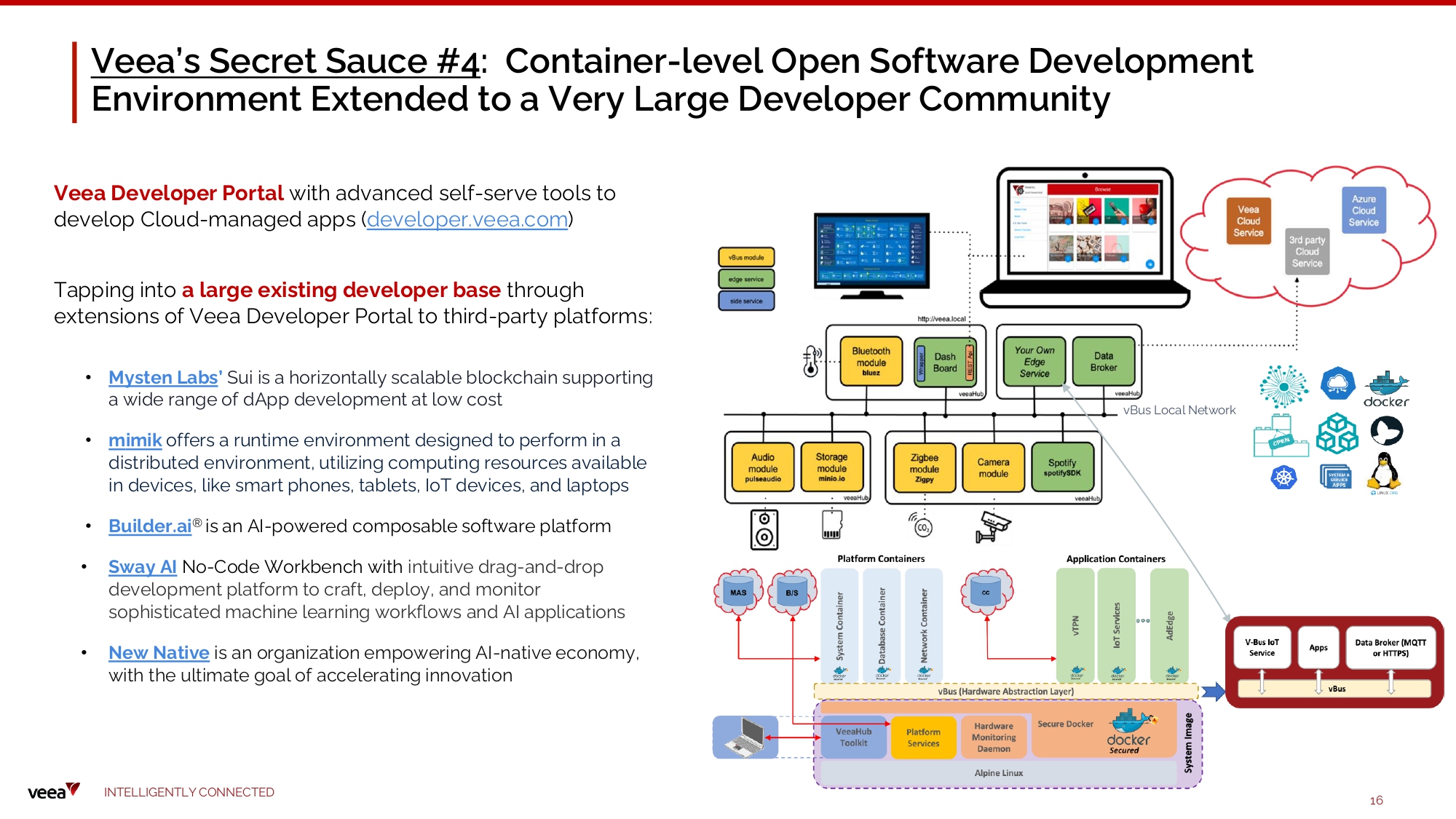 Veea’s Secret Sauce #3 : VeeaWare Software Platform Enables Critical Apps Running Independently at the Edge Distributed Micro - Cloud Computing at the Device Edge ▪ Linux server with high - performance quad - core CPU and virtualized software environment ▪ API and microservice driven software architecture >> cloud - m a n a ge d a pp s ▪ Hardware Abstraction Layer (HAL) with microservices and an API in multiple languages ▪ Patented “Secured Docker TM ” container for apps to run in a t r u s t e d e x e cuti o n e n v iro n me n t ▪ Supports Microsoft Azure IoT, AWS IoT Greengrass V2, and other C loud - b a s e d A pp s a t t h e D ev ice Edge ▪ Novel Wi - Fi connectivity mesh (“vMesh”): provides for a co mp u t ing mes h , a n a pp lica t i o n mes h , a microser v ice s mes h , and an AI - driven Edge Intelligence Mesh Edge Computing and Cloud Computing in one “ Virtual Compute ” environment across edge to cloud resources with Kubernetes orchestration Portable middleware runs on many ARM core - based hardware I N TE LLI G E N T L Y C O NN EC T E D 15