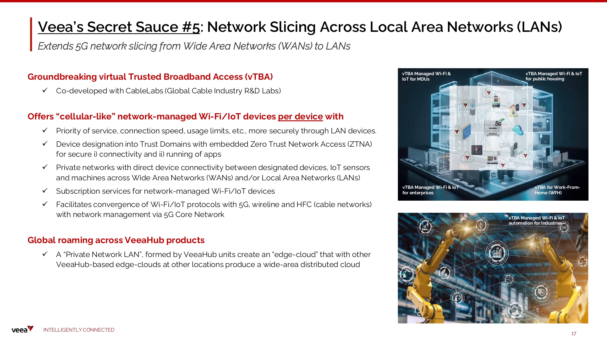 Veea’s Secret Sauce #5 : Network Slicing Across Local Area Networks (LANs) Extends 5G network slicing from Wide Area Networks (WANs) to LANs Groun d b r ea k in g vi r tu a l T r u sted B roa d band A ccess ( v T B A ) x Co - developed with CableLabs (Global Cable Industry R&D Labs) Offers “cellular - like” network - managed Wi - Fi/IoT devices per device with x Priority of service, connection speed, usage limits, etc., more securely through LAN devices. x Device designation into Trust Domains with embedded Zero Trust Network Access (ZTNA) fo r s e cu r e i ) c o nn e c t ivit y a n d ii ) r u nn ing o f a pp s x Private networks with direct device connectivity between designated devices, IoT sensors and machines across Wide Area Networks (WANs) and/or Local Area Networks (LANs) x Subscription services for network - managed Wi - Fi/IoT devices x Facilitates convergence of Wi - Fi/IoT protocols with 5G, wireline and HFC (cable networks) with network management via 5G Core Network Global r oamin g ac r oss Vee a H u b p r od ucts x A “Private Network LAN”, formed by VeeaHub units create an “edge - cloud” that with other VeeaHub - based edge - clouds at other locations produce a wide - area distributed cloud vT B A M a n a g e d W i - F i & IoT for MDUs I N TE LLI G E N T L Y C O NN EC T E D 17 vT B A f or W o r k - F r o m - Home (WFH) vT B A M a n a g e d W i - F i & I oT automation for Industries vT B A M a n a g e d W i - F i & I oT for enterprises vT B A M a n a g e d W i - F i & I oT for public housing
