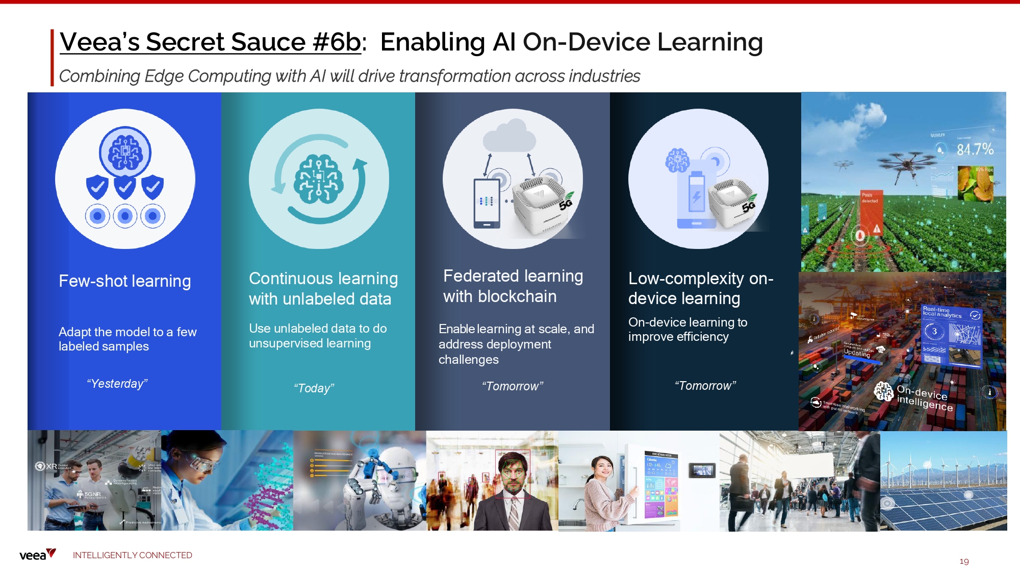 Veea’s Secret Sauce #6b : Enabling AI On - Device Learning Combining Edge Computing with AI will drive transformation across industries Few - shot learning Adapt the model to a few labeled s a m ple s Continuous learning I N TE LLI G E N T L Y C O NN EC T E D 19 with unlabeled data Use unlabeled data to do un s upe r v i s ed lea r nin g Ena bl e lea r nin g at sc a l e , and address deployment c hallenge s Federated learning with blockchain Low - complexity on - device learning On - device l e arning t o improve effi c ien c y “ Y esterd a y” “Today” “T o mor r o w ” “T o mor r o w ”