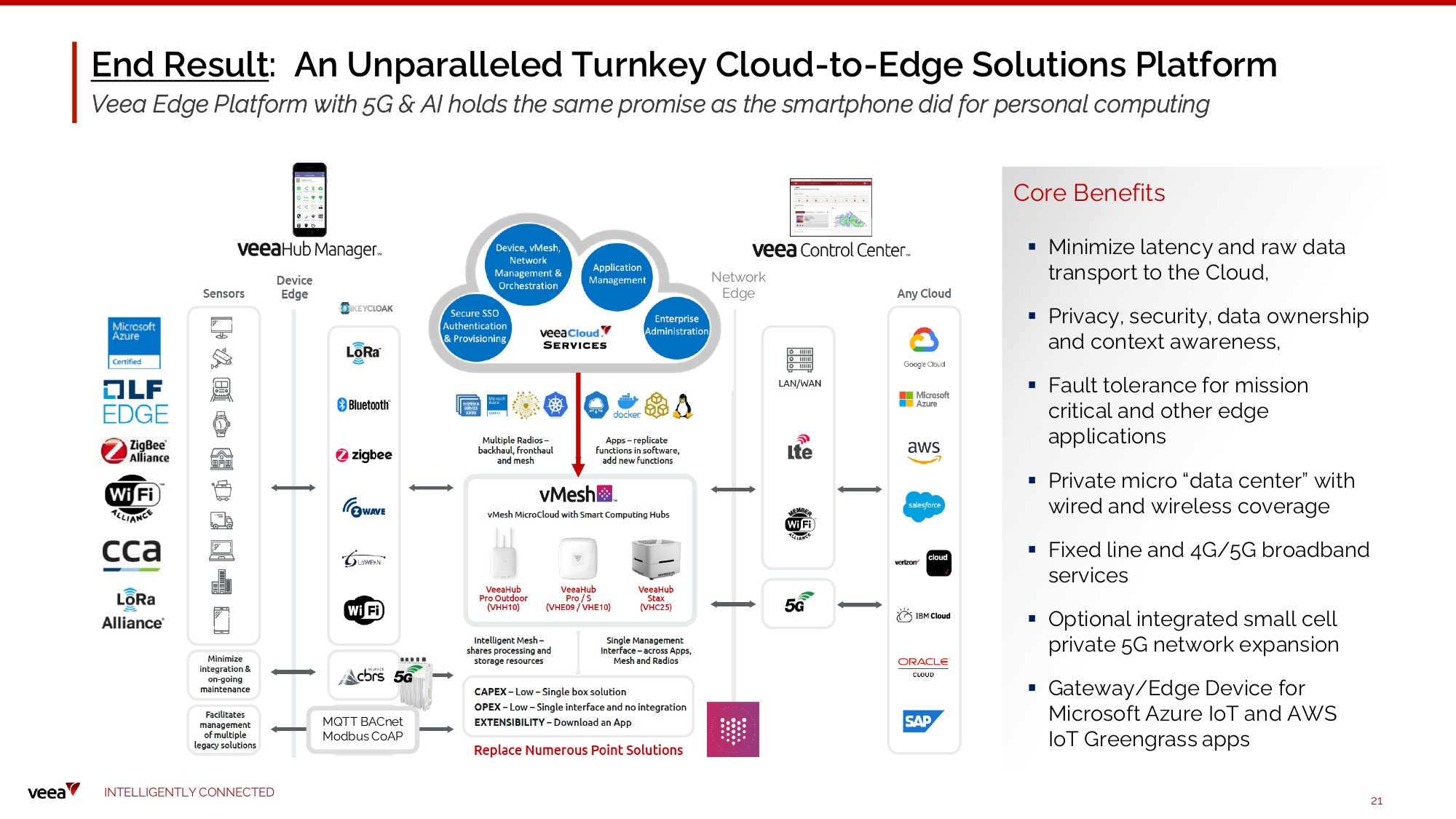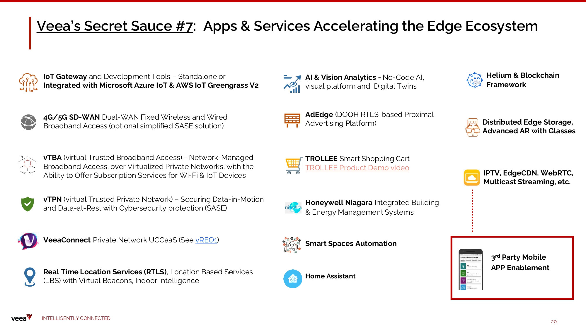 Veea’s Secret Sauce #7 : Apps & Services Accelerating the Edge Ecosystem 3 rd Party Mobile A P P E n a b lement I o T G a t eway a n d D eve lo p me n t To o ls – S t a n da lone o r Integrated with Microsoft Azure IoT & AWS IoT Greengrass V2 I N TE LLI G E N T L Y C O NN EC T E D 20 4G /5G SD - W AN D u a l - W A N Fix e d W ire less a n d W ire d Broadband Access (optional simplified SASE solution) vTBA (virtual Trusted Broadband Access) - Network - Managed Broadband Access, over Virtualized Private Networks, with the Ability to Offer Subscription Services for Wi - Fi & IoT Devices vTPN (virtual Trusted Private Network) – Securing Data - in - Motion and Data - at - Rest with Cybersecurity protection (SASE) VeeaConnect Private Network UCCaaS (See vREO1 ) Real Time Location Services (RTLS) , Location Based Services (LBS) with Virtual Beacons, Indoor Intelligence AI & V i s i o n A n a l y t i c s - N o - C o de A I, v isua l pla t fo rm a n d D igi t a l T w ins AdEdge (DOOH RTLS - based Proximal Advertising Platform) TR OL L EE Sma rt Shop pi n g C a rt TROLLEE Product Demo video H o n eywe ll N i a g a ra Int e gr a t e d B u ilding & Energy M a n a gem e n t S y s t e ms S m a rt S p a c es Au t o m a t i o n H o m e As s i s t a n t I PT V , Ed g eC D N , W e b R TC , M u l t i c a st S t re ami n g , et c . D i s t r i b uted Ed g e S t o ra g e, Ad v a n c ed AR w i t h G l a ss es H el i um & Bloc kc h a i n Framework