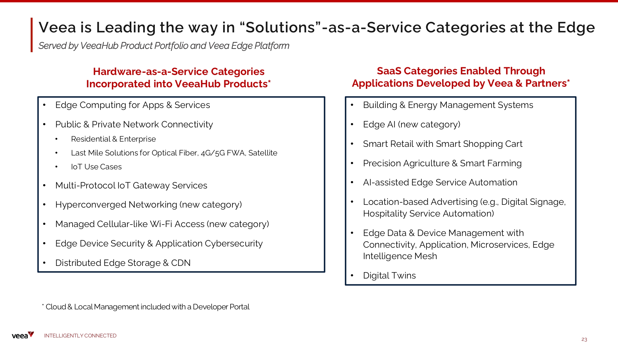Veea is Leading the way in “Solutions” - as - a - Service Categories at the Edge I N TE LLI G E N T L Y C O NN EC T E D 23 Served by VeeaHub Product Portfolio and Veea Edge Platform Hardware - as - a - Service Categories Incorporated into VeeaHub Products* • Edge Co m put i ng f o r Ap p s & Servi ces • Public & Private Network Connectivity • Re s ide n t i a l & Ent e rpri s e • Last Mile Solutions for Optical Fiber, 4G/5G FWA, Satellite • I o T U s e C a s e s • M u lt i - Pr o tocol Io T G ate way Servi ces • H y percon v erged Networki ng ( new catego r y ) • Managed Cellular - like Wi - Fi Access (new category) • Edge Device Security & Application Cybersecurity • D i s trib u ted Edge Storage & CD N SaaS Categories Enabled Through Applications Developed by Veea & Partners* • Bu i ld i ng & Ener g y M anage m e nt S y s te m s • Edge AI (new category) • Smart Retail with Smart Shopping Cart • Preci s i on A g ricu lture & Smart Farm i ng • AI - assisted Edge Service Automation • Locati o n - ba s ed Advertis i ng ( e.g., D i gital Si gn age, Hospitality Service Automation) • Edge D ata & D evi ce M anage m e n t wi th C on n ec t i v i t y , A p plicatio n, M i c r ose r v i c e s , E dge Intelligence Mesh • D i gital T wi ns * Cloud & Local Management included with a Developer Portal
