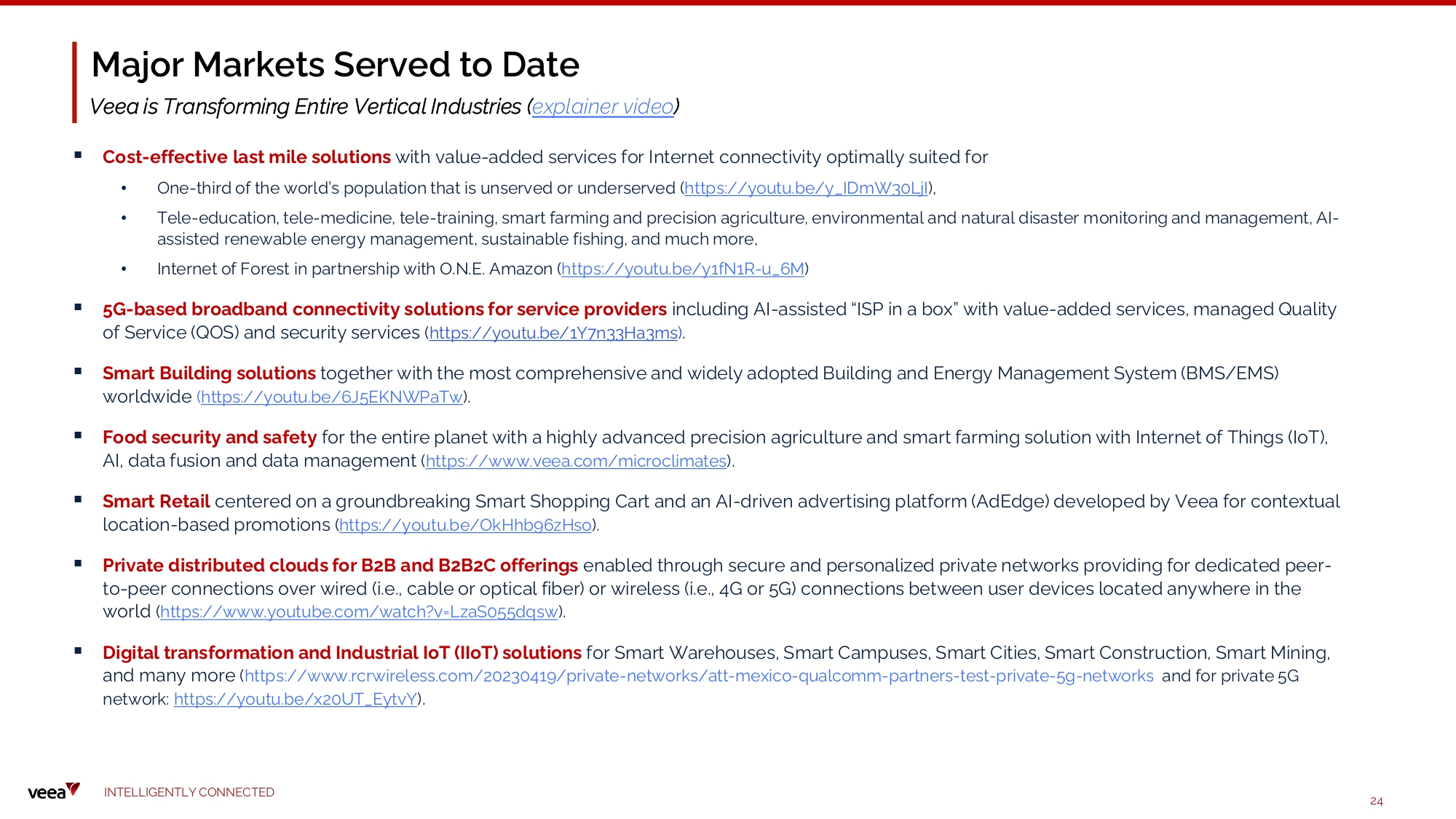 Major Markets Served to Date I N TE LLI G E N T L Y C O NN EC T E D 24 V ee a i s T r ansfo rming E n ti r e V e r t i cal I n dust r i e s ( e x plai n e r v i d e o ) ▪ Cost - effective last mile solutions with value - added services for Internet connectivity optimally suited for • One - third of the world’s population that is unserved or underserved ( https://youtu.be/y_IDmW30LjI ), • Tele - education, tele - medicine, tele - training, smart farming and precision agriculture, environmental and natural disaster monitoring and management, AI - assisted renewable energy management, sustainable fishing, and much more, • Internet of Forest in partnership with O.N.E. Amazon ( https://youtu.be/y1fN1R - u_6M ) ▪ 5G - based broadband connectivity solutions for service providers including AI - assisted “ISP in a box” with value - added services, managed Quality of Service (QOS) and security services ( https://youtu.be/1Y7n33Ha3ms ) . ▪ Smart Building solutions together with the most comprehensive and widely adopted Building and Energy Management System (BMS/EMS) worldwide ( https://youtu.be/6J5EKNWPaTw ) . ▪ Food security and safety for the entire planet with a highly advanced precision agriculture and smart farming solution with Internet of Things (IoT), AI, data fusion and data management ( https://www.veea.com/microclimates ) . ▪ Smart Retail centered on a groundbreaking Smart Shopping Cart and an AI - driven advertising platform (AdEdge) developed by Veea for contextual location - based promotions ( https://youtu.be/OkHhb96zHso ) . ▪ Private distributed clouds for B2B and B2B2C offerings enabled through secure and personalized private networks providing for dedicated peer - to - peer connections over wired (i.e., cable or optical fiber) or wireless (i.e., 4G or 5G) connections between user devices located anywhere in the world ( https://www.youtube.com/watch?v=LzaS055dqsw ) . ▪ Digital transformation and Industrial IoT (IIoT) solutions for Smart Warehouses, Smart Campuses, Smart Cities, Smart Construction, Smart Mining, and many more ( https:// www.rcrwireless.com/20230419/private - networks/att - mexico - qualcomm - partners - test - private - 5g - networks and for private 5G network: https://youtu.be/x20UT_EytvY ) .