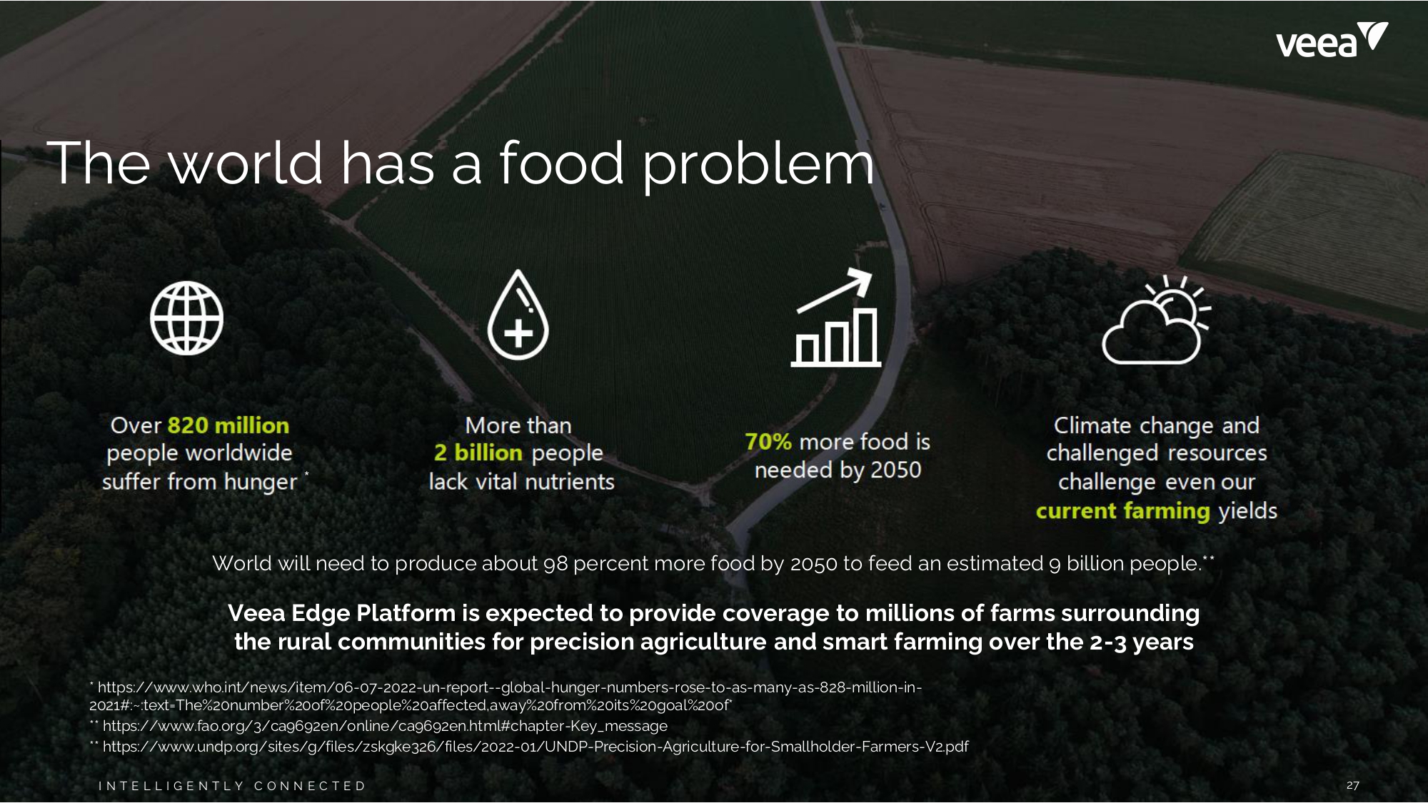 The world has a food problem 27 Veea Inc. Confidential & Proprietary I N T E L L I G E N T L Y C O N N E C T E D 27 I N T E L L I G E N T L Y C O N N E C T E D * World will need to produce about 98 percent more food by 2050 to feed an estimated 9 billion people.** Veea Edge Platform is expected to provide coverage to millions of farms surrounding the rural communities for precision agriculture and smart farming over the 2 - 3 years * https:// www.who.int/news/item/06 - 07 - 2022 - un - report -- global - hunger - numbers - rose - to - as - many - as - 828 - million - in - 2021#:~:text=The%20number%20of%20people%20affected,away%20from%20its%20goal%20of* ** h tt p s : / / www . f a o . o r g / 3 /c a96 9 2 en / o n l i n e /c a96 9 2 en . h t m l # c h a p ter - K e y _ m e ss a g e ** https:// www.undp.org/sites/g/files/zskgke326/files/2022 - 01/UNDP - Precision - Agriculture - for - Smallholder - Farmers - V2.pdf