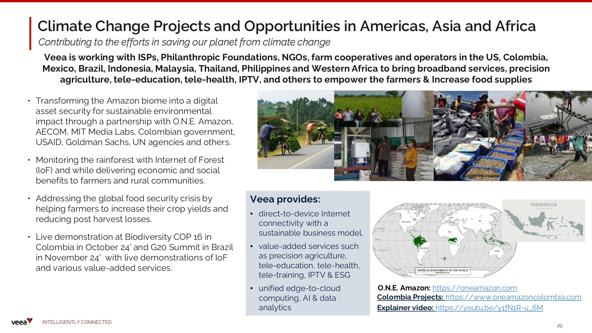 • Transforming the Amazon biome into a digital asset security for sustainable environmental impact through a partnership with O.N.E. Amazon, AE C OM , M IT M e d i a Labs, Col o m bi a n governm e nt , USAID, Goldman Sachs, UN agencies and others. • Mo nitori n g t h e rai nfo r e s t with In t ernet of Fore s t (IoF) and while delivering economic and social benefits to farmers and rural communities. • Add res s i ng the global f oo d s ec u ri ty cri s i s by helping farmers to increase their crop yields and red u cing po s t har v e s t l o ss e s . • Live de m onstratio n at Bi od i v ers i ty C OP 16 i n Col o m bia i n October 24’ and G20 Su mm i t i n Bra z i l in November 24’ with live demonstrations of IoF and various value - added services. Veea provides: • direct - to - device Internet connectivity with a sustainable business model, • value - added services such as precision agriculture, tele - education, tele - health, t e l e - tra i n i ng, IPTV & E S G • unified edge - to - cloud c o mputin g , AI & data analytics Climate Change Projects and Opportunities in Americas, Asia and Africa Contributing to the efforts in saving our planet from climate change Veea is working with ISPs, Philanthropic Foundations, NGOs, farm cooperatives and operators in the US, Colombia, Mexico, Brazil, Indonesia, Malaysia, Thailand, Philippines and Western Africa to bring broadband services, precision agriculture, tele - education, tele - health, IPTV, and others to empower the farmers & Increase food supplies O . N. E. Amazo n: h tt p s :/ / o n e a m a z on .c o m Colombia Projects: https://www.oneamazoncolombia.com Ex p l a i n e r vi d eo : h tt p s :/ / yo u t u .b e / y1fN1R - u _ 6 M I N TE LLI G E N T L Y C O NN EC T E D 29