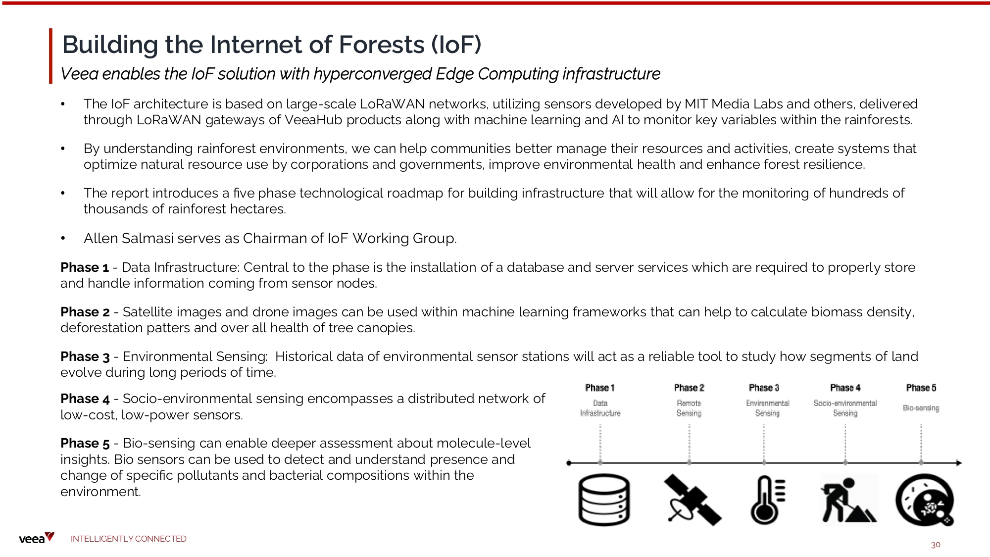 Building the Internet of Forests (IoF) Veea enables the IoF solution with hyperconverged Edge Computing infrastructure • The IoF architecture is based on large - scale LoRaWAN networks, utilizing sensors developed by MIT Media Labs and others, delivered through LoRaWAN gateways of VeeaHub products along with machine learning and AI to monitor key variables within the rainforests. • By understanding rainforest environments, we can help communities better manage their resources and activities, create systems that optimize natural resource use by corporations and governments, improve environmental health and enhance forest resilience. • The report introduces a five phase technological roadmap for building infrastructure that will allow for the monitoring of hundreds of thousands of rainforest hectares. • Allen Salmasi serves as Chairman of IoF Working Group . Phase 1 - Data Infrastructure: Central to the phase is the installation of a database and server services which are required to properly store and handle information coming from sensor nodes. Phase 2 - Satellite images and drone images can be used within machine learning frameworks that can help to calculate biomass density, deforestation patters and over all health of tree canopies. Phase 3 - Environmental Sensing: Historical data of environmental sensor stations will act as a reliable tool to study how segments of land evolve during long periods of time. Phase 4 - Socio - environmental sensing encompasses a distributed network of low - cost, low - power sensors. Phase 5 - Bio - sensing can enable deeper assessment about molecule - level insights. Bio sensors can be used to detect and understand presence and change of specific pollutants and bacterial compositions within the environment. I N TE LLI G E N T L Y C O NN EC T E D 30