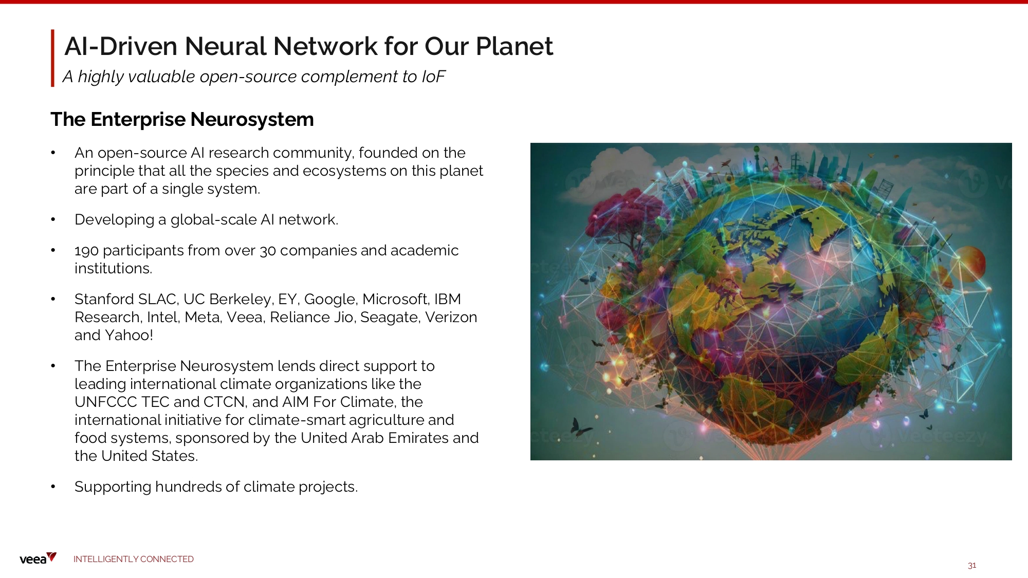 AI - Driven Neural Network for Our Planet A highly valuable open - source complement to IoF The Enterprise Neurosystem • An open - source AI research community, founded on the principle that all the species and ecosystems on this planet are part of a single system. • D e v el o ping a globa l - s c a l e AI network. • 190 participants from over 30 companies and academic institutions. • Stanford SLAC, UC Berkeley, EY, Google, Microsoft, IBM Research, Intel, Meta, Veea, Reliance Jio, Seagate, Verizon and Yahoo! • The Enterprise Neurosystem lends direct support to leading international climate organizations like the UNFCCC TEC and CTCN, and AIM For Climate, the international initiative for climate - smart agriculture and food systems, sponsored by the United Arab Emirates and the United States. • Supporting hundreds of climate projects. I N TE LLI G E N T L Y C O NN EC T E D 31