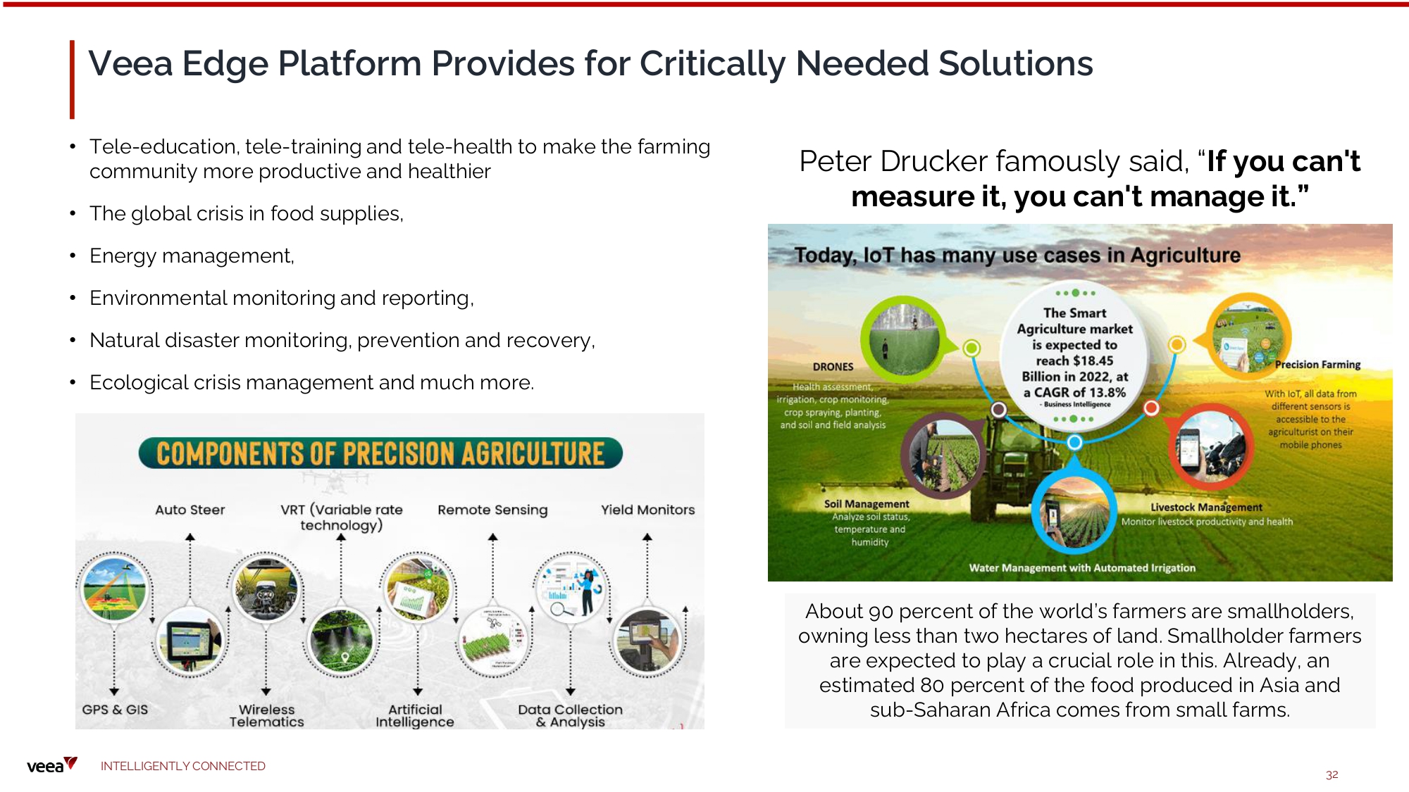 Veea Edge Platform Provides for Critically Needed Solutions • Tele - education, tele - training and tele - health to make the farming community more productive and healthier • T he global cri s i s i n f oo d s u p p l i es, • Energy management, • Environmental monitoring and reporting, • Natural disaster monitoring, prevention and recovery, • E c o l o gica l cri s i s m anage m ent and m uch m o re. About 90 percent of the world’s farmers are smallholders, owning less than two hectares of land. Smallholder farmers are ex pected to play a cruci al rol e i n t h i s . Alre a dy, an estimated 80 percent of the food produced in Asia and su b - Sahara n Af r i c a co m es f rom s m al l f ar m s . Peter D ruc k er fa m o u sly sa i d, “ If you can ' t m e a s ure it, you can't m anag e it . ” I N TE LLI G E N T L Y C O NN EC T E D 32