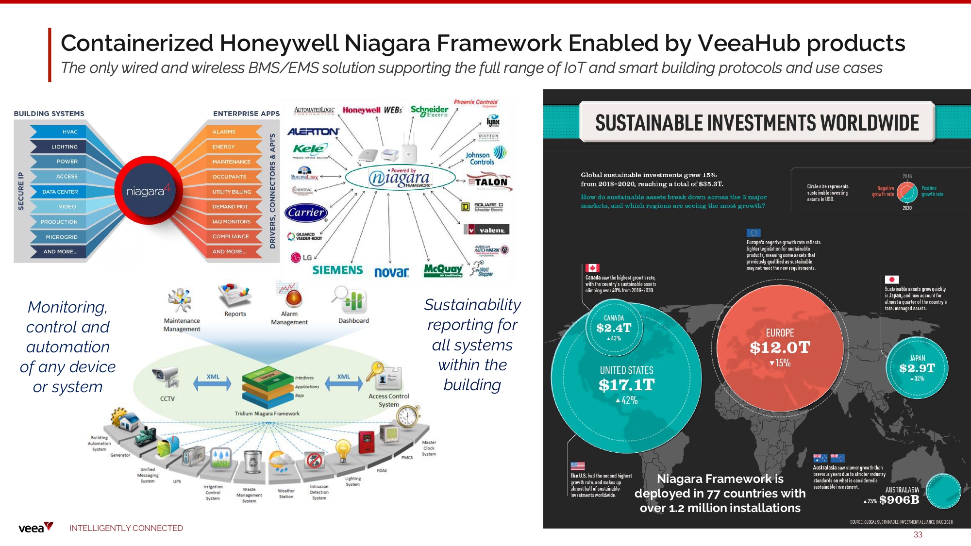 Containerized Honeywell Niagara Framework Enabled by VeeaHub products The only wired and wireless BMS/EMS solution supporting the full range of IoT and smart building protocols and use cases Monitoring, control and automation of any devi ce o r sy stem Su sta i n a bil i ty reporti n g for a ll systems w ith i n the building Niagara Framework is d e p l o yed i n 77 c o un t r i es w i t h o ver 1 . 2 mi ll i o n i n s t a ll a t i o n s I N TE LLI G E N T L Y C O NN EC T E D 33