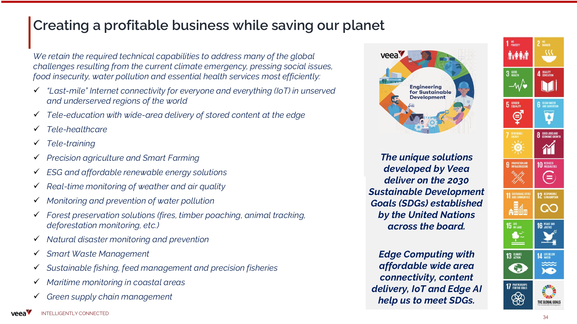 Creating a profitable business while saving our planet We retain the required technical capabilities to address many of the global challenges resulting from the current climate emergency, pressing social issues, food insecurity, water pollution and essential health services most efficiently: x “Last - mile” Internet connectivity for everyone and everything (IoT) in unserved and underserved regions of the world x Tele - education with wide - area delivery of stored content at the edge x Tele - healthcare x Tele - training x Precision agriculture and Smart Farming x ESG and affordable renewable energy solutions x Real - time monitoring of weather and air quality x Monitoring and prevention of water pollution x Forest preservation solutions (fires, timber poaching, animal tracking, de for e sta t ion monit ori n g, e t c .) x Natural disaster monitoring and prevention x S mart Was t e M a n a g em ent x Sustainable fishing, feed management and precision fisheries x Maritime monitoring in coastal areas The u n ique solut i ons dev e lo p ed by Ve e a deliver on t h e 2030 Sust aina b le Dev e lo pment Goals ( SDG s) es t ab l is h ed by the Unit ed N at io ns across the boa r d. Edge C om p u t i n g wi t h affordable wide area con n ectiv i t y, co n tent delive r y, IoT a n d Edge AI x G ree n s u pp ly c hain managem e n t h elp us to meet SDG s. I N TE LLI G E N T L Y C O NN EC T E D 34