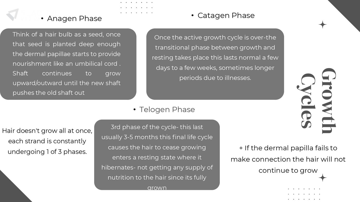 Growt h Cycles Think of a hair bulb as a seed, once that seed is planted deep enough the dermal papillae starts to provide nourishment like an umbilical cord . Shaft continues to grow upward/outward until the new shaft pushes the old shaft out • Anagen Phase • Catagen Phase • Telogen Phase Hair doesn't grow all at once, each strand is constantly undergoing 1 of 3 phases. + If the dermal papilla fails to make connection the hair will not continue to grow Once the active growth cycle is over - the transitional phase between growth and resting takes place this lasts normal a few days to a few weeks, sometimes longer periods due to illnesses. 3rd phase of the cycle - this last usually 3 - 5 months this final life cycle causes the hair to cease growing enters a resting state where it hibernates - not getting any supply of nutrition to the hair since its fully grown