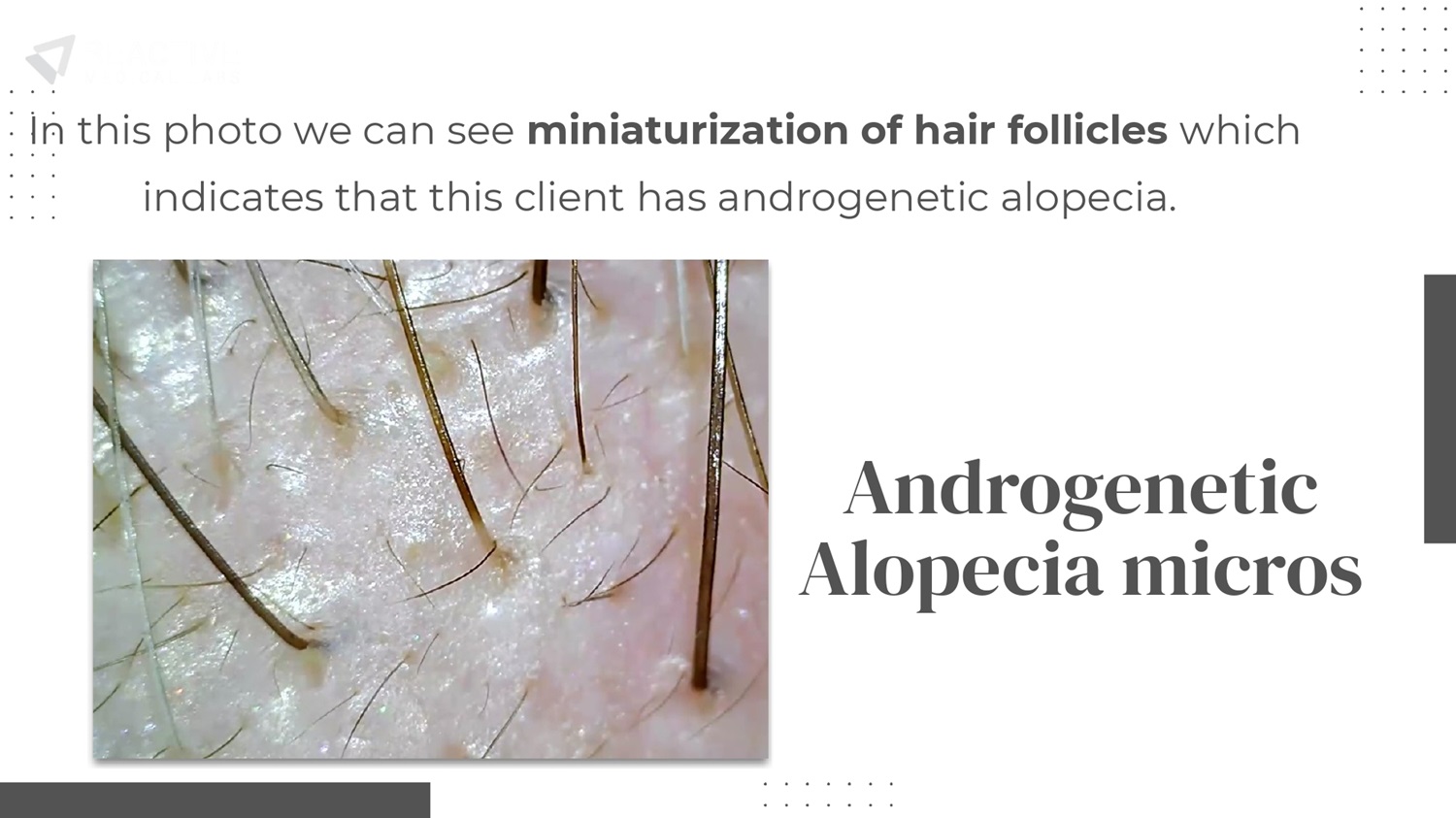 Androgenetic Alopecia micros In this photo we can see miniaturization of hair follicles which indicates that this client has androgenetic alopecia.