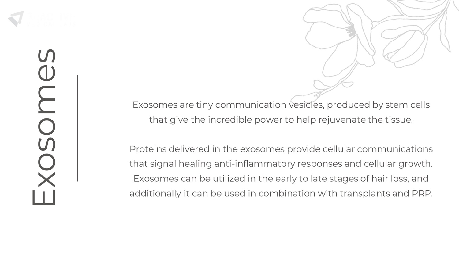 Exosomes Exosomes are tiny communication vesicles, produced by stem cells that give the incredible power to help rejuvenate the tissue. Proteins delivered in the exosomes provide cellular communications that signal healing anti - inflammatory responses and cellular growth. Exosomes can be utilized in the early to late stages of hair loss, and additionally it can be used in combination with transplants and PRP.