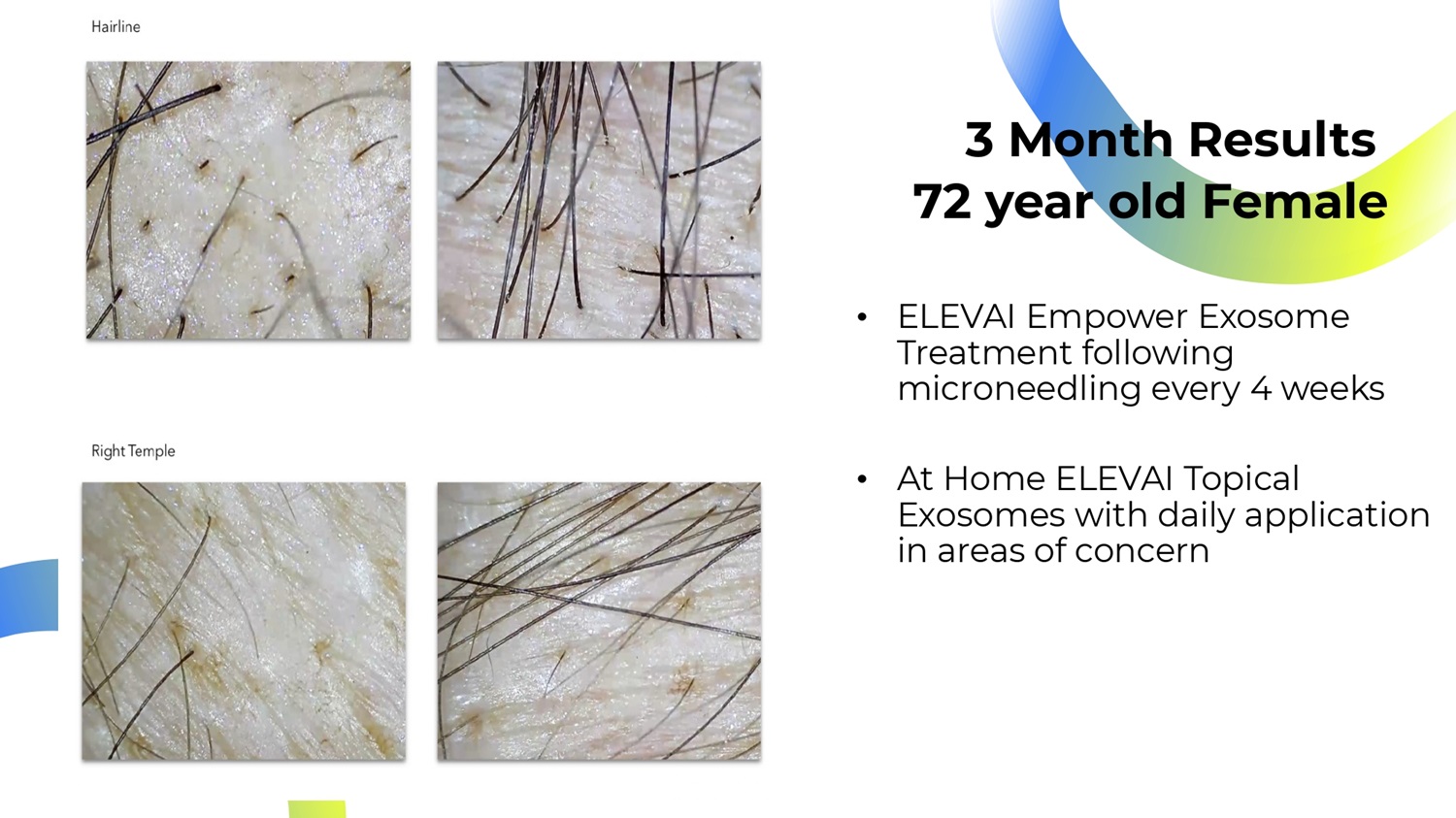 3 Month Results 72 year old Female • ELEVAI Empower Exosome Treatment following microneedling every 4 weeks • At Home ELEVAI Topical Exosomes with daily application in areas of concern