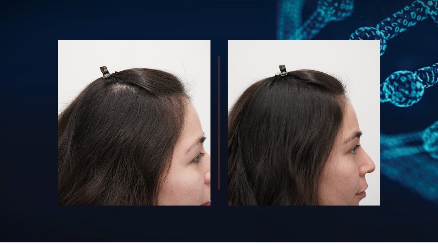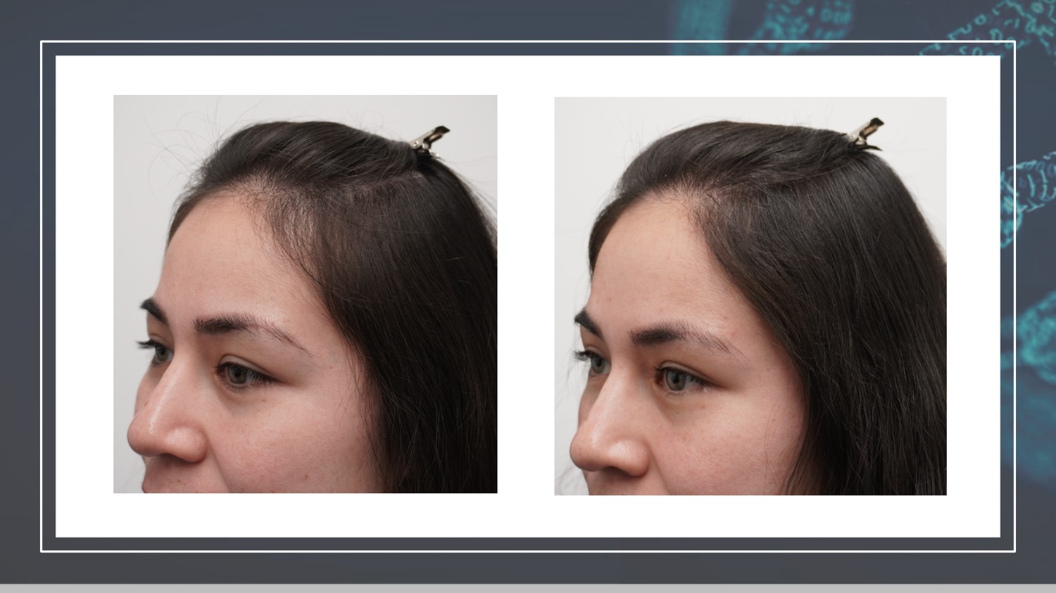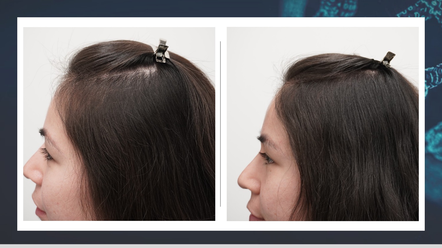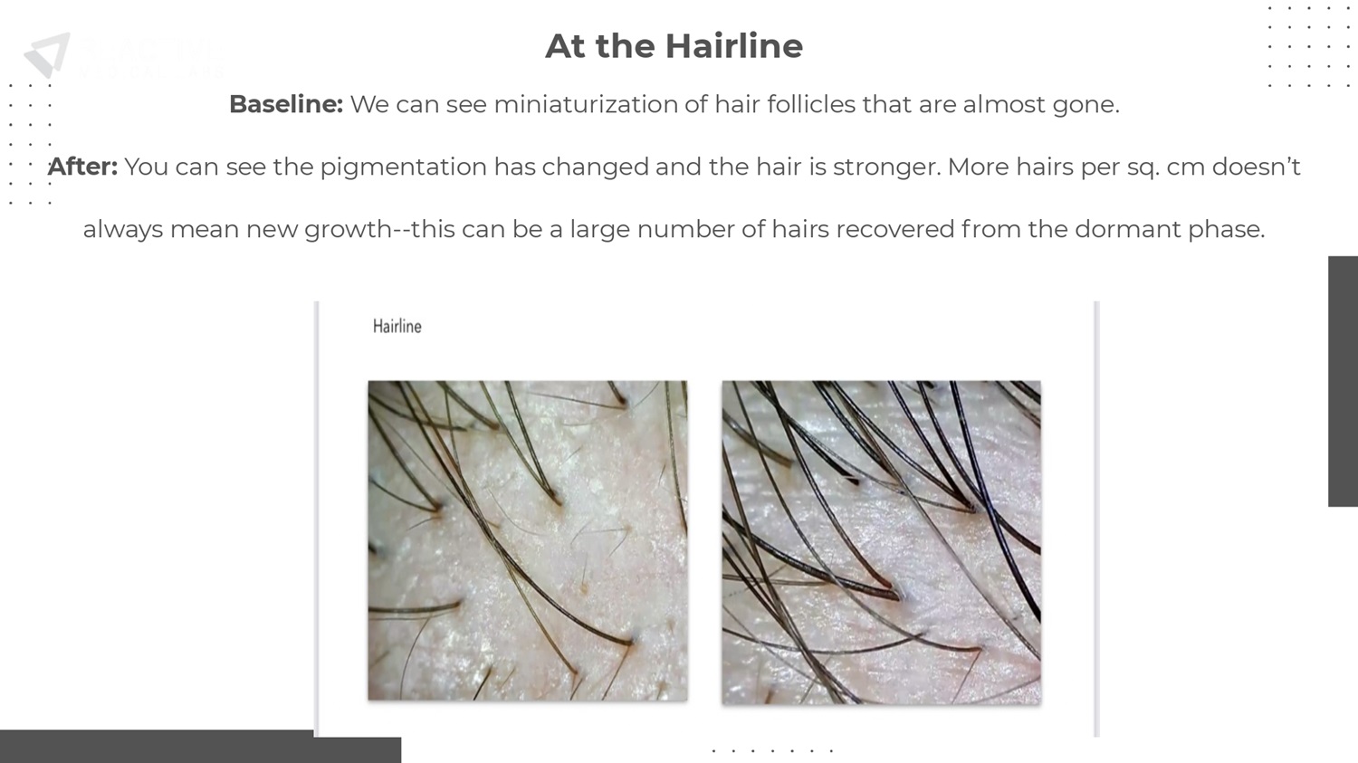 At the Hairline Baseline: We can see miniaturization of hair follicles that are almost gone. After: You can see the pigmentation has changed and the hair is stronger. More hairs per sq. cm doesn’t always mean new growth - - this can be a large number of hairs recovered from the dormant phase.
