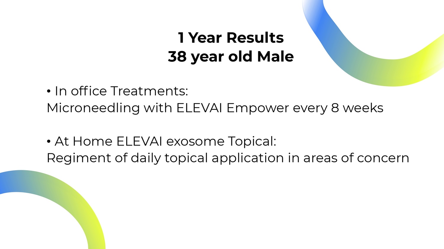 1 Year Results 38 year old Male • In office Treatments: Microneedling with ELEVAI Empower every 8 weeks • At Home ELEVAI exosome Topical: Regiment of daily topical application in areas of concern