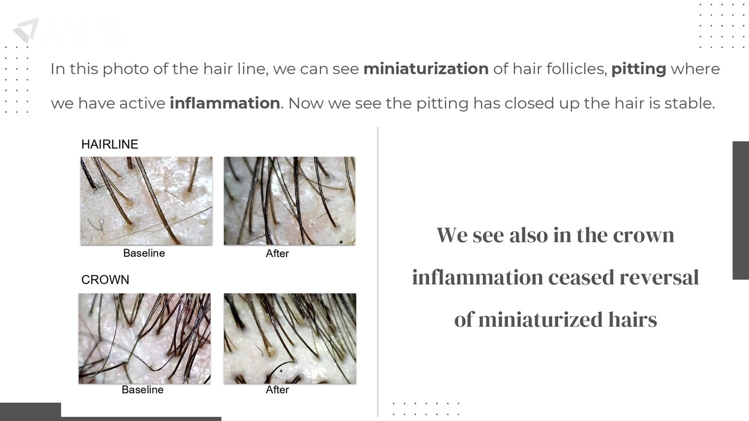 We see also in the crown inflammation ceased reversal of miniaturized hairs In this photo of the hair line, we can see miniaturization of hair follicles, pitting where we have active inflammation . Now we see the pitting has closed up the hair is stable. Baseline Baseline HAIRLINE CROWN After After