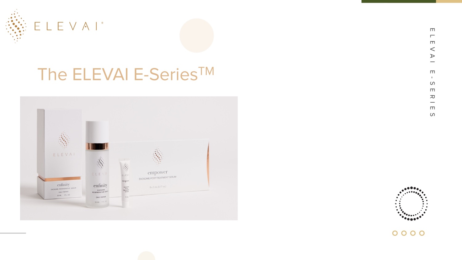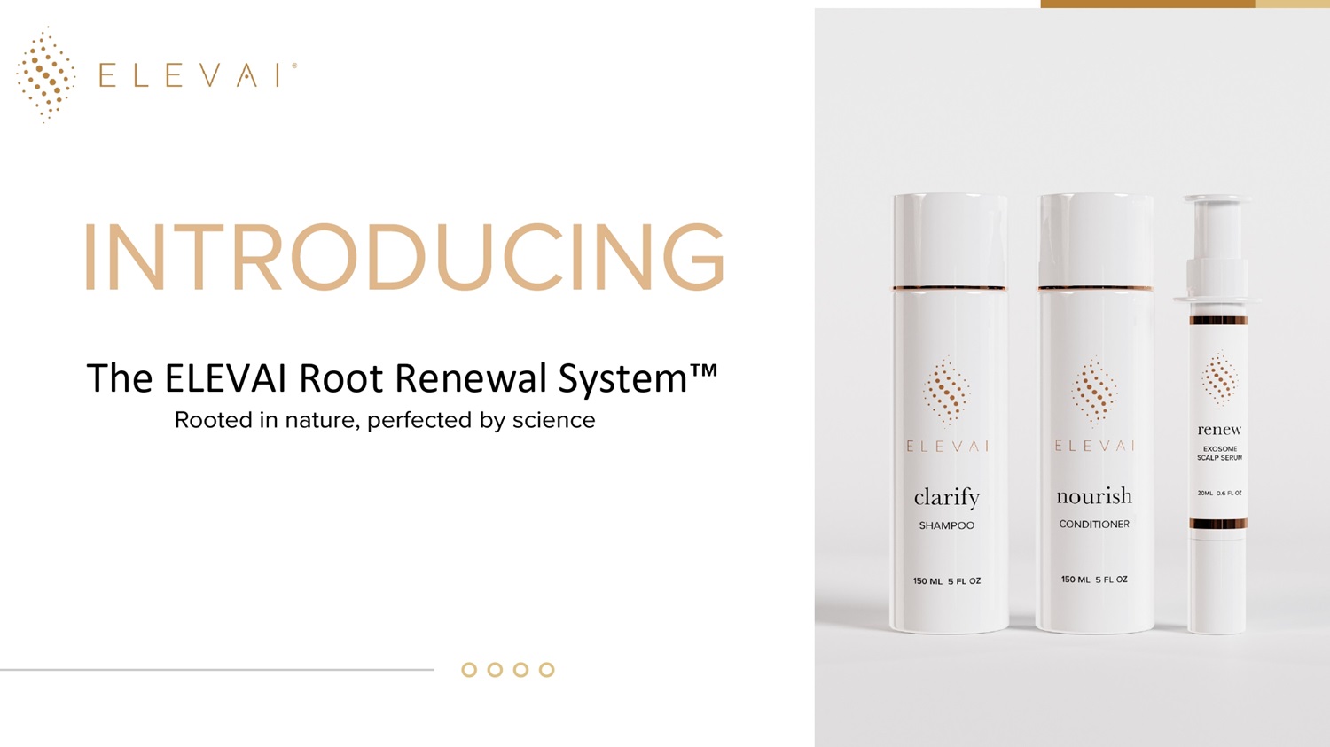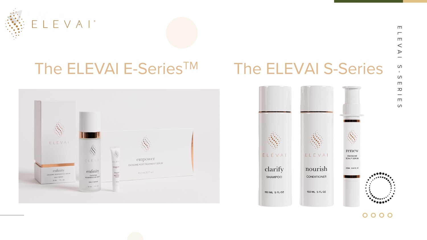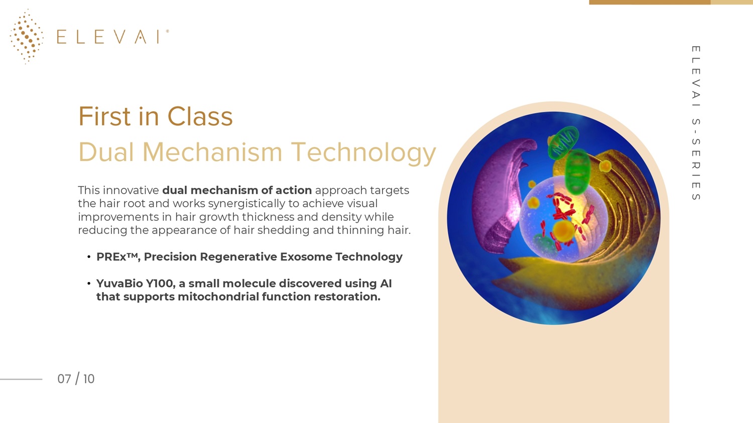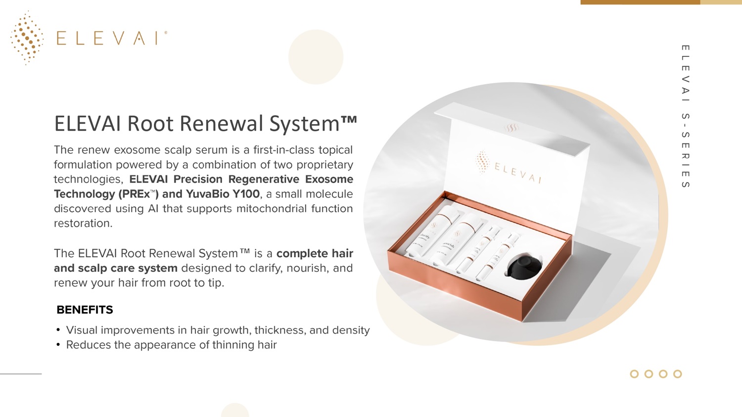 E L E V A I S - S E R I E S 07 / 10 This innovative dual mechanism of action approach targets the hair root and works synergistically to achieve visual improvements in hair growth thickness and density while reducing the appearance of hair shedding and thinning hair. • PREx , Precision Regenerative Exosome Technology • YuvaBio Y100, a small molecule discovered using AI that supports mitochondrial function restoration.