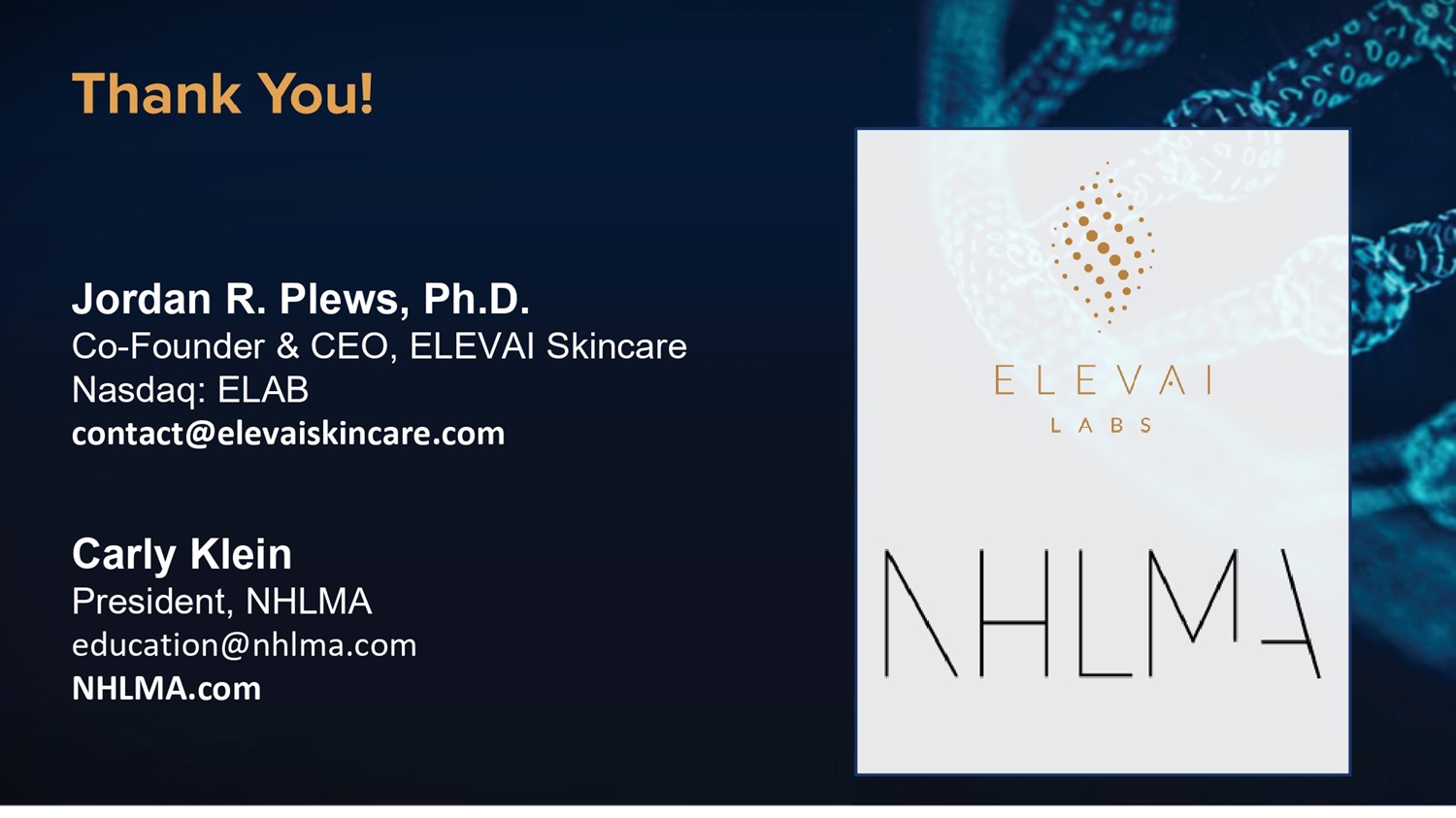 Jordan R. Plews, Ph.D. Co - Founder & CEO, ELEVAI Skincare Nasdaq: ELAB contact @elevaiskincare.com Carly Klein President, NHLMA education@nhlma.com NHLMA.com