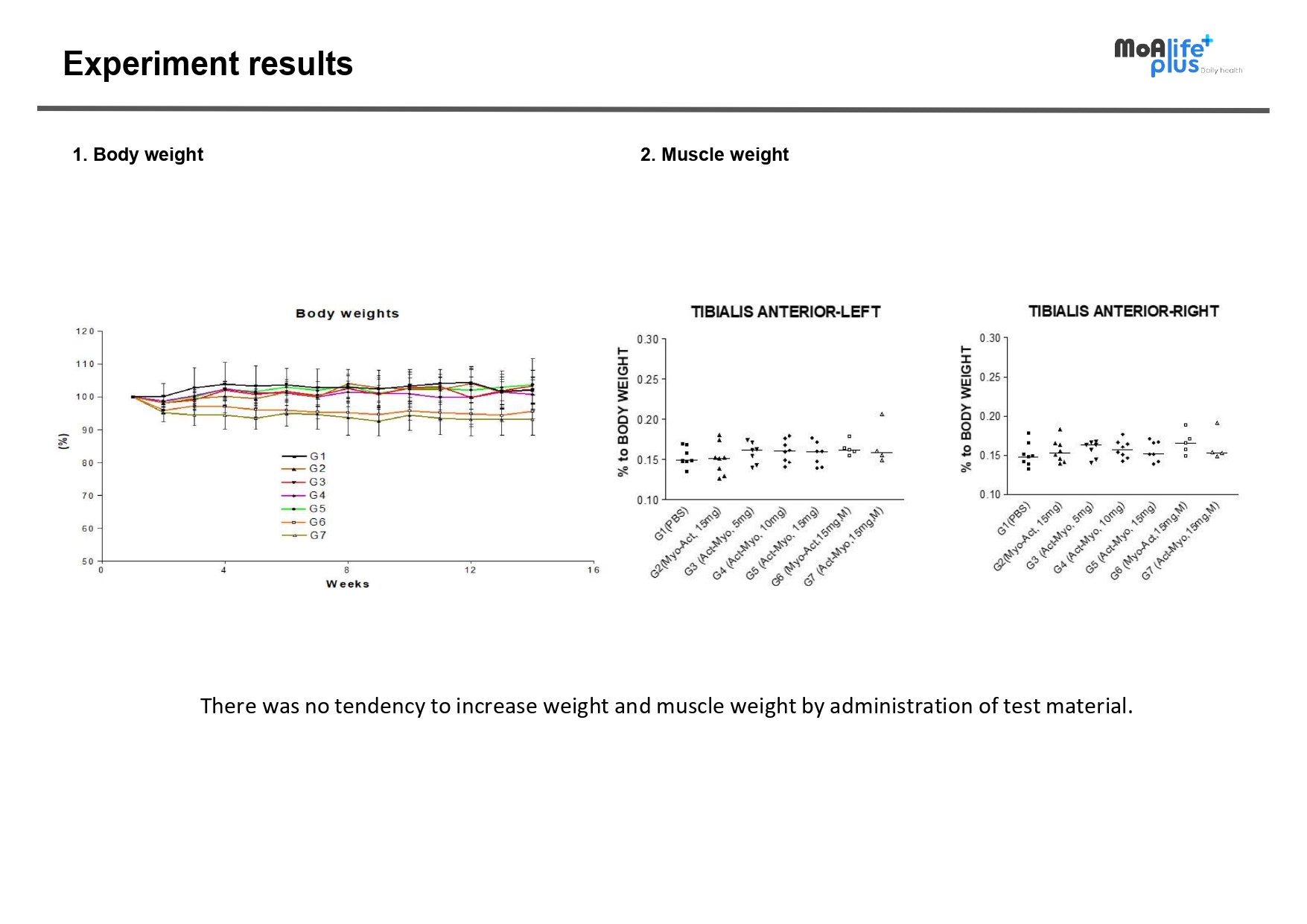 Ex perimen t resul ts 1. Body weight 2. Muscle weight There was no tendency to increase weight and muscle weight by administration of test material.