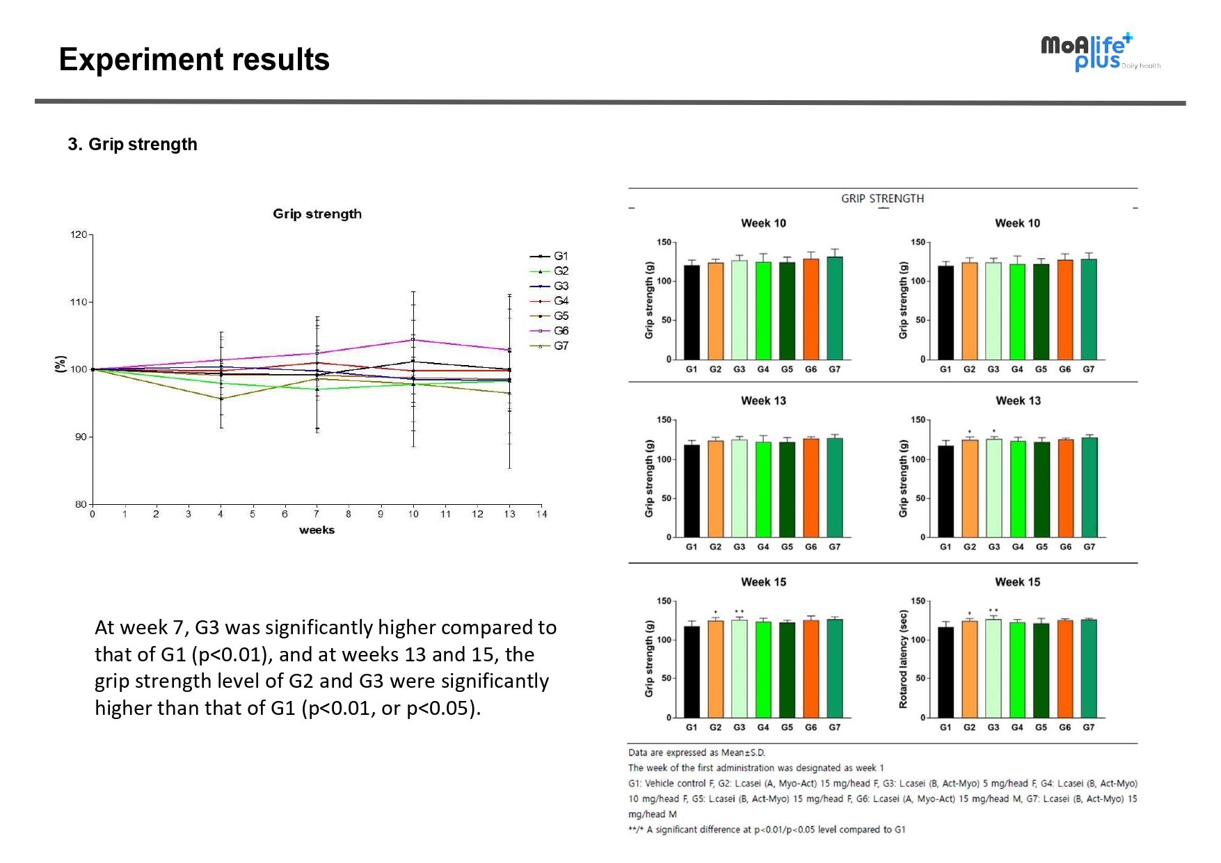 Ex perimen t resul ts 3 . Gr i p s t rength At week 7, G3 was significantly higher compared to that of G1 (p<0.01), and at weeks 13 and 15, the grip strength level of G2 and G3 were significantly higher than that of G1 (p<0.01, or p<0.05).
