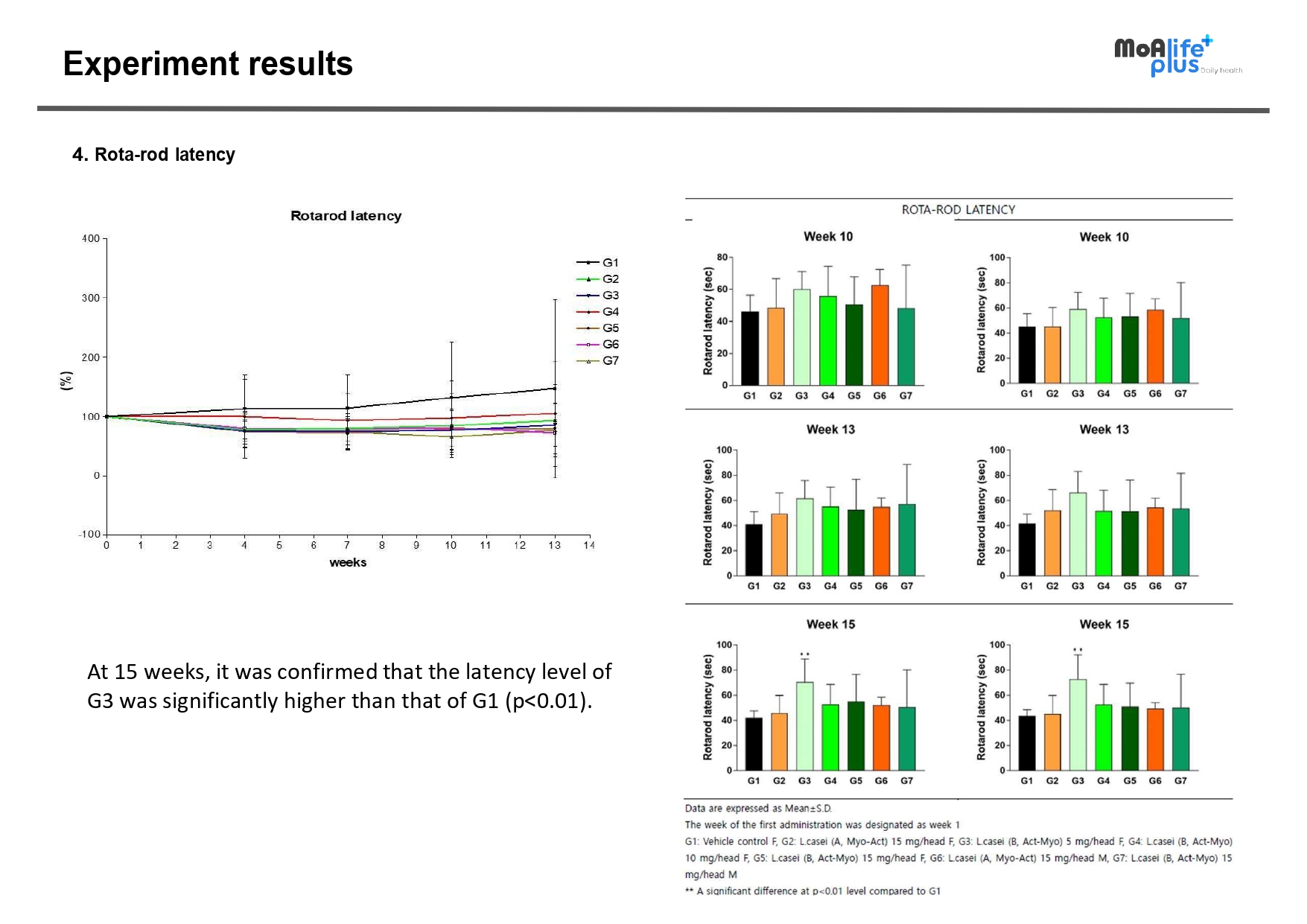 Ex perimen t resul ts 4. Rota - rod latency At 15 weeks, it was confirmed that the latency level of G3 was significantly higher than that of G1 (p<0.01).