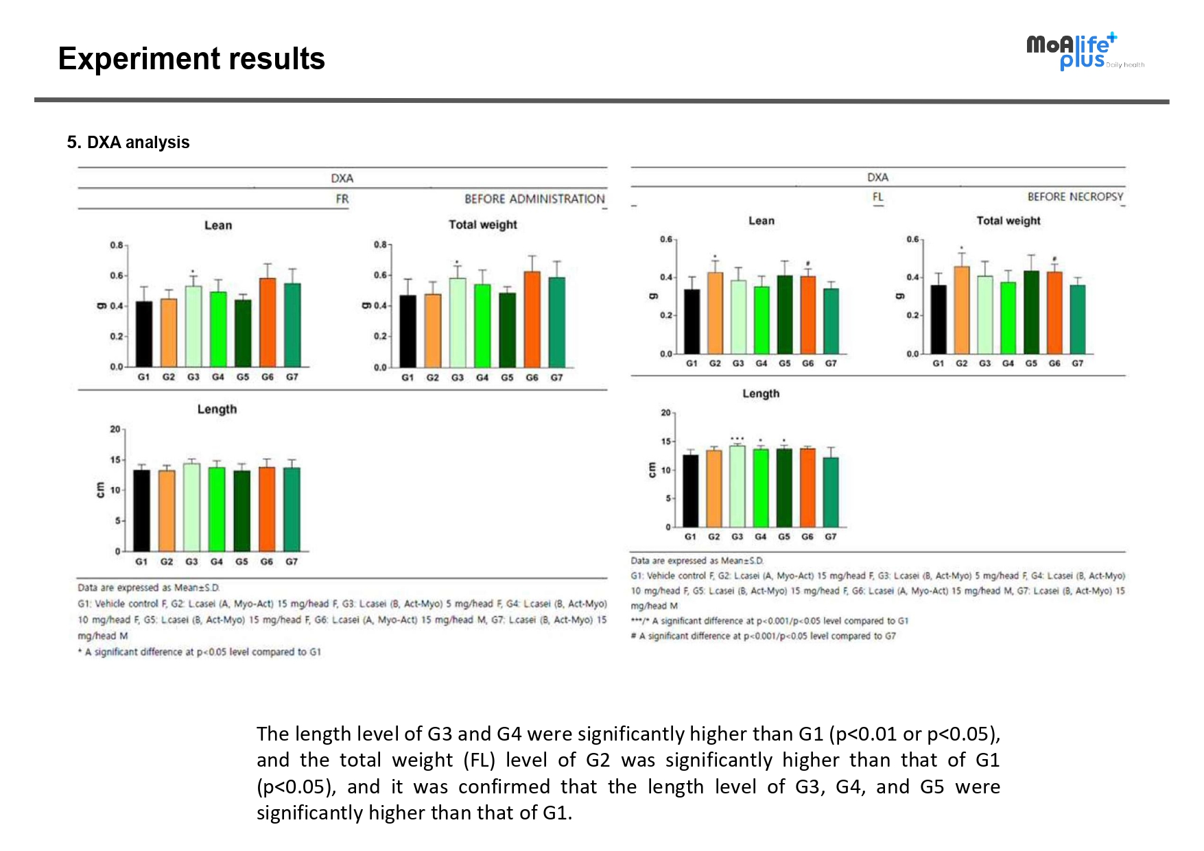 Ex perimen t resul ts 5 . D X A a n a l ys i s The length level of G 3 and G 4 were significantly higher than G 1 (p< 0 . 01 or p< 0 . 05 ), and the total weight (FL) level of G 2 was significantly higher than that of G 1 (p< 0 . 05 ), and it was confirmed that the length level of G 3 , G 4 , and G 5 were significantly higher than that of G 1 .