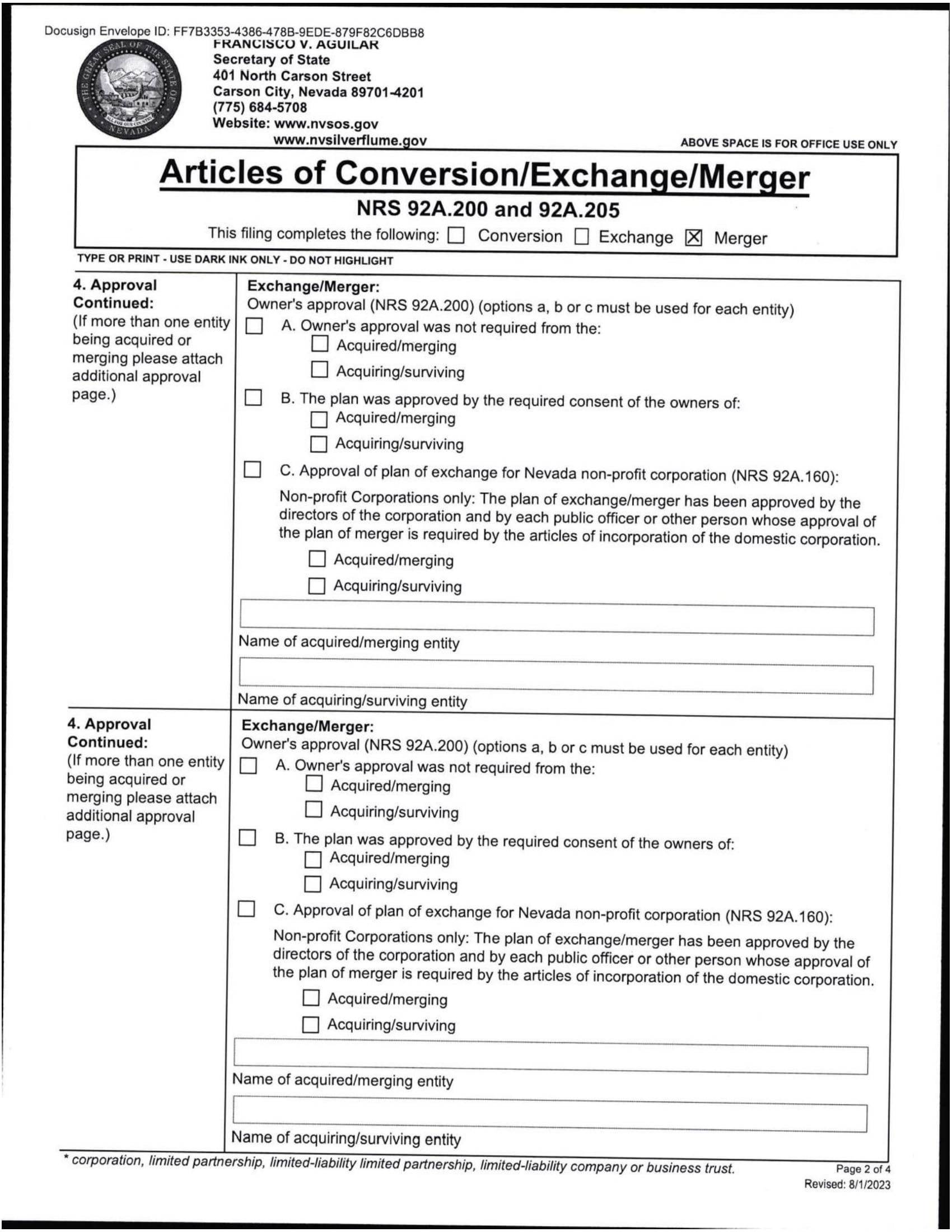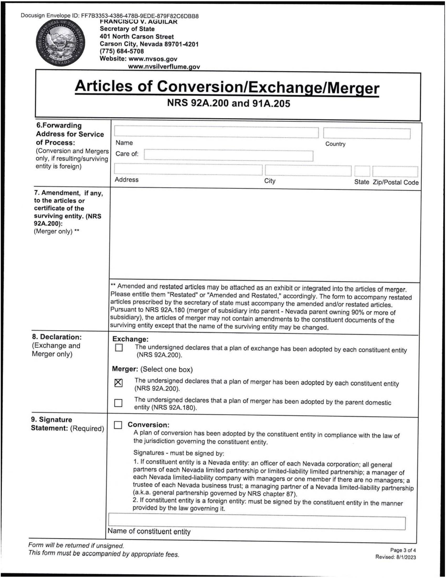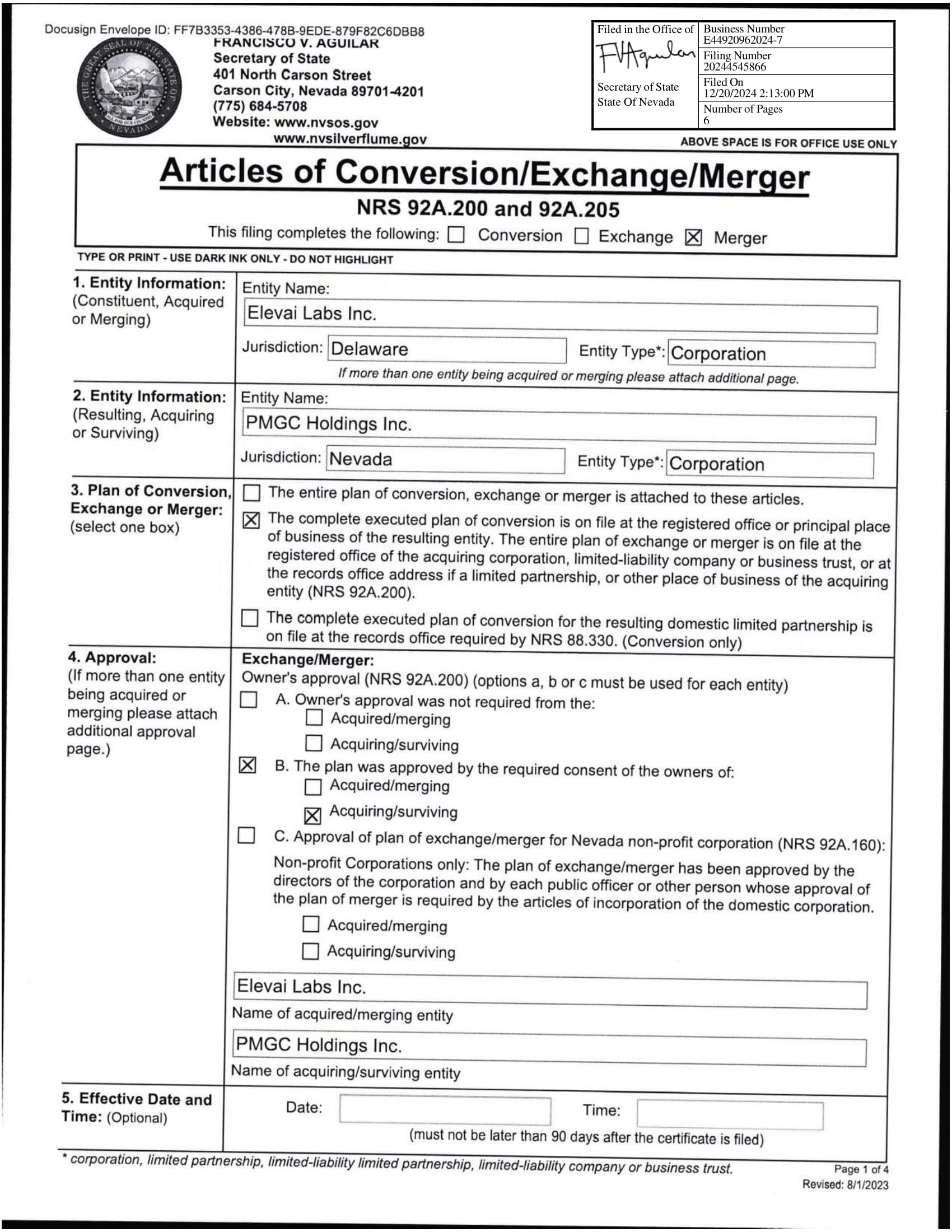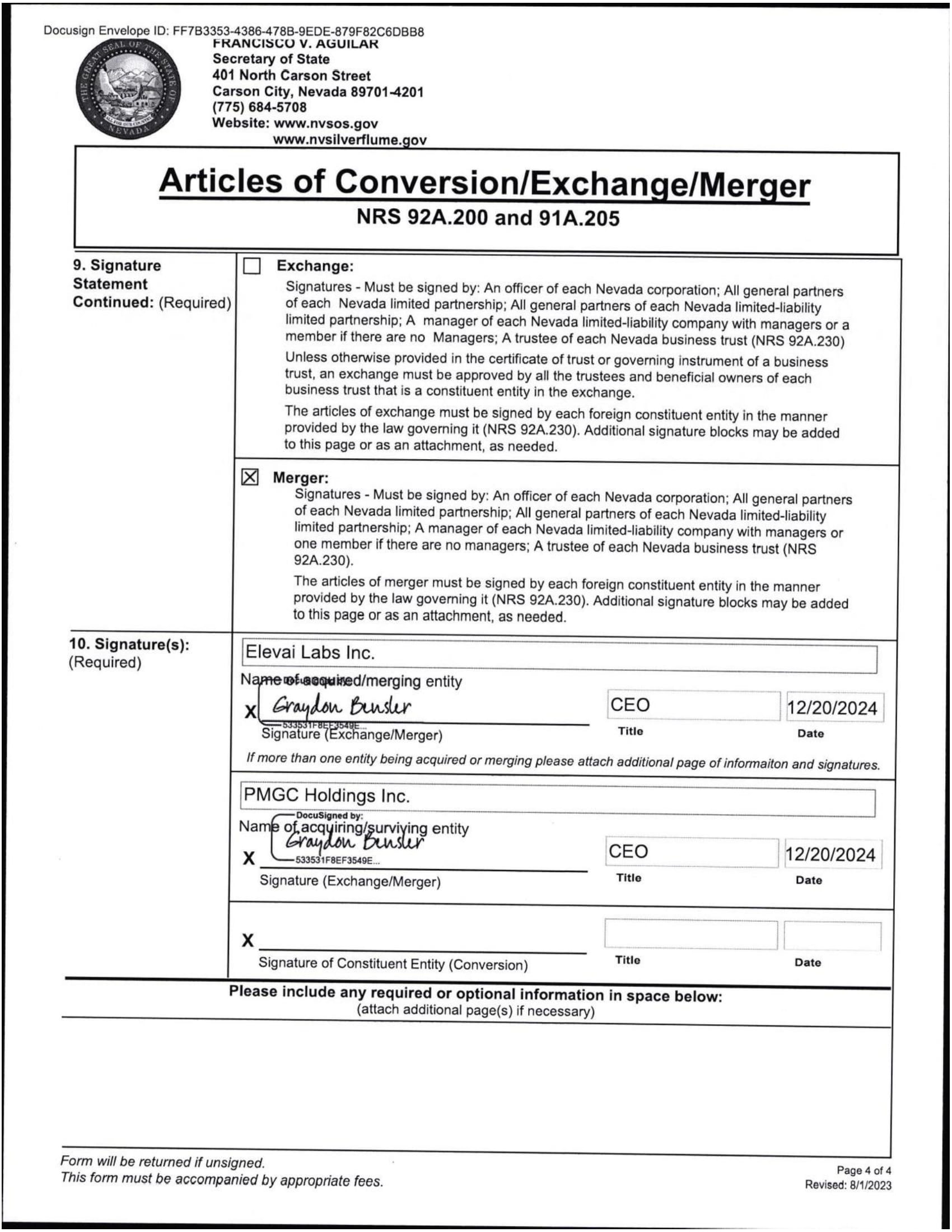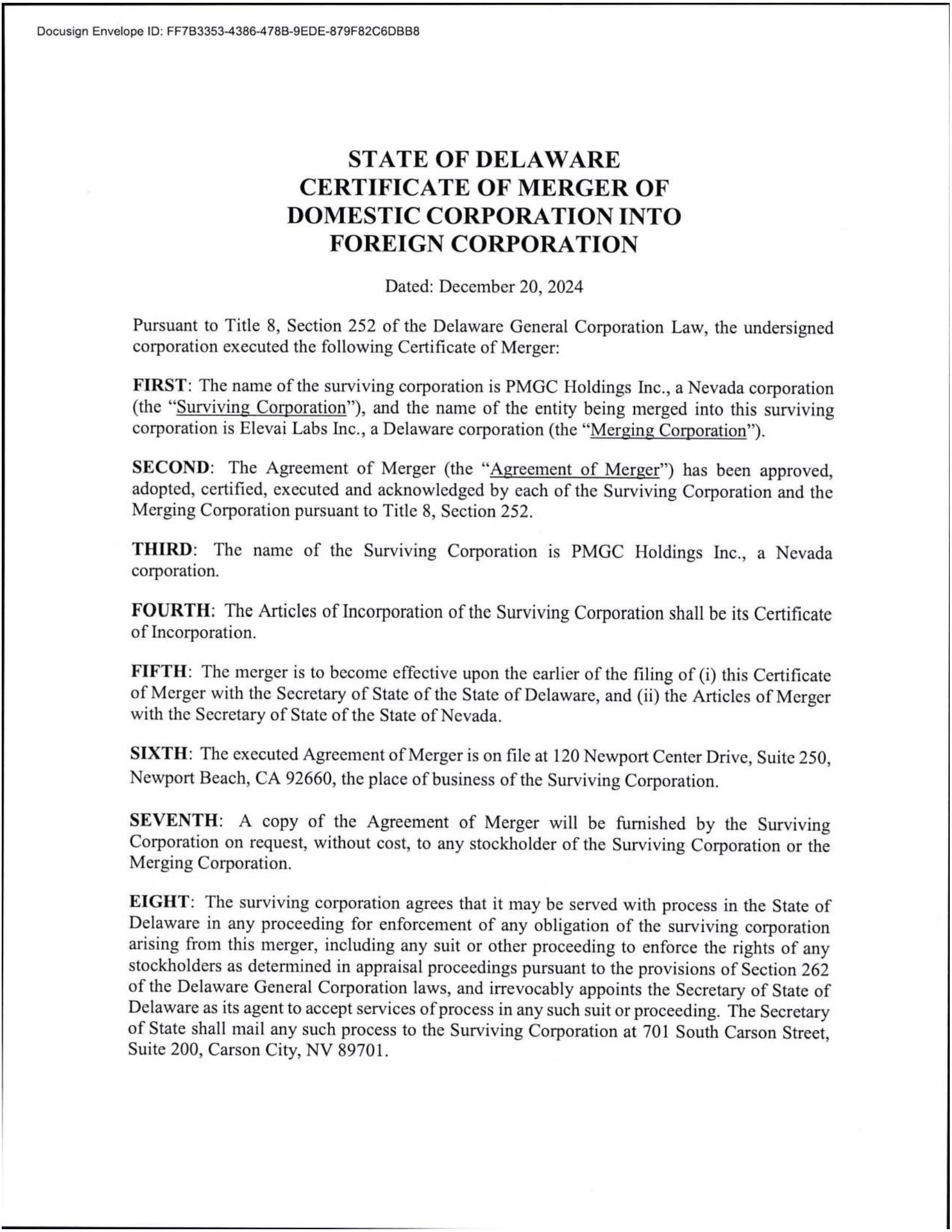 EX-3.2 4 ea022532701ex3-2_pmgchold.htm NEVADA ARTICLES OF MERGER, AS FILED WITH THE SECRETARY OF STATE OF THE STATE OF NEVADA ON DECEMBER 20, 2024