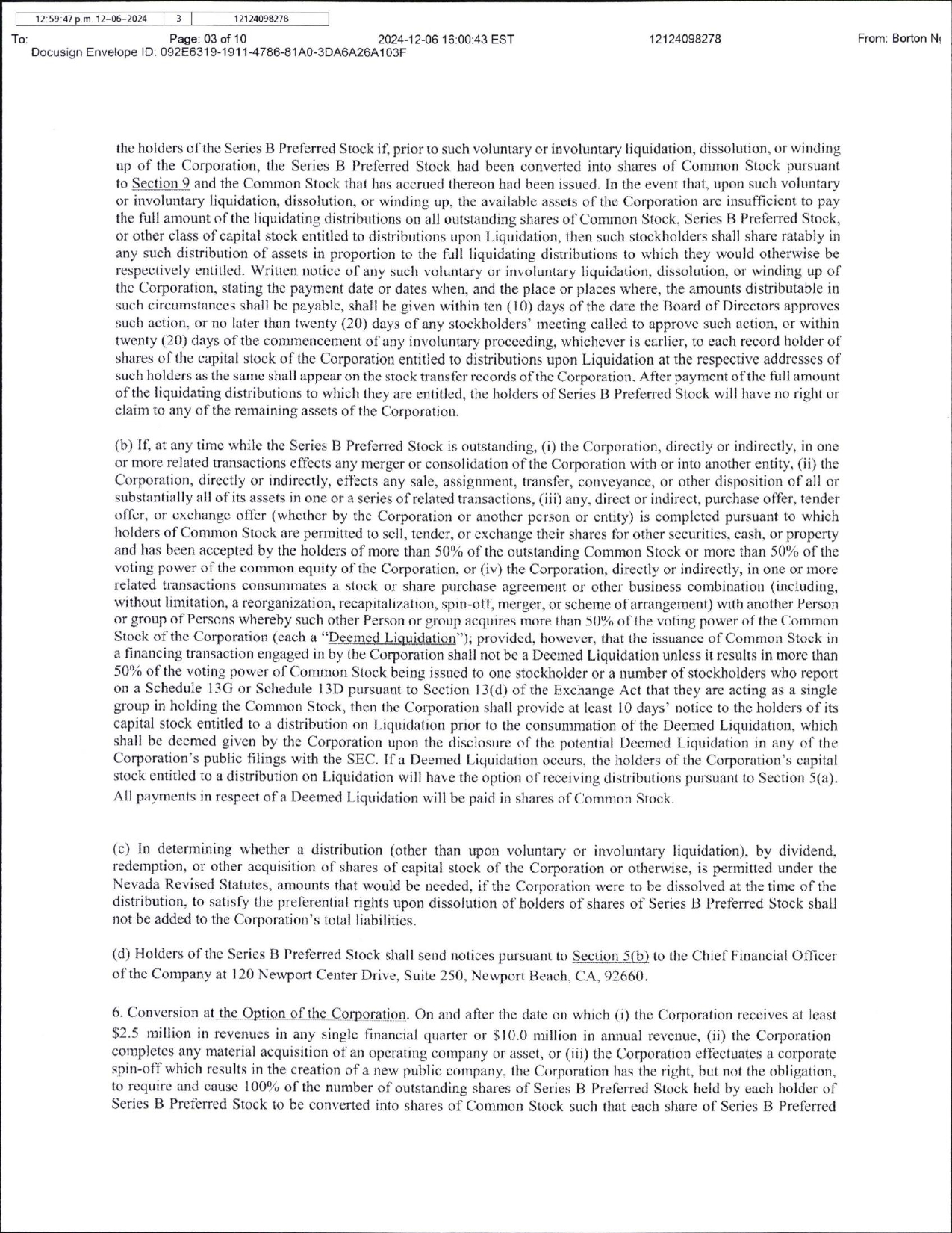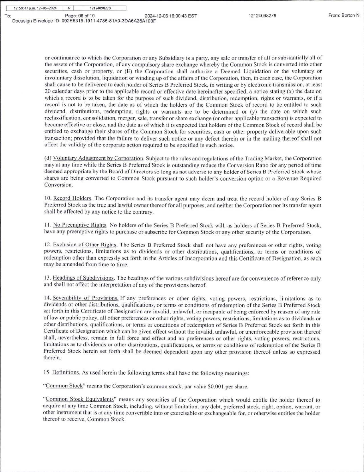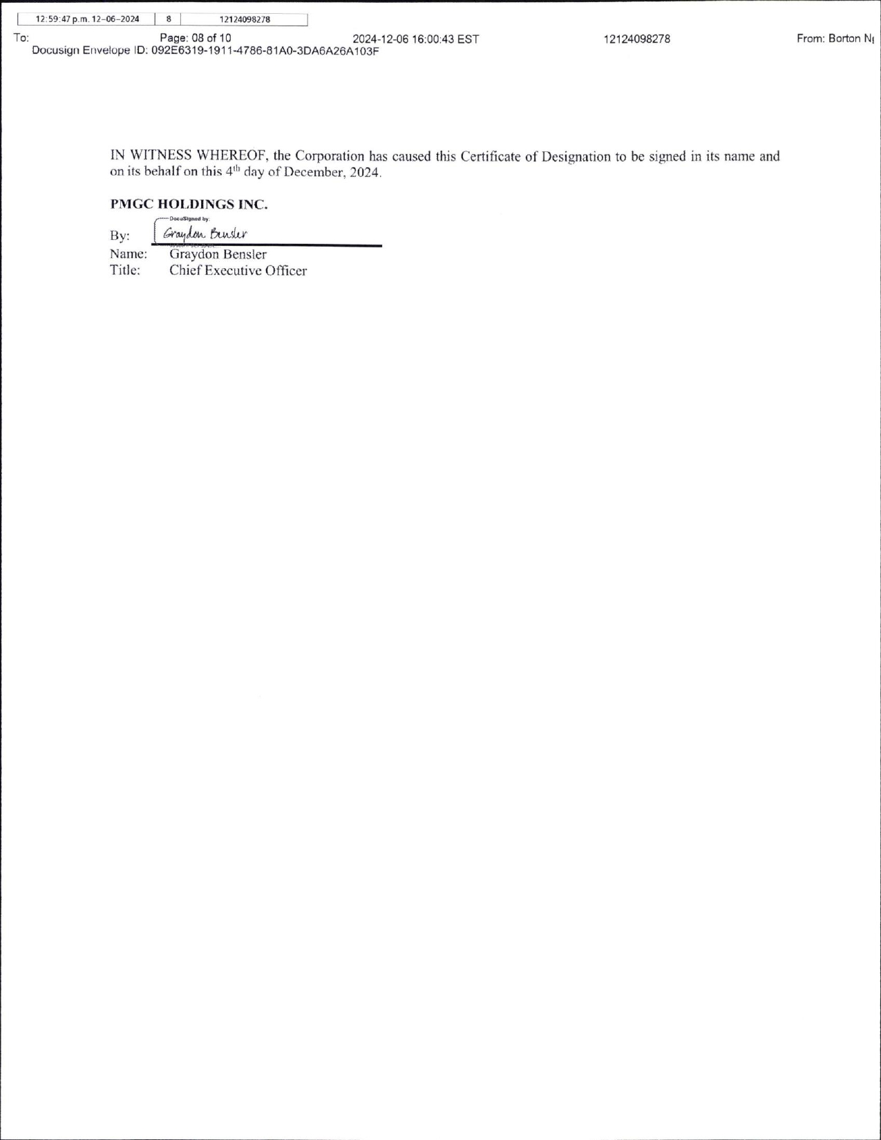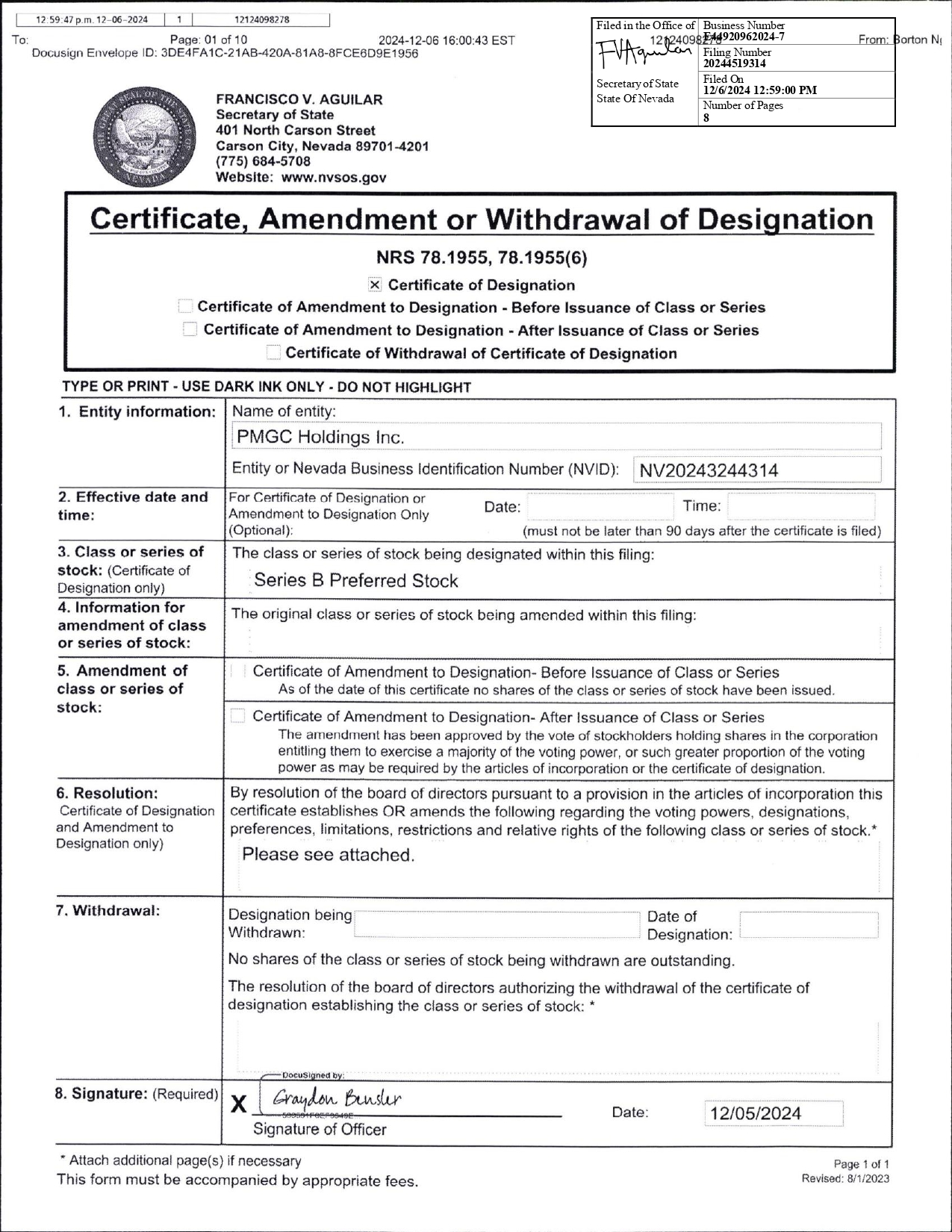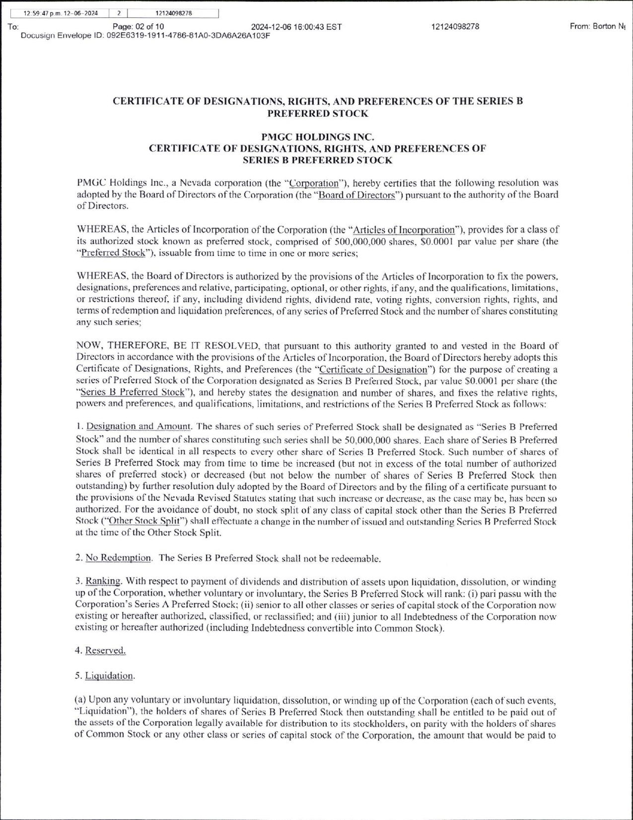 EX-3.5 7 ea022532701ex3-5_pmgchold.htm CERTIFICATE OF DESIGNATION, PREFERENCES AND RIGHTS OF SERIES B PREFERRED STOCK