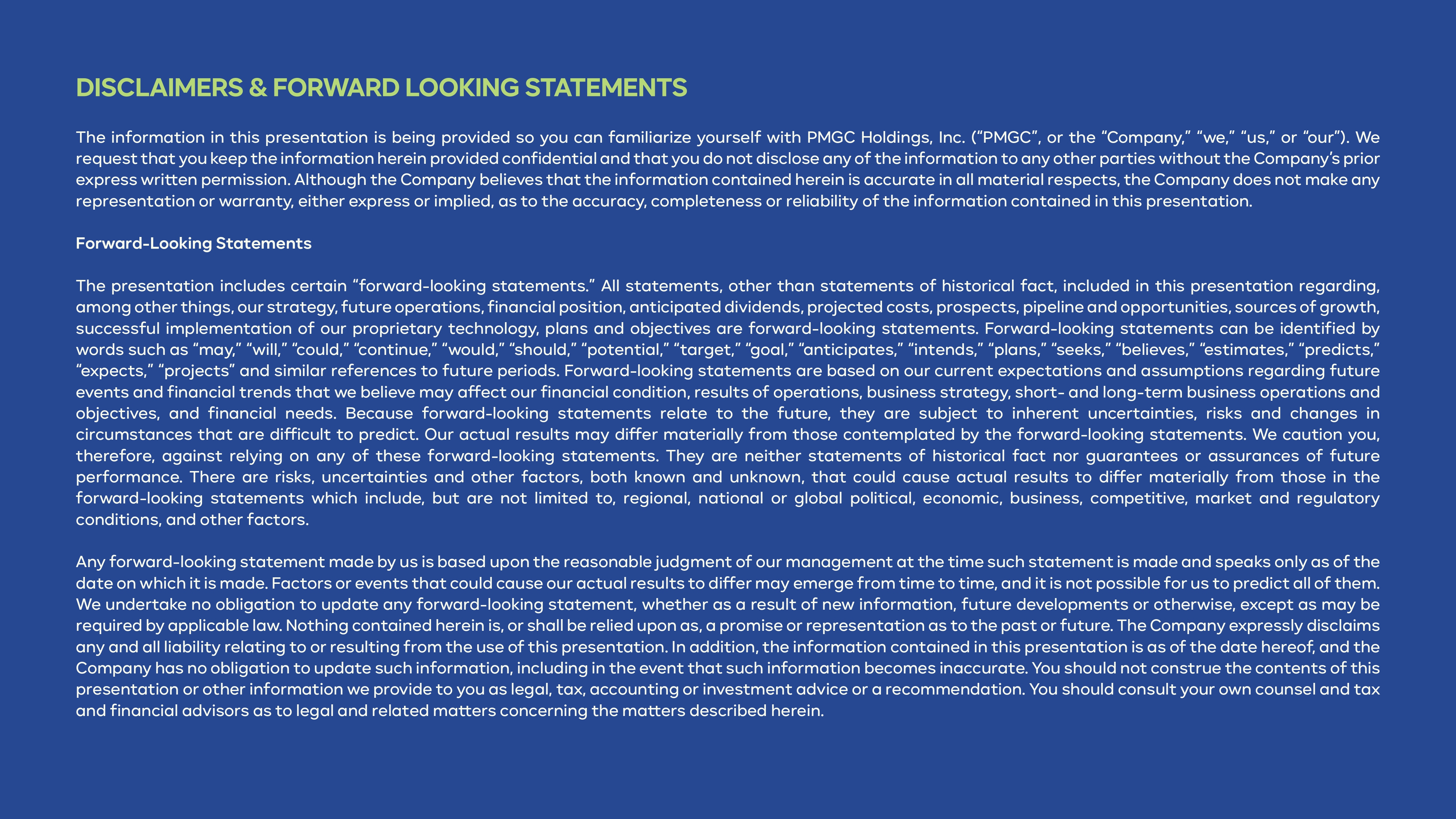 The information in this presentation is being provided so you can familiarize yourself with PMGC Holdings, Inc . ("PMGC", or the "Company," "we," "us," or "our") . We request that you keep the information herein provided confidential and that you do not disclose any of the information to any other parties without the Company's prior express written permission . Although the Company believes that the information contained herein is accurate in all material respects, the Company does not make any representation or warranty, either express or implied, as to the accuracy, completeness or reliability of the information contained in this presentation . Forward - Looking Statements The presentation includes certain "forward - looking statements . " All statements, other than statements of historical fact, included in this presentation regarding, among other things, our strategy, future operations, financial position, anticipated dividends, projected costs, prospects, pipeline and opportunities, sources of growth, successful implementation of our proprietary technology, plans and objectives are forward - looking statements . Forward - looking statements can be identified by words such as "may," "will," "could," "continue," "would," "should," "potential," "target," "goal," "anticipates," "intends," "plans," "seeks," "believes," "estimates," "predicts," "expects," "projects" and similar references to future periods . Forward - looking statements are based on our current expectations and assumptions regarding future events and financial trends that we believe may affect our financial condition, results of operations, business strategy, short - and long - term business operations and objectives, and financial needs . Because forward - looking statements relate to the future, they are subject to inherent uncertainties, risks and changes in circumstances that are difficult to predict . Our actual results may differ materially from those contemplated by the forward - looking statements . We caution you, therefore, against relying on any of these forward - looking statements . They are neither statements of historical fact nor guarantees or assurances of future performance . There are risks, uncertainties and other factors, both known and unknown, that could cause actual results to differ materially from those in the forward - looking statements which include, but are not limited to, regional, national or global political, economic, business, competitive, market and regulatory conditions, and other factors . Any forward - looking statement made by us is based upon the reasonable judgment of our management at the time such statement is made and speaks only as of the date on which it is made . Factors or events that could cause our actual results to differ may emerge from time to time, and it is not possible for us to predict all of them . We undertake no obligation to update any forward - looking statement, whether as a result of new information, future developments or otherwise, except as may be required by applicable law . Nothing contained herein is, or shall be relied upon as, a promise or representation as to the past or future . The Company expressly disclaims any and all liability relating to or resulting from the use of this presentation . In addition, the information contained in this presentation is as of the date hereof, and the Company has no obligation to update such information, including in the event that such information becomes inaccurate . You should not construe the contents of this presentation or other information we provide to you as legal, tax, accounting or investment advice or a recommendation . You should consult your own counsel and tax and financial advisors as to legal and related matters concerning the matters described herein .