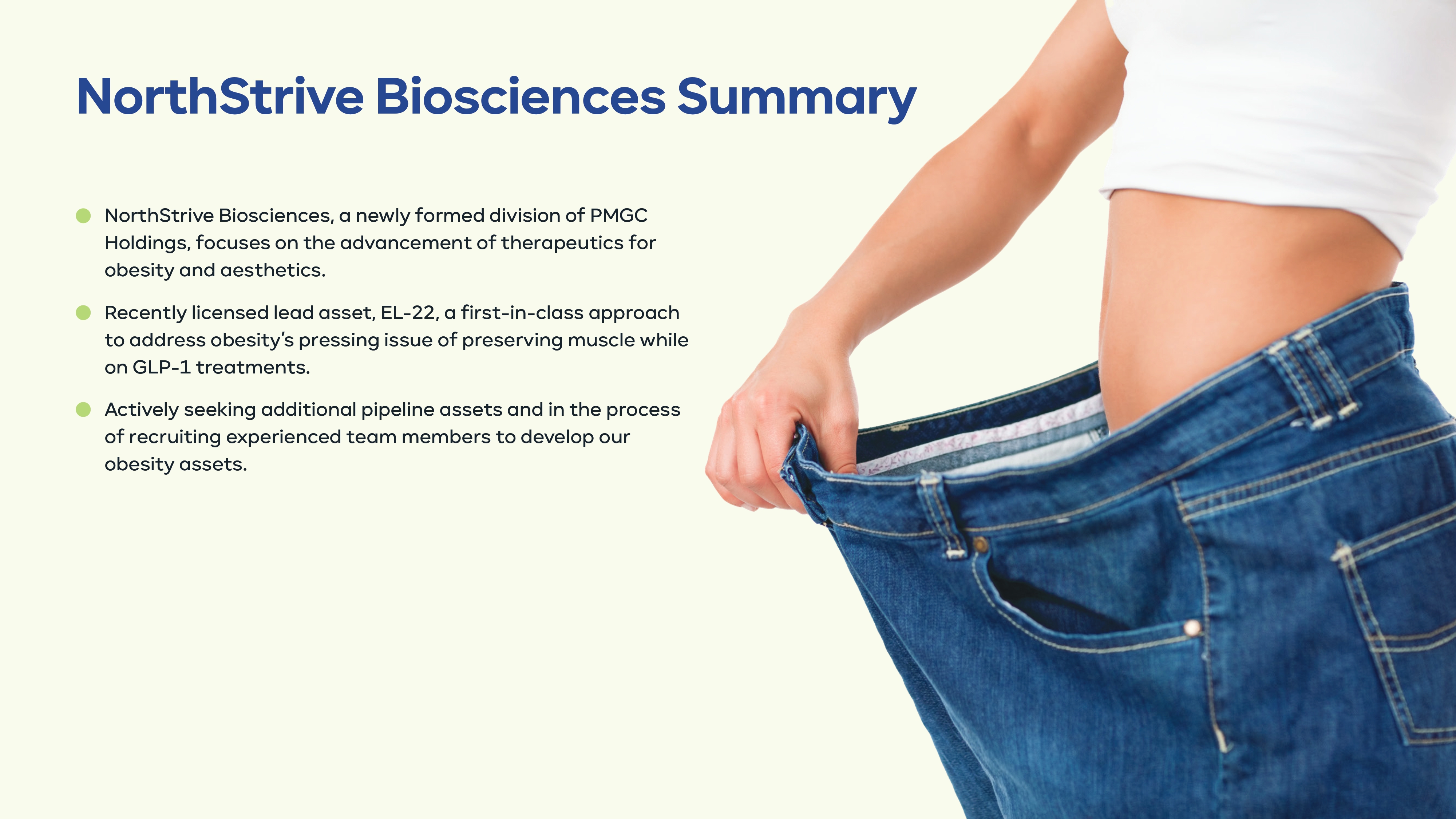 NorthStrive Biosciences, a newly formed division of PMGC Holdings, focuses on the advancement of therapeutics for obesity and aesthetics. Recently licensed lead asset, EL - 22, a first - in - class approach to address obesity's pressing issue of preserving muscle while on GLP - 1 treatments. Actively seeking additional pipeline assets and in the process of recruiting experienced team members to develop our obesity assets. NorthStrive Biosciences Summary