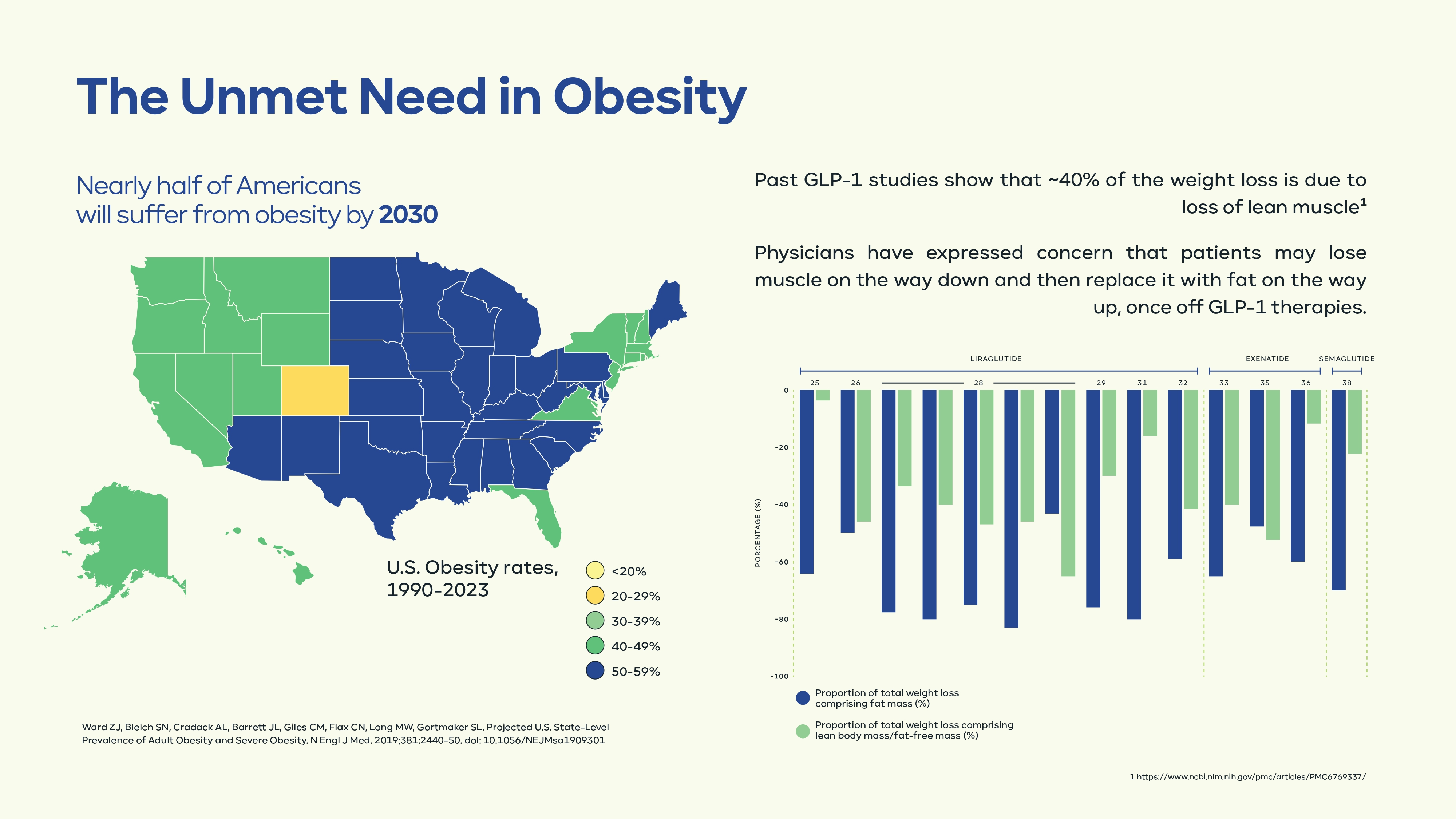 The Unmet Need in Obesity Past GLP - 1 studies show that ~40% of the weight loss is due to loss of lean muscle1 Physicians have expressed concern that patients may lose muscle on the way down and then replace it with fat on the way up, once off GLP - 1 therapies. LIRAGLUTIDE PORCENTAGE (%) 25 0 - 20 - 40 - 60 - 80 - 100 26 28 29 31 32 33 35 36 38 EXENATIDE SEMAGLUTIDE Proportion of total weight loss comprising fat mass (%) Proportion of total weight loss comprising lean body mass/fat - free mass (%) 1 https://www.ncbi.nlm.nih.gov/pmc/articles/PMC6769337/ Nearly half of Americans will suffer from obesity by 2030 U.S. Obesity rates, 1990 - 2023 <20% 20 - 29% 30 - 39% 40 - 49% 50 - 59% Ward ZJ, Bleich SN, Cradack AL, Barrett JL, Giles CM, Flax CN, Long MW, Gortmaker SL. Projected U.S. State - Level Prevalence of Adult Obesity and Severe Obesity. N Engl J Med. 2019;381:2440 - 50. dol: 10.1056/NEJMsa1909301