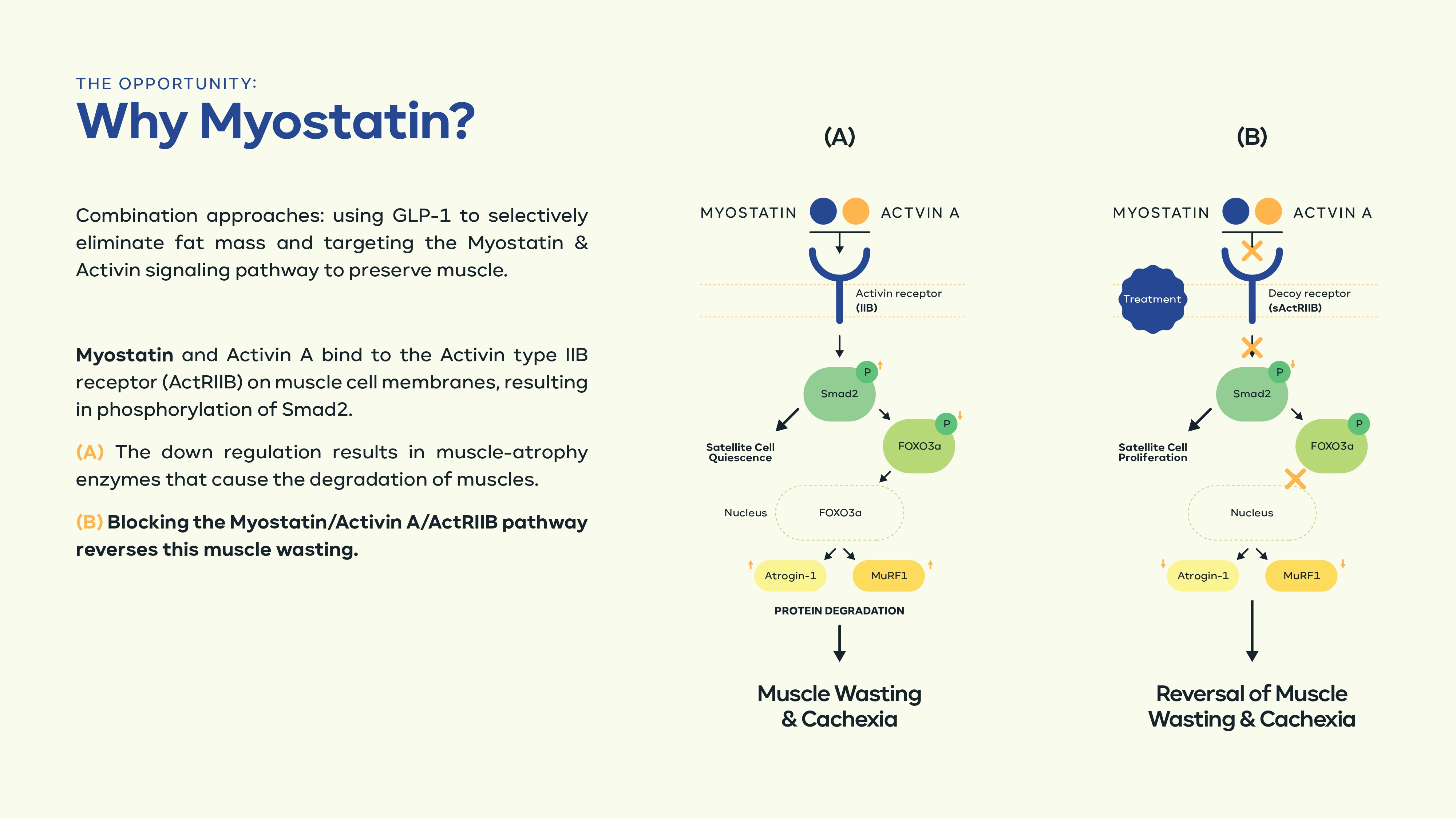 THE OPPORTUNITY: MYOSTATIN ACTVIN A Activin receptor (IIB) Nucleus Satellite Cell Quiescence Why Myostatin? Combination approaches : using GLP - 1 to selectively eliminate fat mass and targeting the Myostatin & Activin signaling pathway to preserve muscle . Myostatin and Activin A bind to the Activin type IIB receptor (ActRIIB) on muscle cell membranes, resulting in phosphorylation of Smad2. (A) The down regulation results in muscle - atrophy enzymes that cause the degradation of muscles. (B) Blocking the Myostatin/Activin A/ActRIIB pathway reverses this muscle wasting. Smad2 P FOXO3a MuRF1 Atrogin - 1 FOXO3a PROTEIN DEGRADATION P Muscle Wasting & Cachexia (A) MYOSTATIN ACTVIN A Decoy receptor (sActRIIB) Nucleus Satellite Cell Proliferation Smad2 P FOXO3a MuRF1 Atrogin - 1 P Reversal of Muscle Wasting & Cachexia (B) Treatment