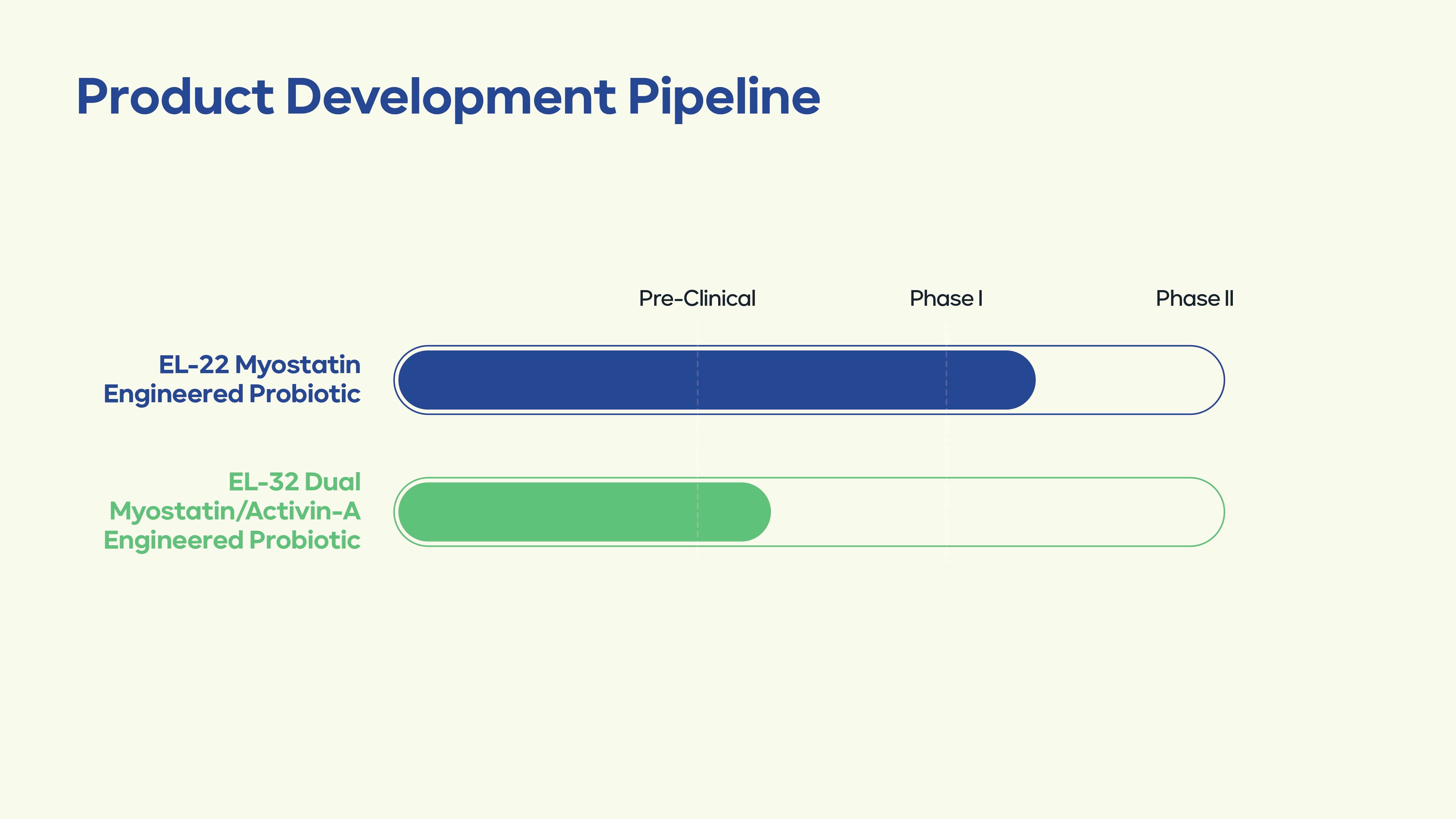 Product Development Pipeline Pre - Clinical EL - 22 Myostatin Engineered Probiotic EL - 32 Dual Myostatin/Activin - A Engineered Probiotic Phase I Phase II