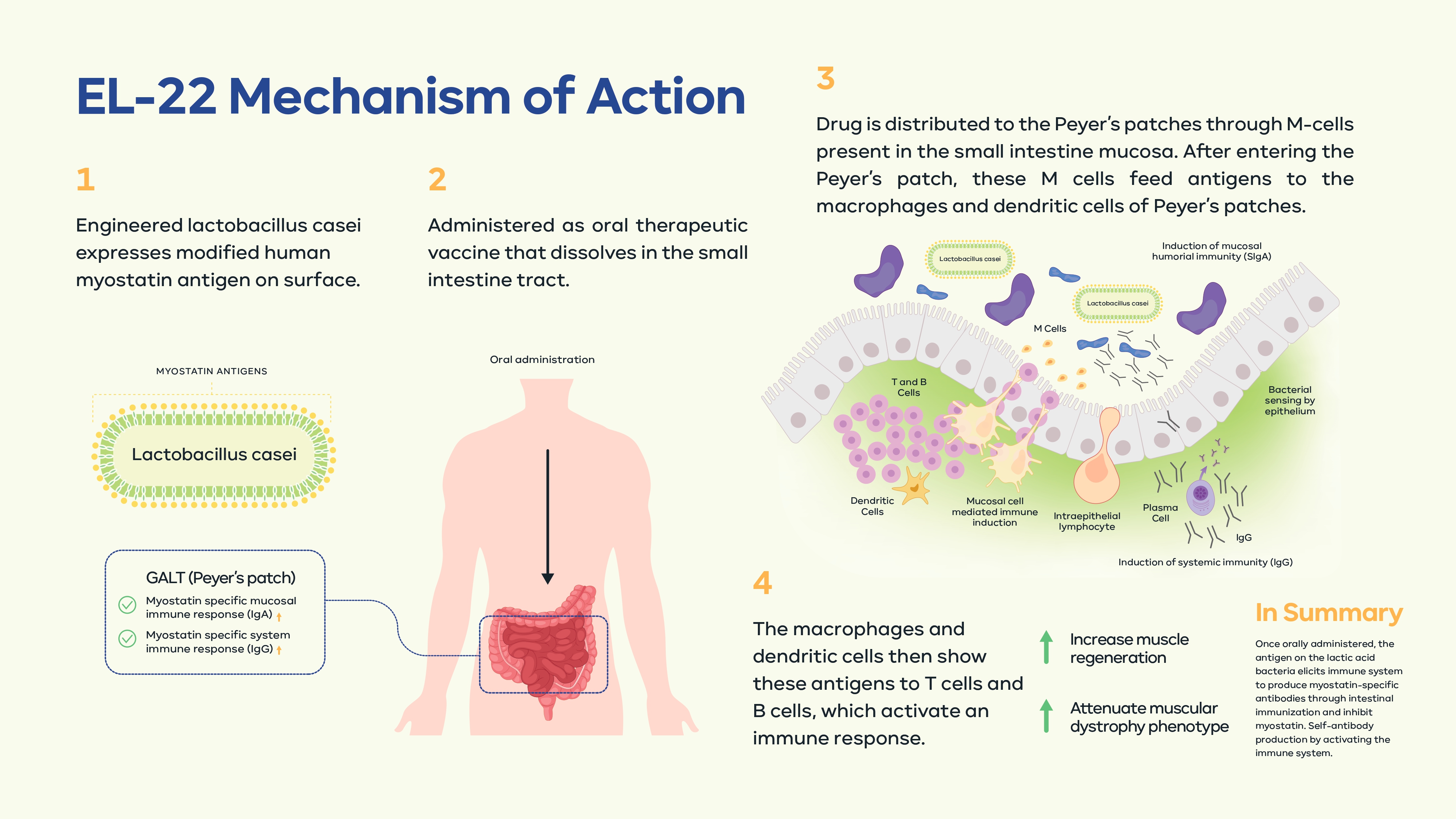 EL - 22 Mechanism of Action Oral administration 1 Engineered lactobacillus casei expresses modified human myostatin antigen on surface. 2 Administered as oral therapeutic vaccine that dissolves in the small intestine tract . 3 Drug is distributed to the Peyer's patches through M - cells present in the small intestine mucosa . After entering the Peyer's patch, these M cells feed antigens to the macrophages and dendritic cells of Peyer's patches . 4 The macrophages and dendritic cells then show these antigens to T cells and B cells, which activate an immune response. Increase muscle regeneration Attenuate muscular dystrophy phenotype GALT (Peyer's patch) Myostatin specific mucosal immune response (IgA) Myostatin specific system immune response (IgG) Lactobacillus casei MYOSTATIN ANTIGENS In Summary Once orally administered, the antigen on the lactic acid bacteria elicits immune system to produce myostatin - specific antibodies through intestinal immunization and inhibit myostatin. Self - antibody production by activating the immune system. Induction of mucosal humorial immunity (SIgA) Bacterial sensing by epithelium IgG Plasma Cell Intraepithelial lymphocyte Dendritic Cells T and B Cells Mucosal cell mediated immune induction Induction of systemic immunity (IgG) Lactobacillus casei M Cells Lactobacillus casei