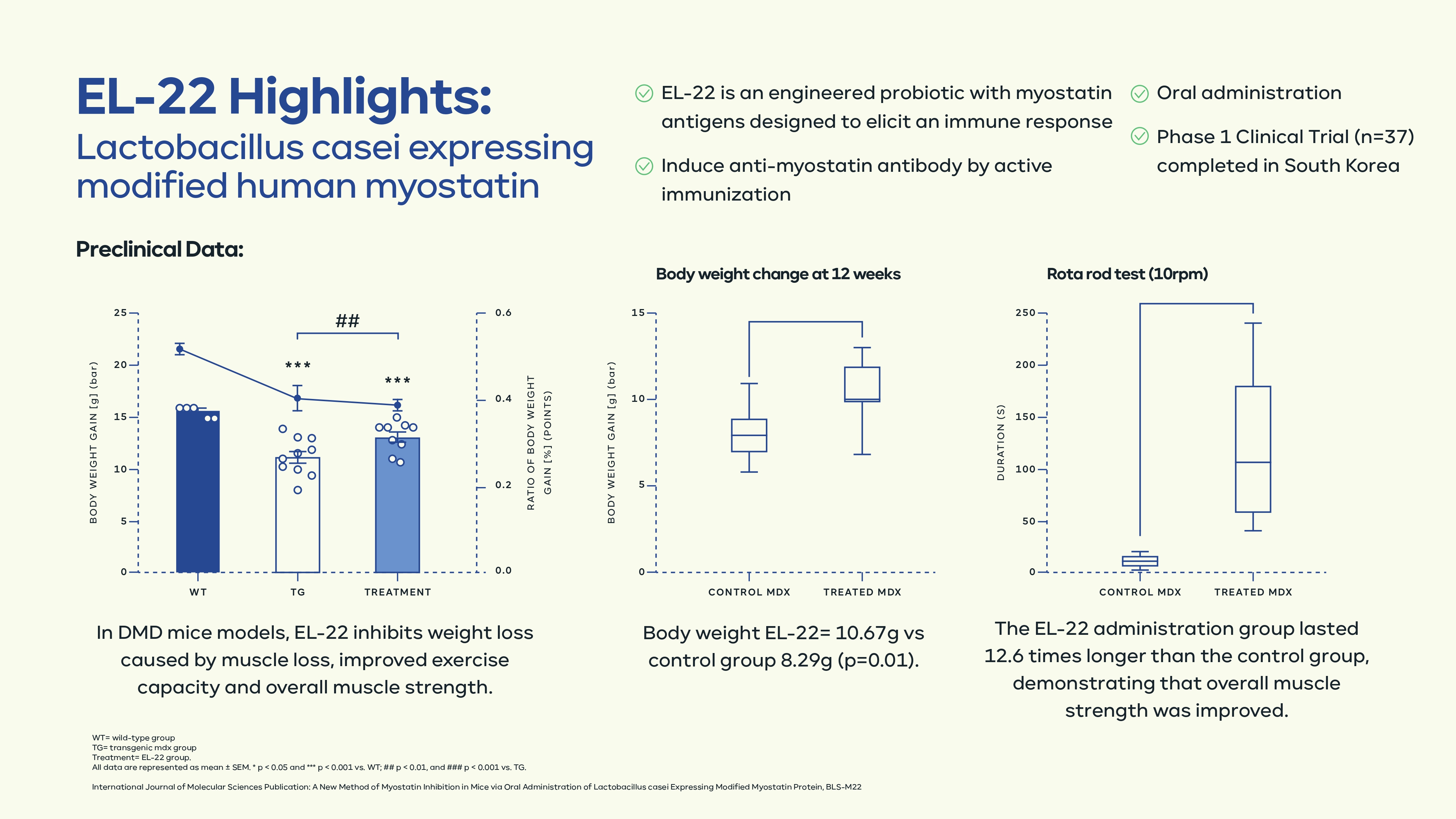 WT= wild - type group TG= transgenic mdx group Treatment= EL - 22 group. All data are represented as mean ц SEM. * p < 0.05 and *** p < 0.001 vs. WT; ## p < 0.01, and ### p < 0.001 vs. TG. International Journal of Molecular Sciences Publication: A New Method of Myostatin Inhibition in Mice via Oral Administration of Lactobacillus casei Expressing Modified Myostatin Protein, BLS - M22 In DMD mice models, EL - 22 inhibits weight loss caused by muscle loss, improved exercise capacity and overall muscle strength. ## 25 0.6 0.4 0.2 0.0 20 15 10 5 0 BODY WEIGHT GAIN [g] (bar) RATIO OF BODY WEIGHT GAIN [%] (POINTS) WT T† TR‡ATM‡NT *** *** 15 10 5 0 BODY WEIGHT GAIN [g] (bar) CŠNTRŠL M‹Œ TR‡AT‡‹ M‹Œ Body weight change at 12 weeks 250 200 150 100 50 0 DURATION (S) Rota rod test (10rpm) Body weight EL - 22= 10.67g vs control group 8.29g (p=0.01). CŠNTRŠL M‹Œ TR‡AT‡‹ M‹Œ The EL - 22 administration group lasted 12.6 times longer than the control group, demonstrating that overall muscle strength was improved. EL - 22 Highlights: Lactobacillus casei expressing modified human myostatin Preclinical Data: Oral administration Phase 1 Clinical Trial (n=37) completed in South Korea EL - 22 is an engineered probiotic with myostatin antigens designed to elicit an immune response Induce anti - myostatin antibody by active immunization