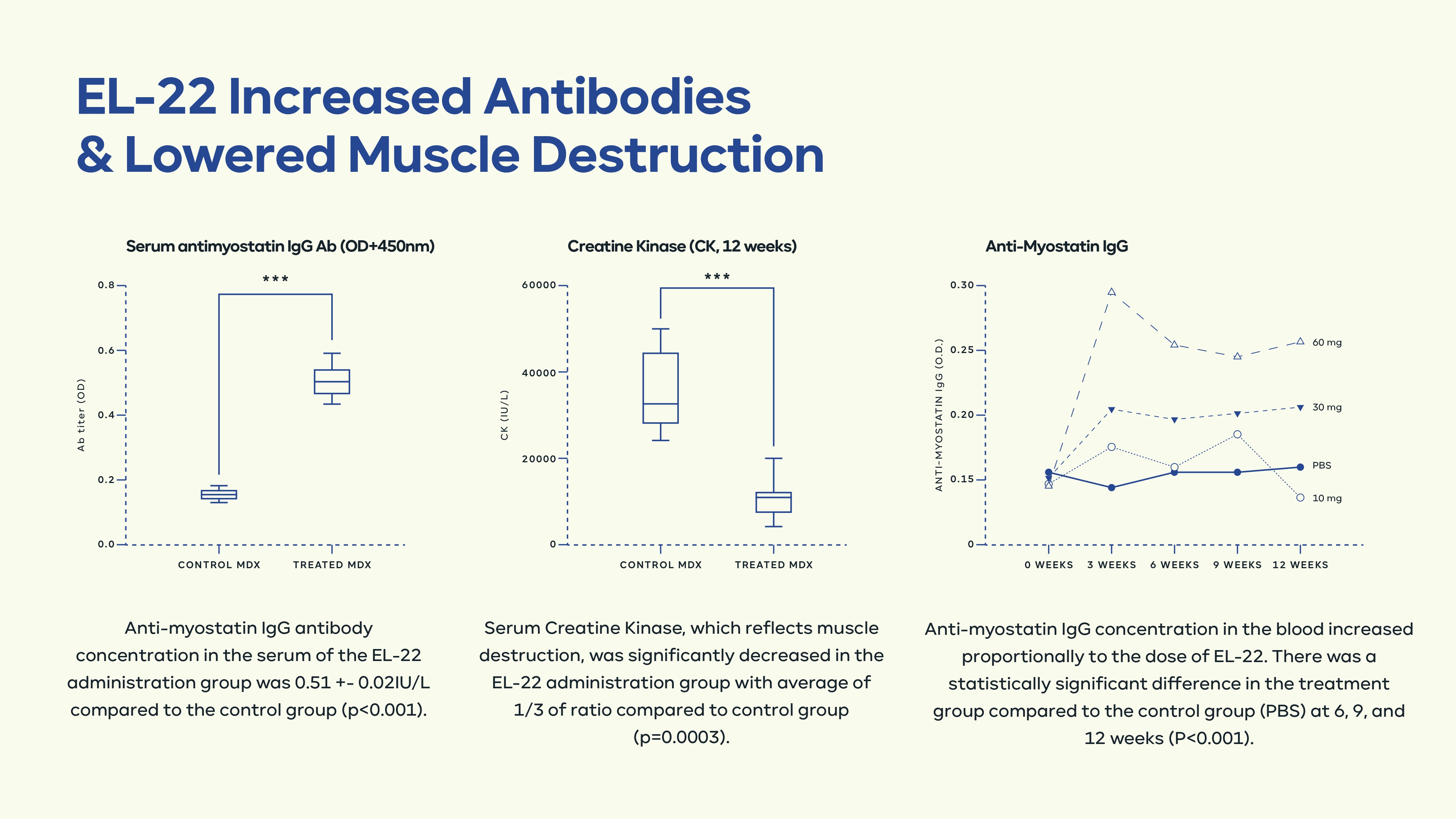 Anti - myostatin IgG antibody concentration in the serum of the EL - 22 administration group was 0.51 + - 0.02IU/L compared to the control group (p<0.001). Serum Creatine Kinase, which reflects muscle destruction, was significantly decreased in the EL - 22 administration group with average of 1/3 of ratio compared to control group (p=0.0003). Anti - myostatin IgG concentration in the blood increased proportionally to the dose of EL - 22. There was a statistically significant difference in the treatment group compared to the control group (PBS) at 6, 9, and 12 weeks (P<0.001). EL - 22 Increased Antibodies & Lowered Muscle Destruction 0.8 0.6 0.4 0.2 0.0 Ab titer (OD) CŠNTRŠL M‹Œ TR‡AT‡‹ M‹Œ Serum antimyostatin IgG Ab (OD+450nm) *** 60000 40000 20000 0 CK (IU/L) CŠNTRŠL M‹Œ TR‡AT‡‹ M‹Œ Creatine Kinase (CK, 12 weeks) *** 0.30 0.25 0.20 0.15 0 ANTI - MYOSTATIN IgG (O.D.) 0 W‡‡‘S 3 W‡‡‘S 6 W‡‡‘S 9 W‡‡‘S 12 W‡‡‘S Anti - Myostatin IgG PBS 10 mg 30 mg 60 mg