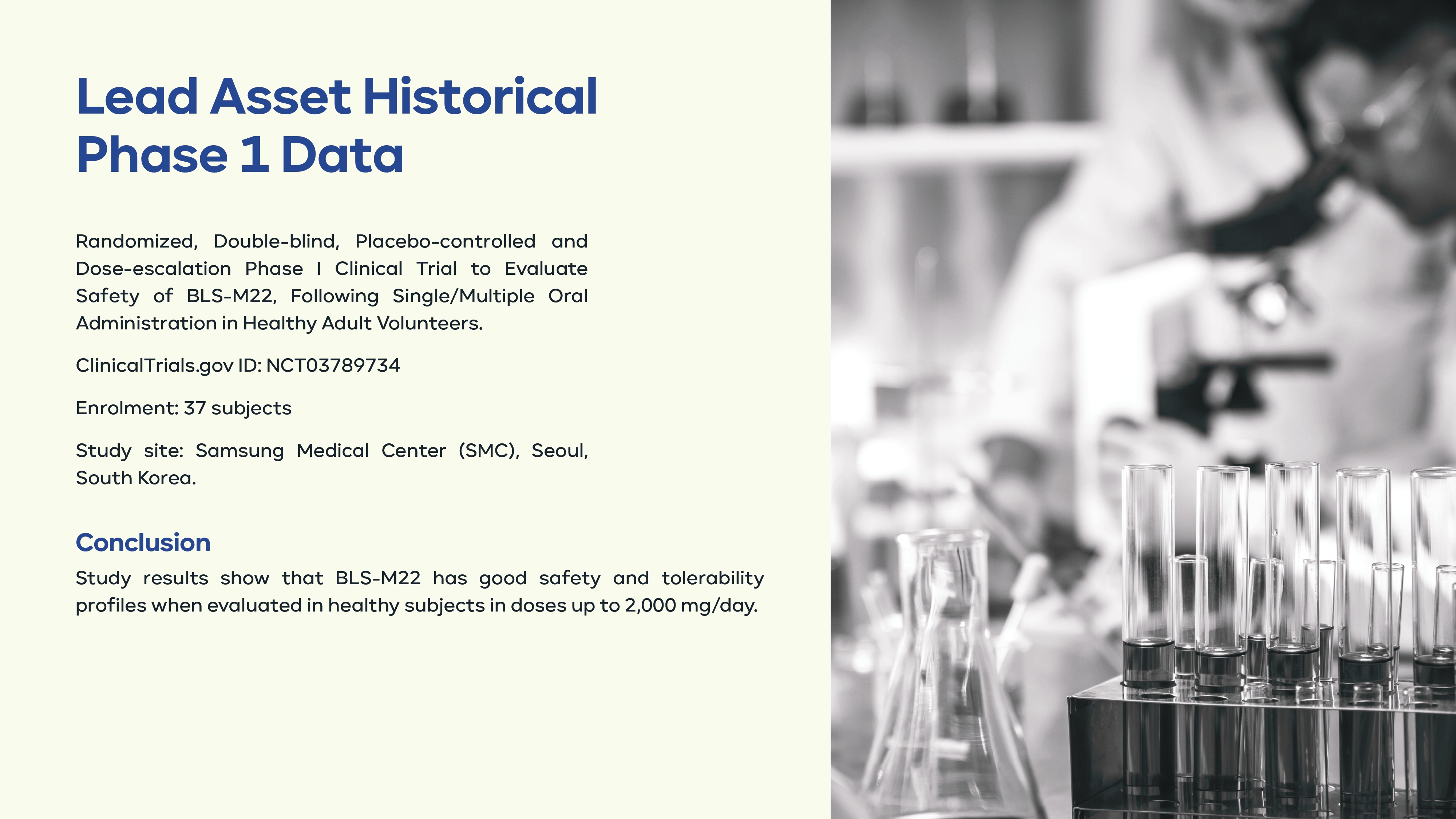 Lead Asset Historical Phase 1 Data Randomized, Double - blind, Placebo - controlled and Dose - escalation Phase I Clinical Trial to Evaluate Safety of BLS - M 22 , Following Single/Multiple Oral Administration in Healthy Adult Volunteers . ClinicalTrials.gov ID: NCT03789734 Enrolment: 37 subjects Study site: Samsung Medical Center (SMC), Seoul, South Korea. Conclusion Study results show that BLS - M22 has good safety and tolerability profiles when evaluated in healthy subjects in doses up to 2,000 mg/day.