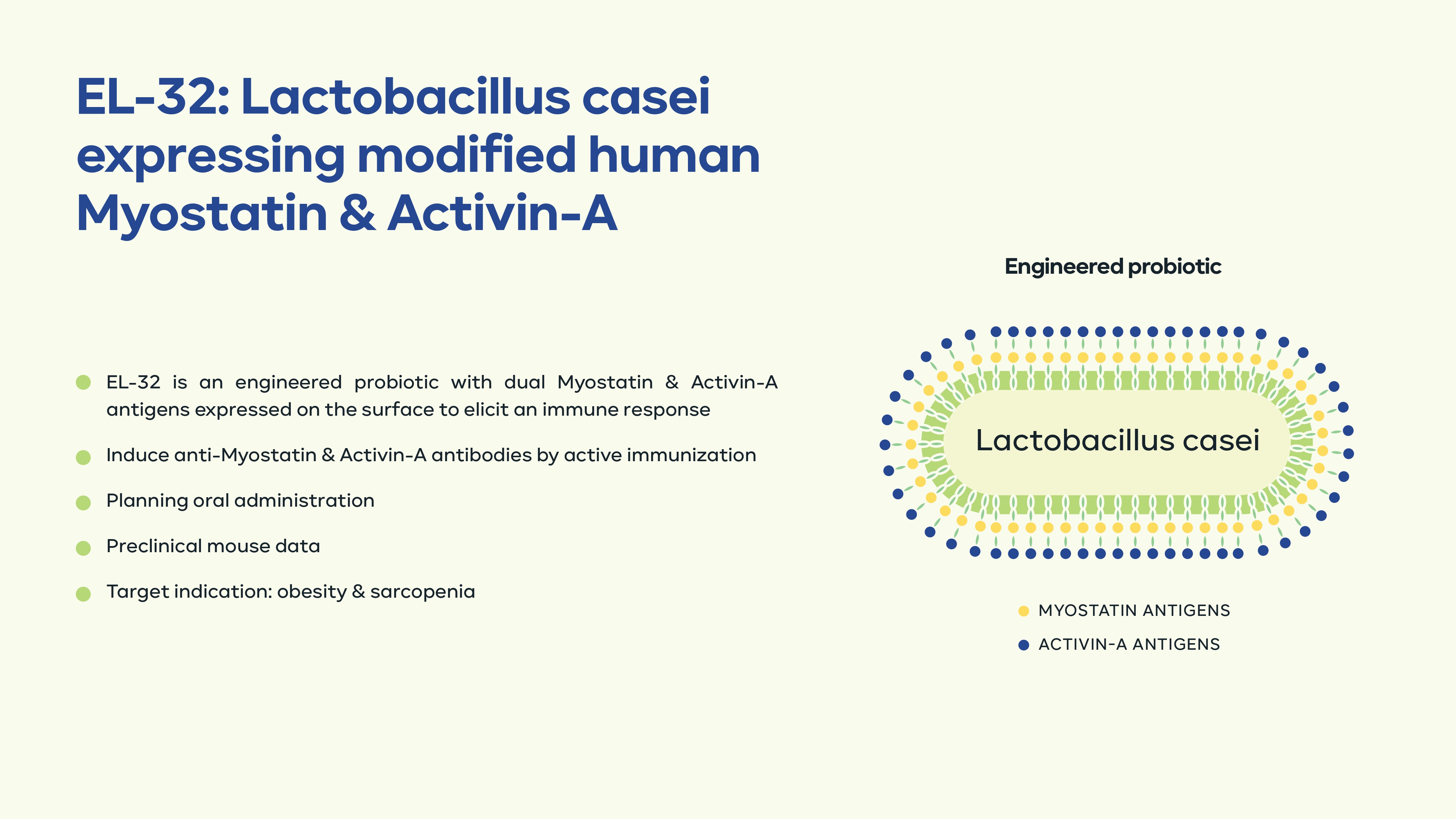 EL - 32 is an engineered probiotic with dual Myostatin & Activin - A antigens expressed on the surface to elicit an immune response Induce anti - Myostatin & Activin - A antibodies by active immunization Planning oral administration Preclinical mouse data Target indication: obesity & sarcopenia EL - 32: Lactobacillus casei expressing modified human Myostatin & Activin - A Engineered probiotic Lactobacillus casei MYOSTATIN ANTIGENS ACTIVIN - A ANTIGENS