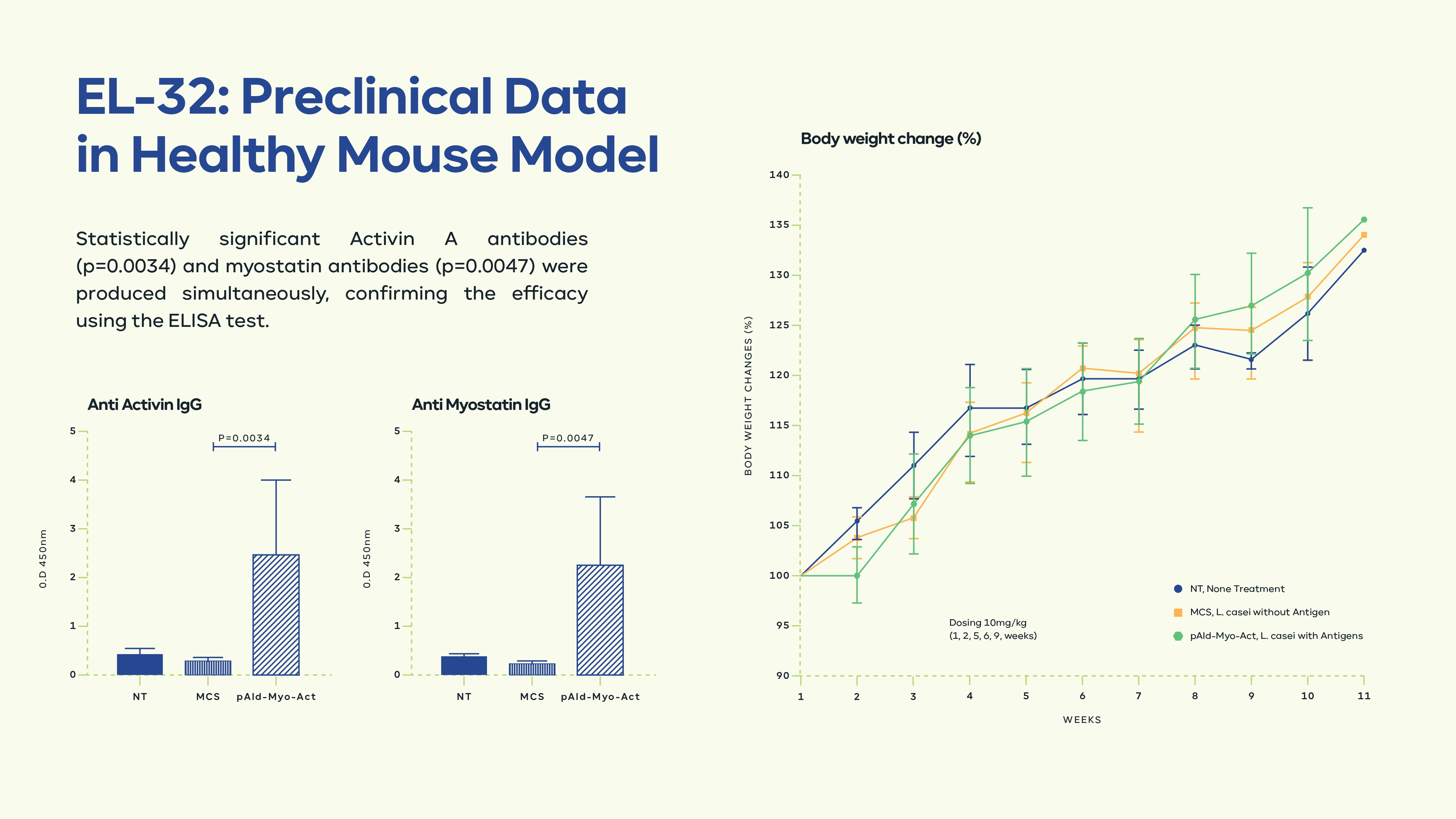 Statistically significant Activin A antibodies (p= 0 . 0034 ) and myostatin antibodies (p= 0 . 0047 ) were produced simultaneously, confirming the efficacy using the ELISA test . EL - 32: Preclinical Data in Healthy Mouse Model 5 4 3 2 1 0 0.D 450nm P=0.0034 NT MCS pAld - Myo - Act Anti Activin IgG 5 4 3 2 1 0 0.D 450nm BODY WEIGHT CHANGES (%) WEEKS P=0.0047 NT 1 2 3 4 5 6 • 8 9 10 11 MCS pAld - Myo - Act Dosing 10mg/kg (1, 2, 5, 6, 9, weeks) Anti Myostatin IgG Body weight change (%) 140 135 130 125 120 115 110 105 100 95 90 NT, None Treatment MCS, L. casei without Antigen pAId - Myo - Act, L. casei with Antigens