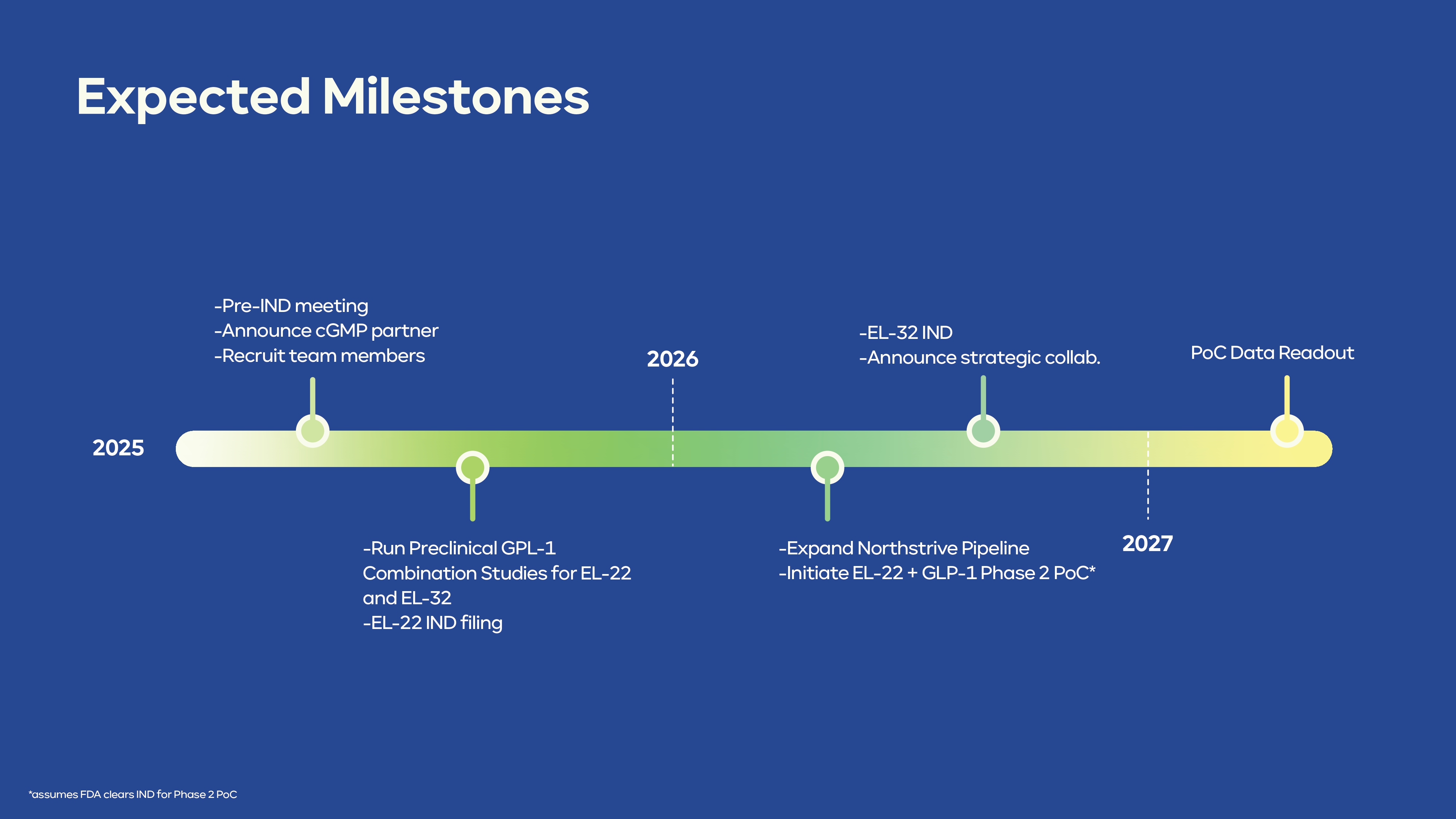 Expected Milestones 2025 - Pre - IND meeting - Announce cGMP partner - Recruit team members 2026 - EL - 32 IND - Announce strategic collab. PoC Data Readout - Run Preclinical GPL - 1 Combination Studies for EL - 22 and EL - 32 - EL - 22 IND filing - Expand Northstrive Pipeline - Initiate EL - 22 + GLP - 1 Phase 2 PoC* 2027 *assumes FDA clears IND for Phase 2 PoC