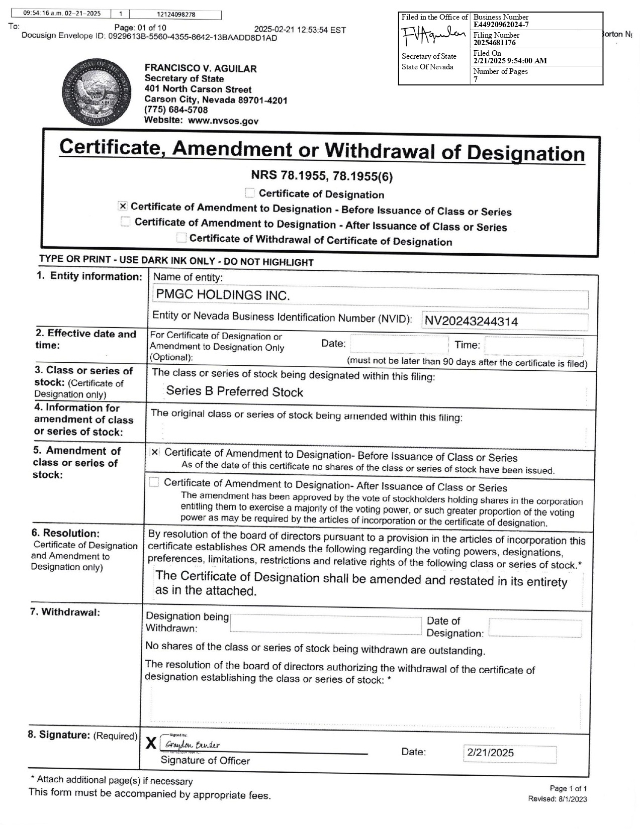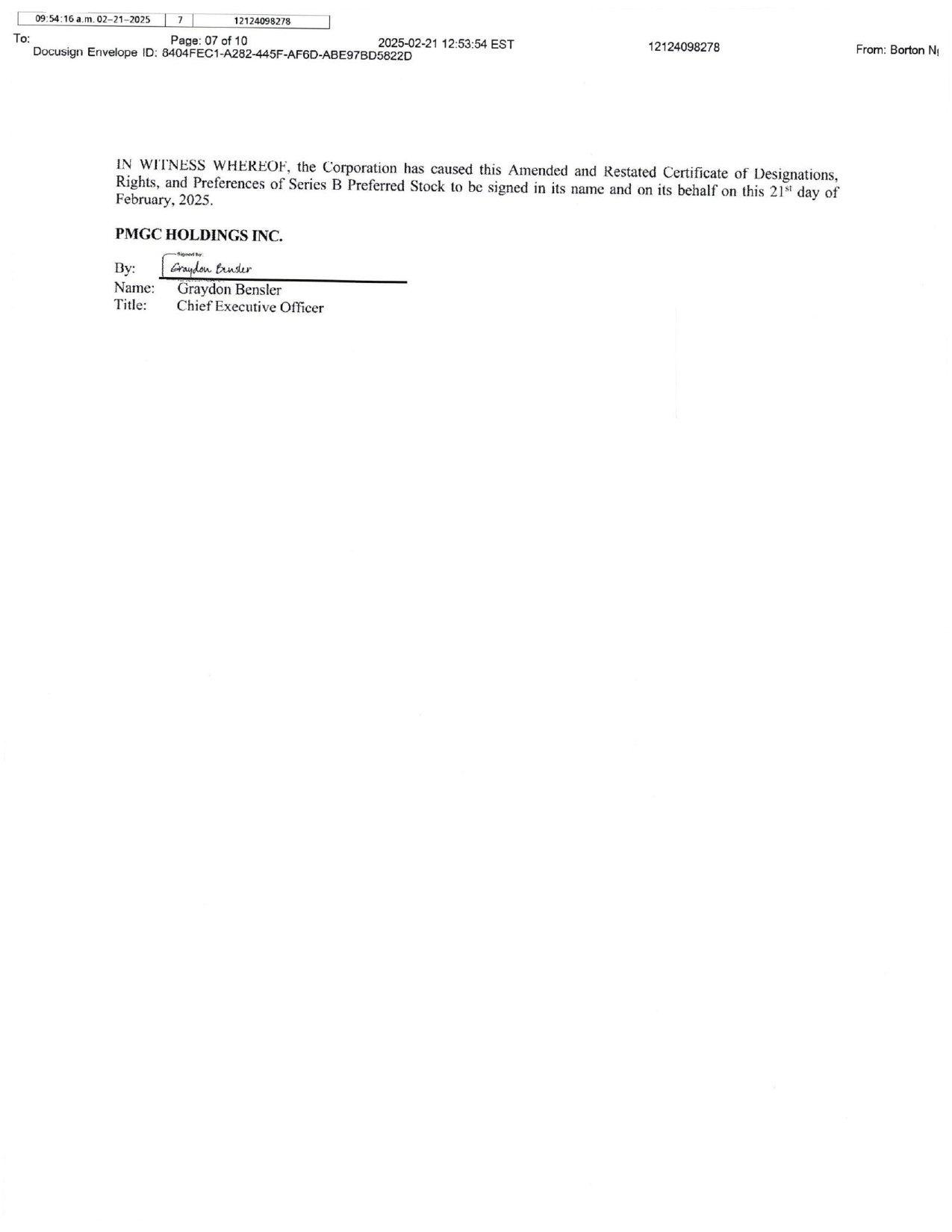 To: Page: 07 of 10 2025 - 02 - 21 12:53 54 EST DocusigtJ Envelope IO. &404 FCC1 - A28Z - 445F - AF6O - ABE97BO5822O 12124098278 1 N Wl' I NLSS W t 4 kttiiok, the Corporation has caused this Amended and Ftestated Certificate of Desit,nations . Rights, and Preferences rif Series B Preferred Stock to be . signed in its name and on its behalf on this 21 “ day of February, 2025 . PMGC HOLDINGS INC . Name: Title: firaydon Bcnsler Chief E'xeciiti e Ol‘ficet From: Borton N