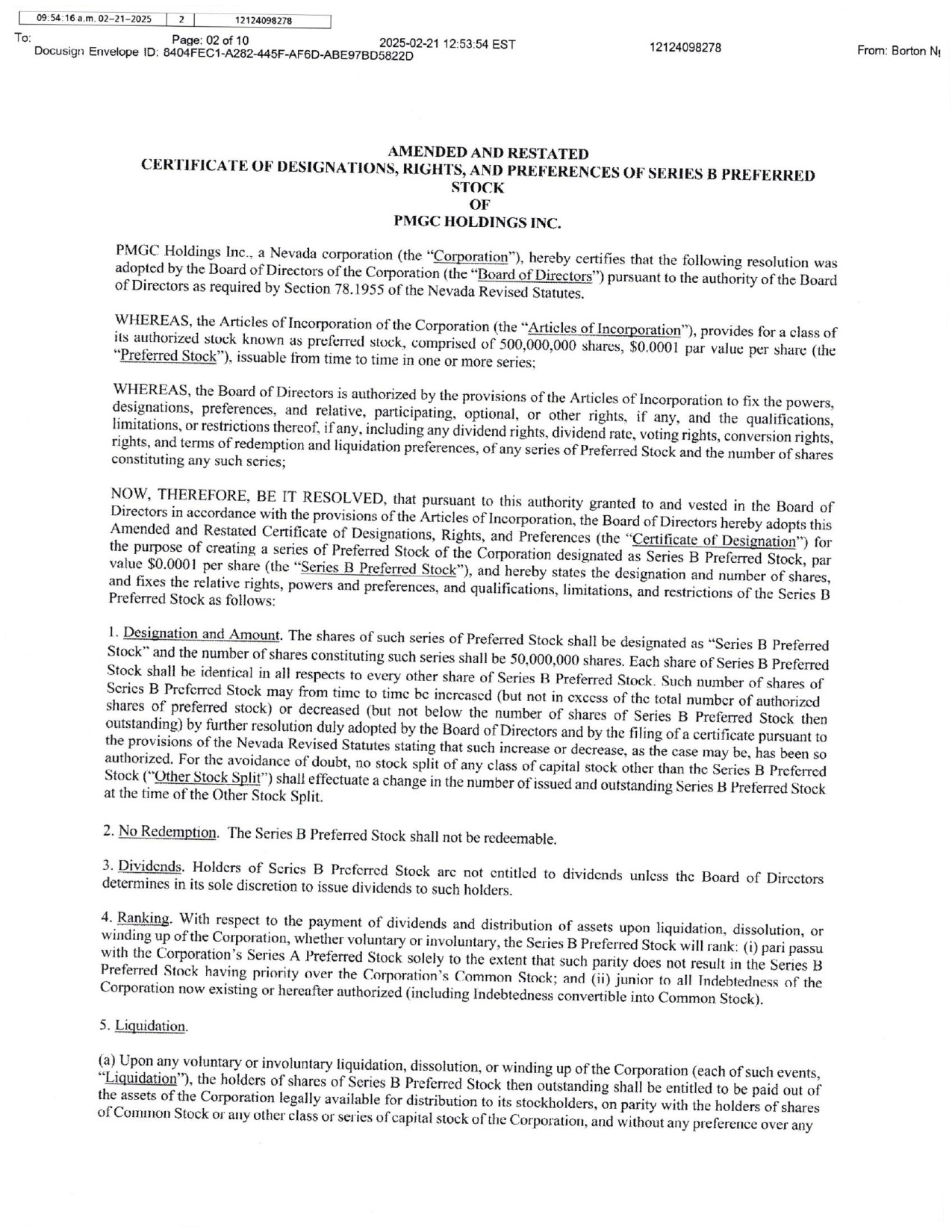 121240•ig 278 To: Pan•: 02 of 10 2025 - 02 - 21 12 - 53 - 54 EST Docusign Envelope ID. 8404FEC1 - A2B2 - 445F - AF6D - ABE97BD5822O 12124098278 AMENDED AND RESTATED CER@fi1CA’£E CH' LtESIGNA I’1ONS, RIGHT S, AND PREI kRENCES OI SMHiES B PREFERRED PMGC HOLDINGS INC. PM Ci C Holdings Inc . , a Nevatta corporation (the “C orporation ”), hereby certifies that the following rcs'ol rrtion was adopted by the Doard or oirectors of the Corporation (the “B oard of Directors ”) pursuant to the authority of the Doard of Directors as required by Section 75 . 1955 of the Nevada Revised Statutes . WHEREAS, the Articles of Incorporation of the Corporation (the “A rticles of Incorporation "), provides for a class of its authorized siock known as prefvrrA siock, comprised of 500 , 000 , 000 shares, $ 0 . 0001 par value per share (the “P referred Stock ”), issuable tiom time to time in one or more series : WHEREAS, the Bonrd of Directors is authorized by the provisions of the Articles of Incorporation to fix time powers, designations, preferences . and relative . participating, optional, or other rights, if any, and the qualifications, limitations . or restrictions thcrcof, if any, including any dividend rights, dividend rate, voting rights, conversion rights, rights, and terms of redemption and liquidation preferences, of any series of Preferred Stock and the number of shares constituting any such series ; NOW, THEREF - ORE, BE lT RESOLVED, that pursuant to this authority granted to and vested in the Board of Directors in accordance with the provisions of the Articles of Incorporation, the Board of Directors hereby adopts this Amended and Restated Certificate of Designations, Rights, and Prefcrcnces (the “C erii ticate of Designation ”) for the purpose of creating a series of Preferred Stock of the Corporation designated as Series B Preferred Stock, par value $ 0 . 0001 per share (the “S eries B Preferred Stock ”), and hereby states the designation and number of shares, and fixes the relative rights, powers and preferences, and qualifications, limitations, and restrictions of the Series D Preferred Stock as follows : 1. Designation and Amount. The shares of such series of Preferred Stock shall be designated as “Series B Preferred Stock” and the number of shares constituting such series shall be 50,000,000 shares. Each share of Series B Preferred Stock shall be identical in oll respects to every other sharr of Series R Preferred Stock. Such number of shares of Series B Prcfcrrcd Stock may from time to time be incrcascd (but not in excess of the total number of authorized shares of preferred stock) or decreased (but not below the number of shares of Series B Preferred Stock then outstanding) by further resolution duly adopted by the Board of Directors and by the fi I ing of a certificate pursuant to the provisions of the Nevada Revised Statutes stating that such increase or decrease, as the case may be, has been so authorized. Por the avoidance of' doubt, no stock split of any class of capital stock other than the Series B Preferred Stock (“C ltber Stock Split ”) shall etTectuate a change in the number ot issued and outstanding Series B t'relerred Stock at the time of the Other Stock Split. 2. No Redemption. The Series B Fretérred Stock shall not be redeemable. 3. Dividends. Holders of Series B Preferred Stock ate not entitled to dividends u alcss the Bonrd of Directors determines in its sold di sc ction to issue dividends to such holders. 4. Ranking . With respect to the payment of dividends and distribution of assets upon liquidation, dissolution, or winduig up of the Corporation, whether voluntary or involuntary, the Series B Preferred Stock will rank : (i) pai i passu with the C?orporation’s Series A Preferred Stock solcly to the extent that such panty does not result in the Series H Preferred Stock having priority over the Corporation’s Common Stock ; arid (ii) junior to all I ndebtedness of the Corporation now enisting or hereafter authorized (including Indebtedness convertible into Common Stock) . S . Liquidation . (a) Upon any voluntary or involuntary liquidation, dissolution, or winding up of the Corporation (each Of such evelJtS, “ Liquidation ”) . the holders of shares of Series B Preferred Steck then outstanding shall be entitled to be paid out of the assets of the Corporation legally available for distribution to its stockholders, on parity with the holders of shares of Coiuiiioo Stock or' any other class or series of capital stock of the Corporation, arid without any preference over any From: Barton N